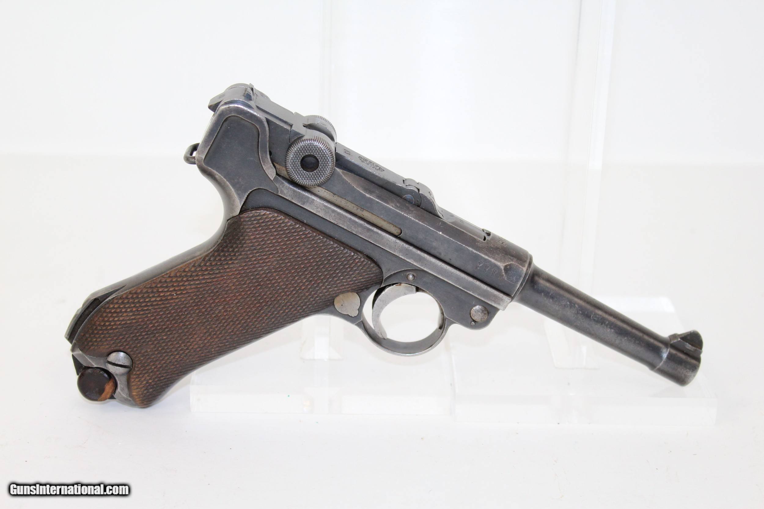 Description: WWI “1918” Dated German LUGER P.08 Pistol by DWM With “1916” Dated Franz Herrmann Holster Here we present a World War I German Luger P.08 Pistol, made in 1918 by DWM in Berlin, Germany. Basing his design off Hugo Borchardt’s seminal C93, Georg Luger successfully brought Borchardt’s work to practical fruition. While finding buyers for the C93 seemed an exercise in futility, the new Luger Pistol found many countries eager to test it and even adopt it. There are many variations in this field of collecting, but relatively few major changes in overall design from beginning to end. The Luger is certainly one of the most iconic firearms in history, made so by its association with Germany during both World Wars. This Luger P.08 Pistol is dated “1918”, the year it was made. Imperial German military proof and acceptance marks are located on the right side of the chamber. The DWM monogram is prominent on the top of the toggle. This pistol comes in an original German military flap holster of heavy leather. It is marked “FRANZ HERRMANN/-ERFURT-/1916” on the inside of the flap. The holster is rigged for a shoulder mount. The overall condition is good. The steel surfaces have light weathering. The blue finish is about 90%. Straw colors are still present. The markings are clear. The serial numbers match with the exception of the magazine. Base of the magazine is chipped. The grips are in great shape. The bore is in good shape with well-defined rifling. The action is excellent. The holster is near fine. Here is a very nice example of a Luger Pistol from the Great War! This firearm is classified as a Curio & Relic. Barrel is 4 inches. Caliber: 9x19mm Luger Overall condition as seen in photos. Very Fast. Very Safe. FREE SHIPPING. Will need to be sent to your local FFL or C&R licensee. This firearm is classified as a Curio & Relic. Guaranteed AUTHENTIC & Includes CERTIFICATE OF AUTHENTICITY. ancestryguns $2675 #6597 SOLD Curio/Relic: Yes |