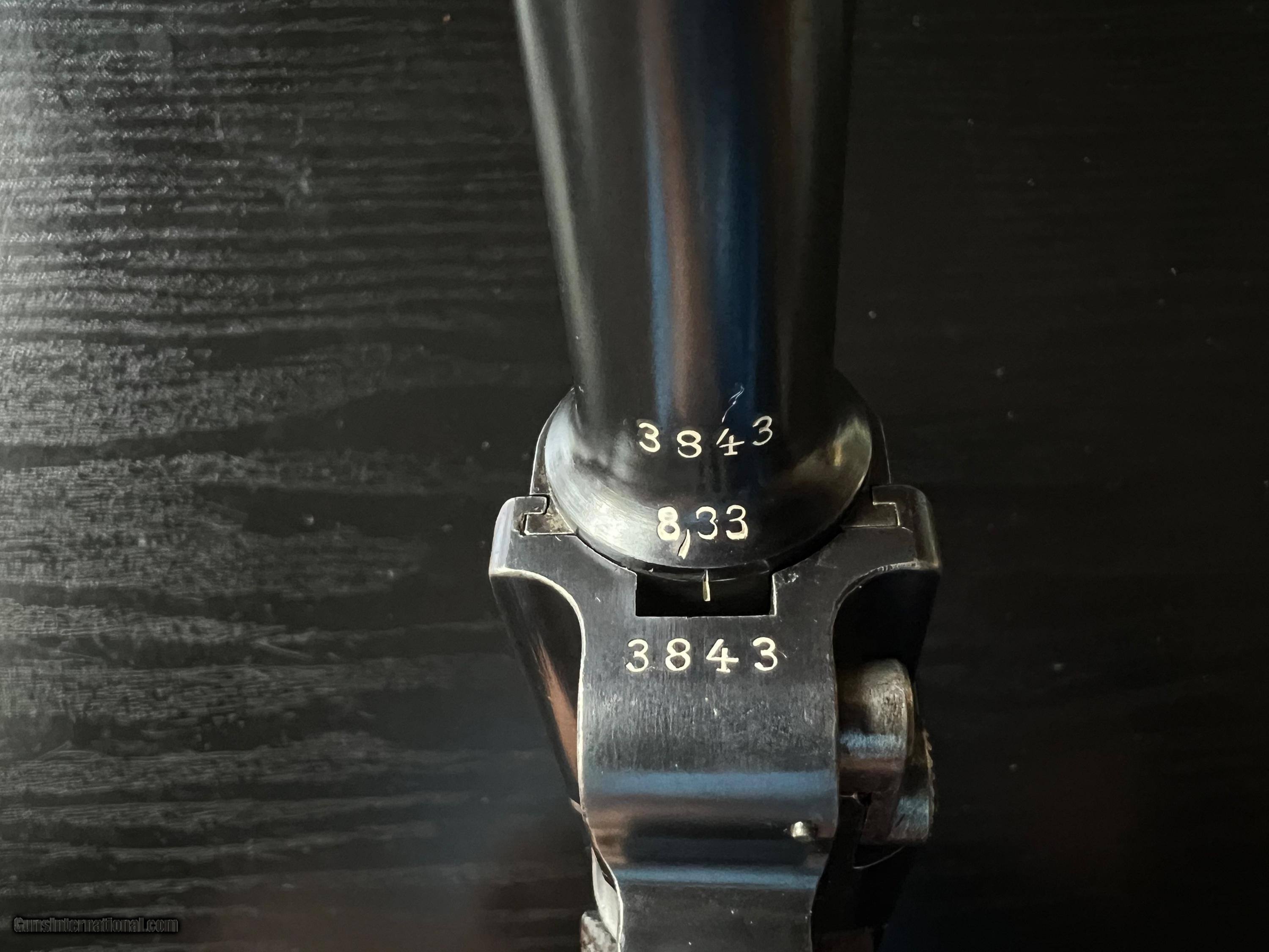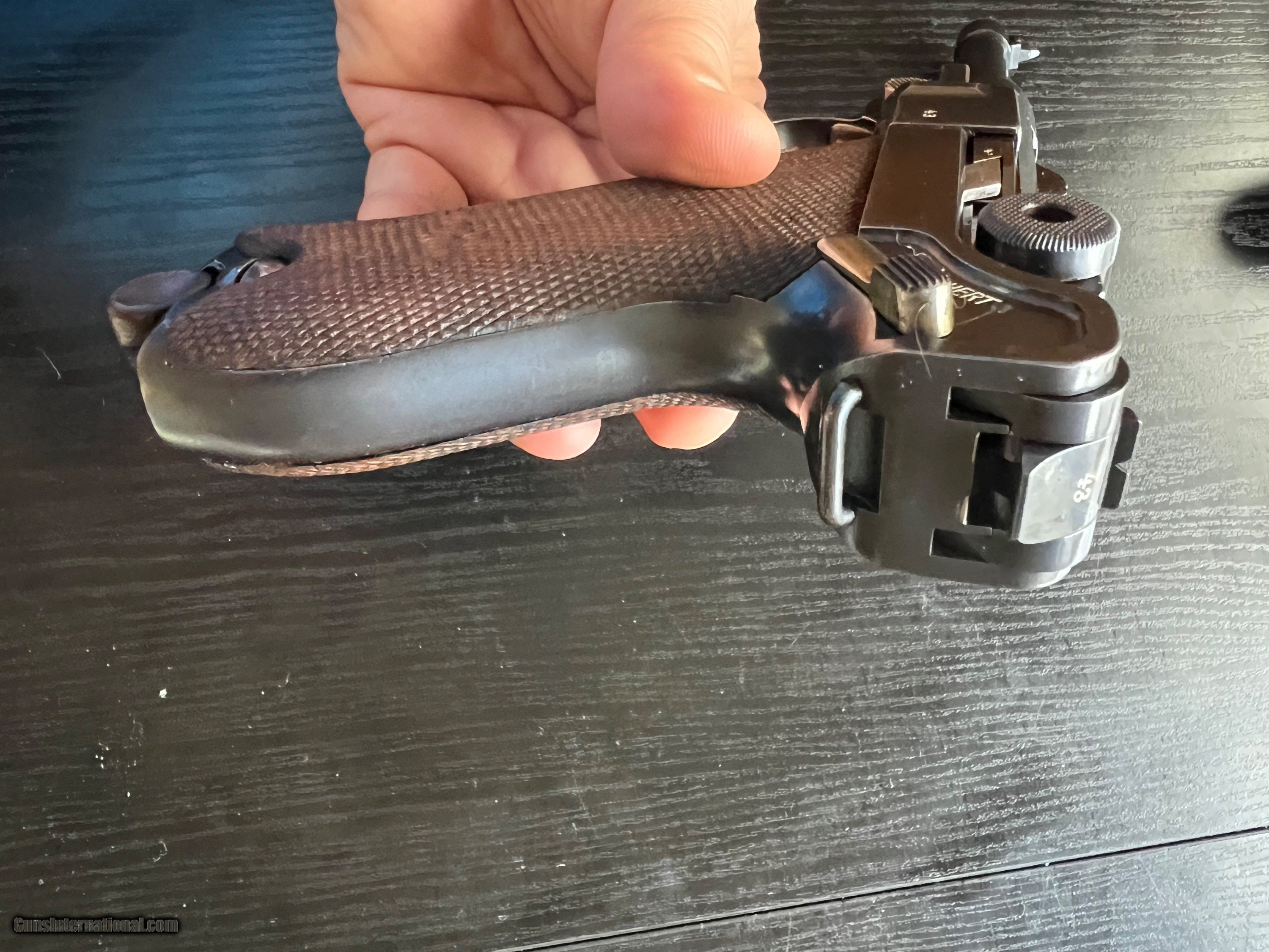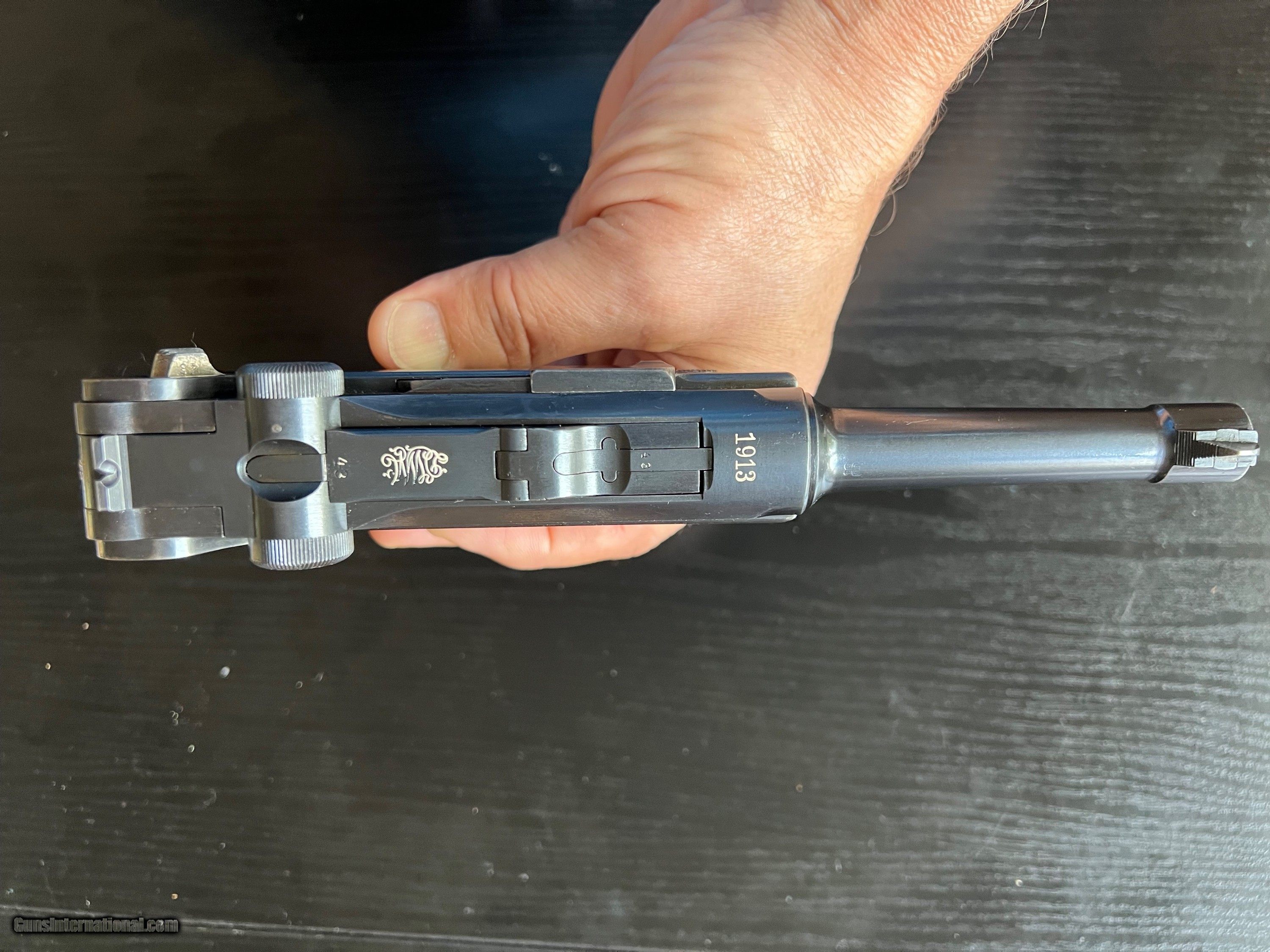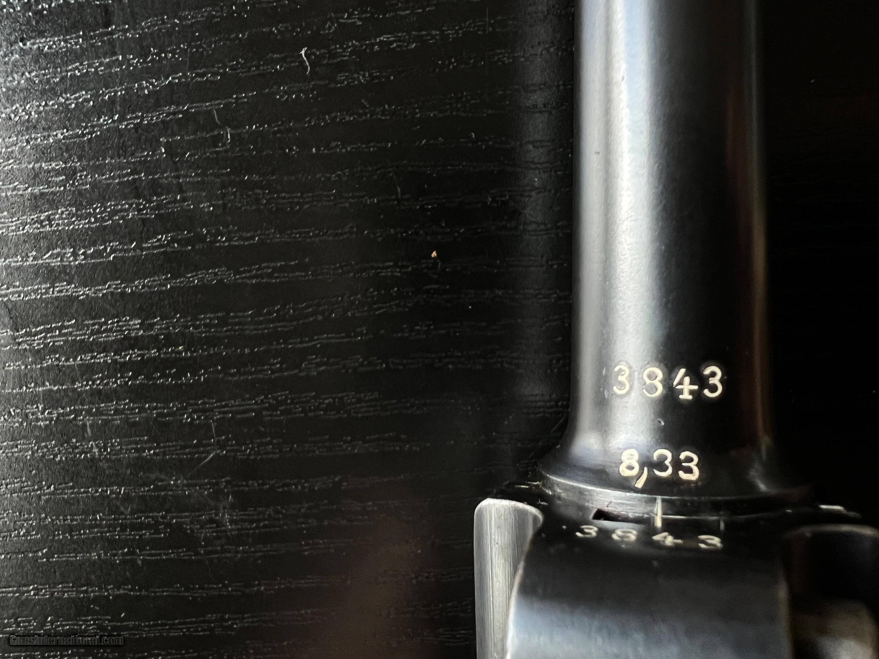 Description: This is an excellent condition early DWM German military Luger, made right before WWI, in 1913, and chambered in 9mm Para. The gun is a vet bring back and is a complete set that includes a beautiful 1915 dated holster, a spare magazine and a disassembly tool. The gun retains about 98% of its early DWM blue, with only a hint of high edge wear on the muzzle, and the edges of the rails with a couple of tiny freckles here and there. There is no pitting. The grip straps exhibit almost perfect blueing. All the markings and the imperial proof marks are sharp. The bore is excellent. The grips are in very good shape with a couple of small indentations on the left grip. The gun is all matching except for both correct WWII era magazines. The holster is a rare maker - "Mars, Berlin", marked and dated 1915 under the flap. It is in excellent condition as well with light field wear and no other defects. Original unmarked DWM disassembly tool is present as well. This must be one of the best conditioned 1913 dated pre-WWI Lugers with no stock lug out there. 3-days inspection . FFL or C&R(where legal). $60 shipping in CONUS. SOLD Curio/Relic: Yes Handgun Caliber: 9x19mm Parabellum (9mm Luger, 9x19mm NATO) |