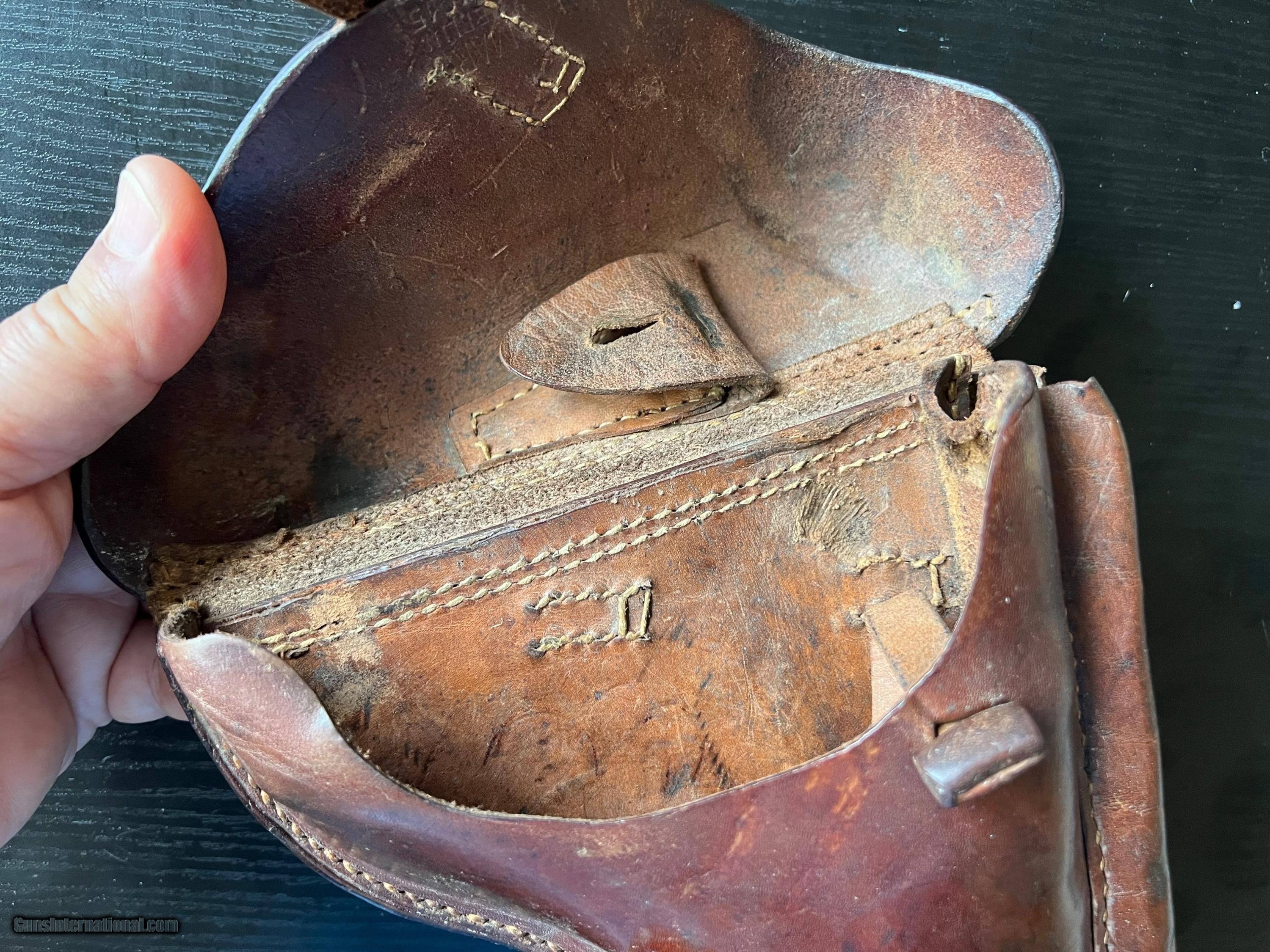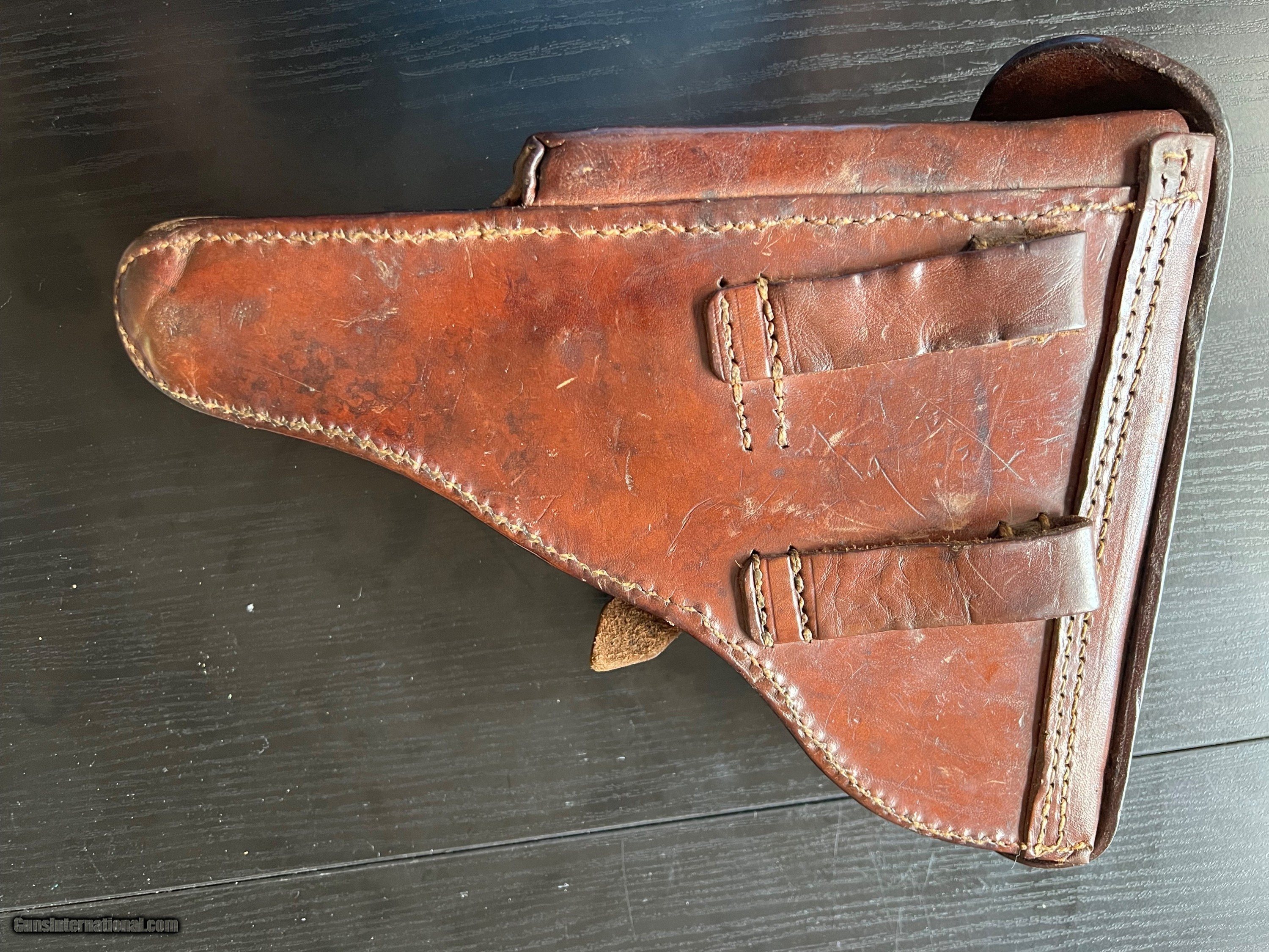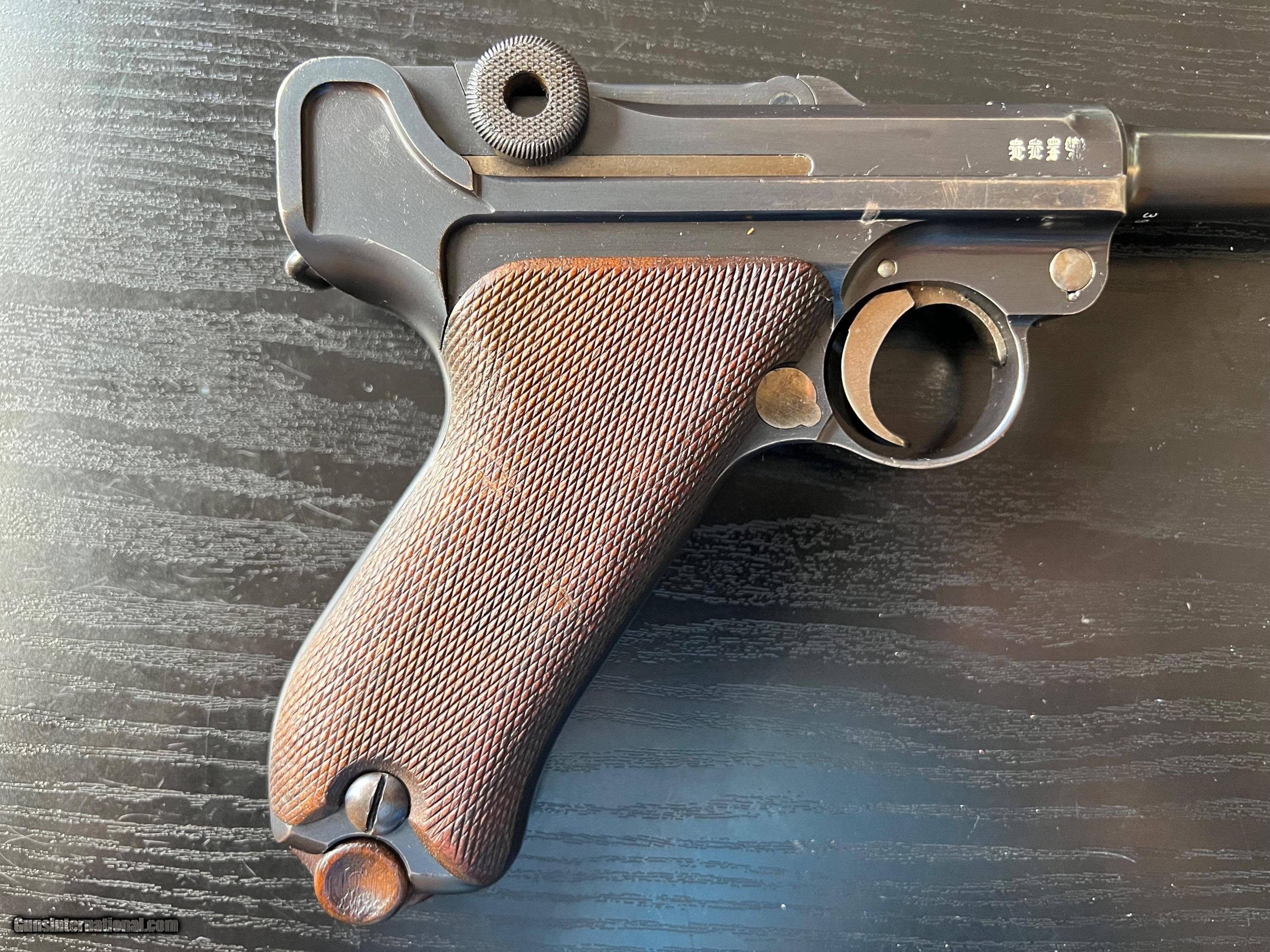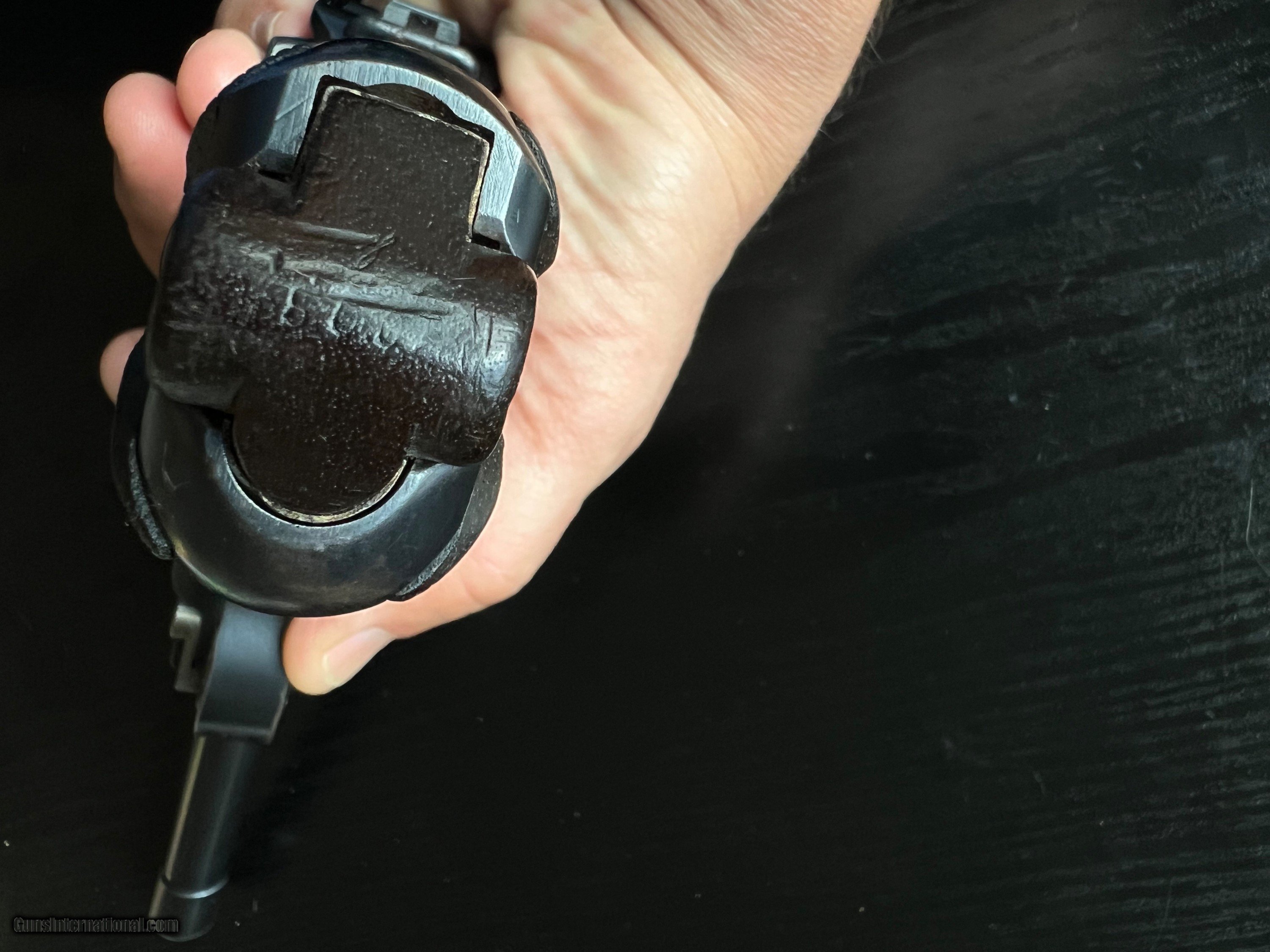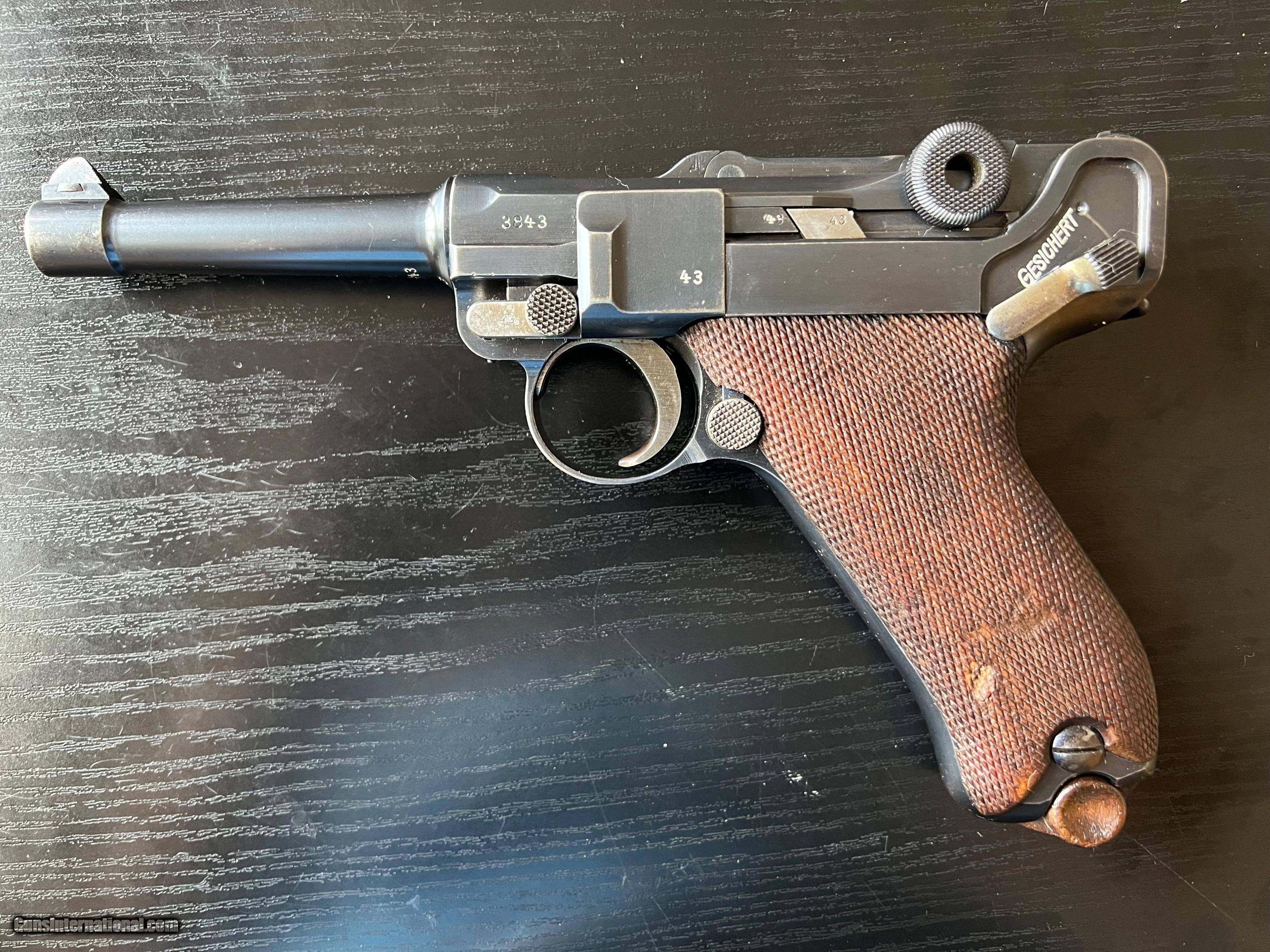 Description: This is an excellent condition early DWM German military Luger, made right before WWI, in 1913, and chambered in 9mm Para. The gun is a vet bring back and is a complete set that includes a beautiful 1915 dated holster, a spare magazine and a disassembly tool. The gun retains about 98% of its early DWM blue, with only a hint of high edge wear on the muzzle, and the edges of the rails with a couple of tiny freckles here and there. There is no pitting. The grip straps exhibit almost perfect blueing. All the markings and the imperial proof marks are sharp. The bore is excellent. The grips are in very good shape with a couple of small indentations on the left grip. The gun is all matching except for both correct WWII era magazines. The holster is a rare maker - "Mars, Berlin", marked and dated 1915 under the flap. It is in excellent condition as well with light field wear and no other defects. Original unmarked DWM disassembly tool is present as well. This must be one of the best conditioned 1913 dated pre-WWI Lugers with no stock lug out there. 3-days inspection . FFL or C&R(where legal). $60 shipping in CONUS. SOLD Curio/Relic: Yes Handgun Caliber: 9x19mm Parabellum (9mm Luger, 9x19mm NATO) |