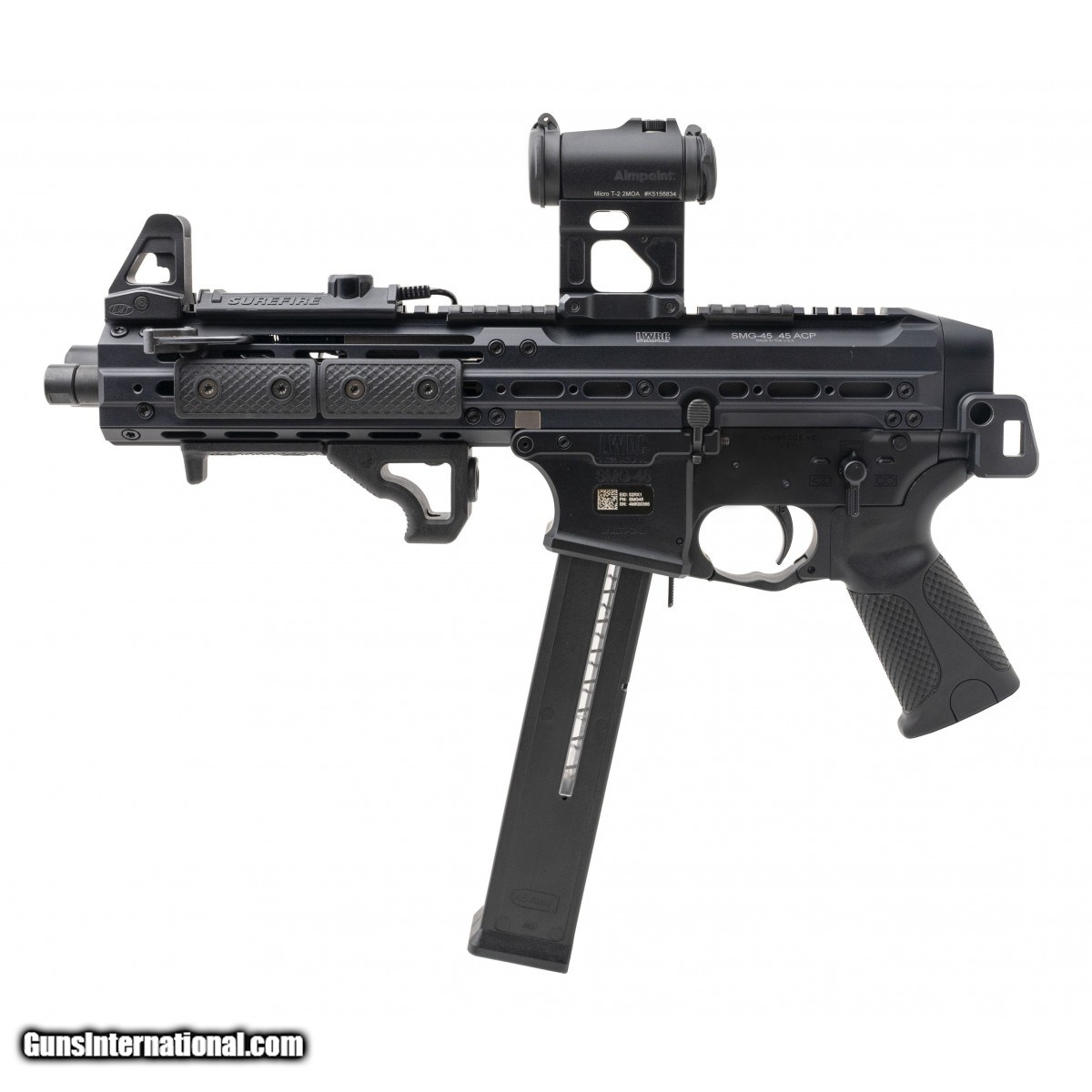 SN:4MK00366. Modern production. .45 ACP with a 8"" threaded barrel. Bore is in excellent condition. Semi-auto SMG. Finish and grips are in excellent condition. Pistol comes with Surefire X300 Turbo, Sure fire light switch, Aimpoint Micro T-2 2MOA red dot and angled foregrip. Overall condition is excellent. Comes with box, 2 Extra magazine and sling.
