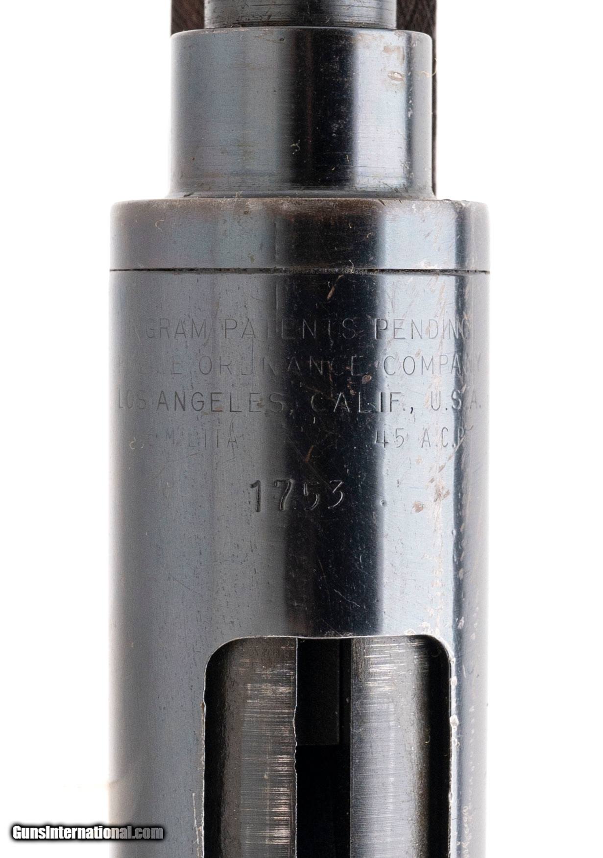 Description: "SN: 1753. Made in 1950 with a 9-inch barrel chambered for the .45 ACP cartridge. Designed by Gordon B. Ingram & manufactured by the Police Ordnance Company, this transferable M6 remains in excellent condition overall with a bright bore & original factory finish across the metal parts. The number “1753" is electro-penciled onto the bolt & the number “16049" is stamped into the right side of the buttstock. Comes with one original 30-round magazine. Price: $18,000.00 Contact Seller |