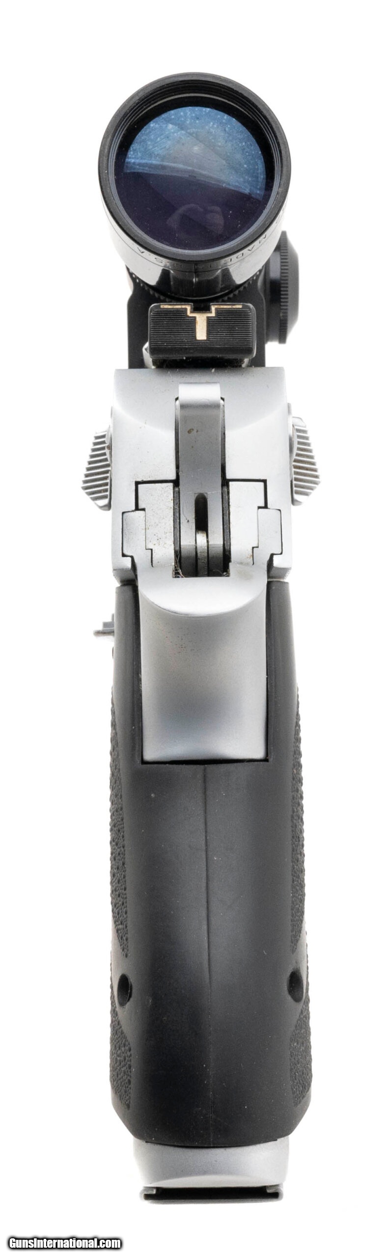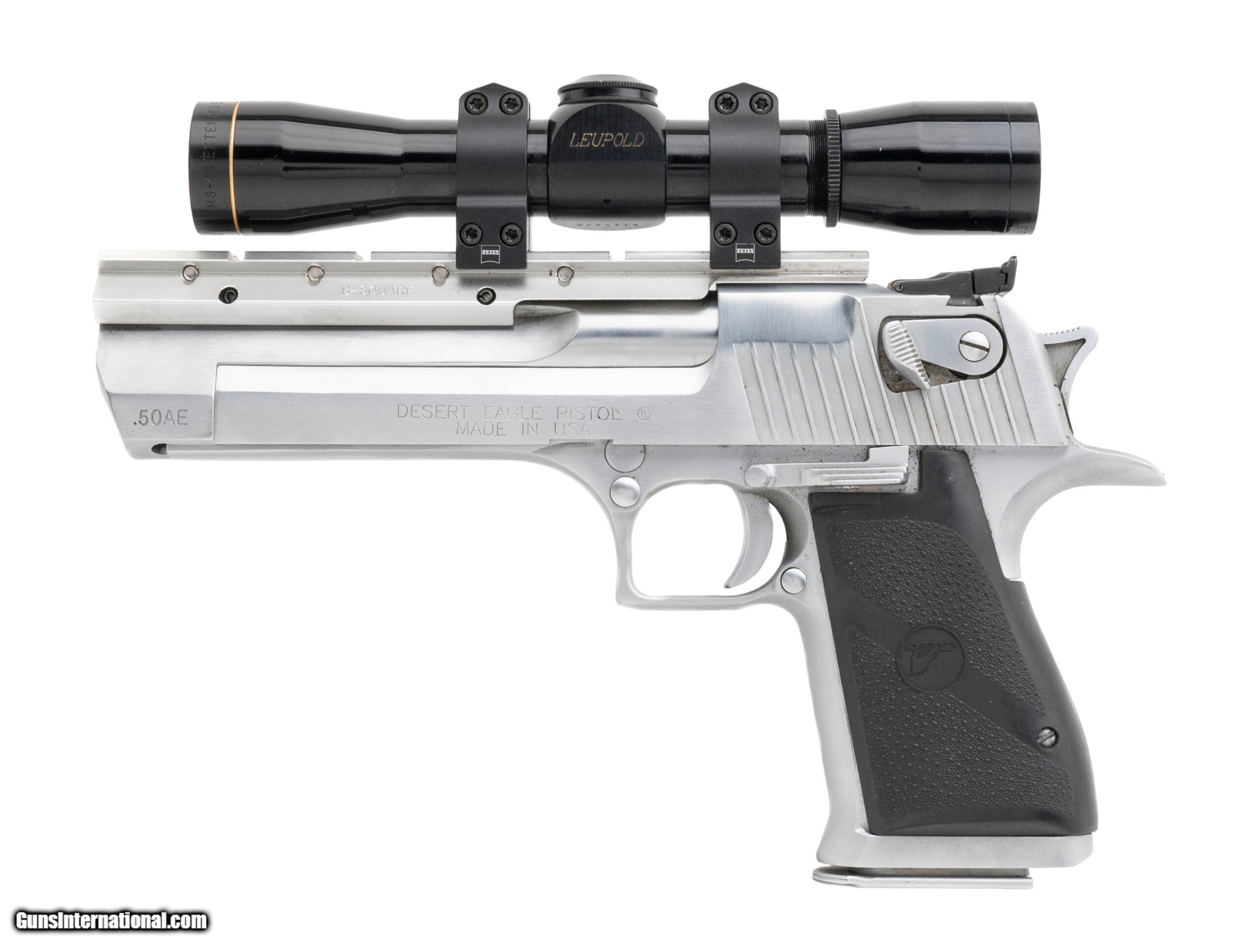 Description: "SN:MR000309. Modern production. 50AE with a 6"" barrel. Bore is in excellent condition. Full size magnum handgun. Finish and grips are in very good condition. Pistol has Leupold m8-4x scope and extra 44 magnum barrel. Overall condition is very good. Comes with case. SOLD |