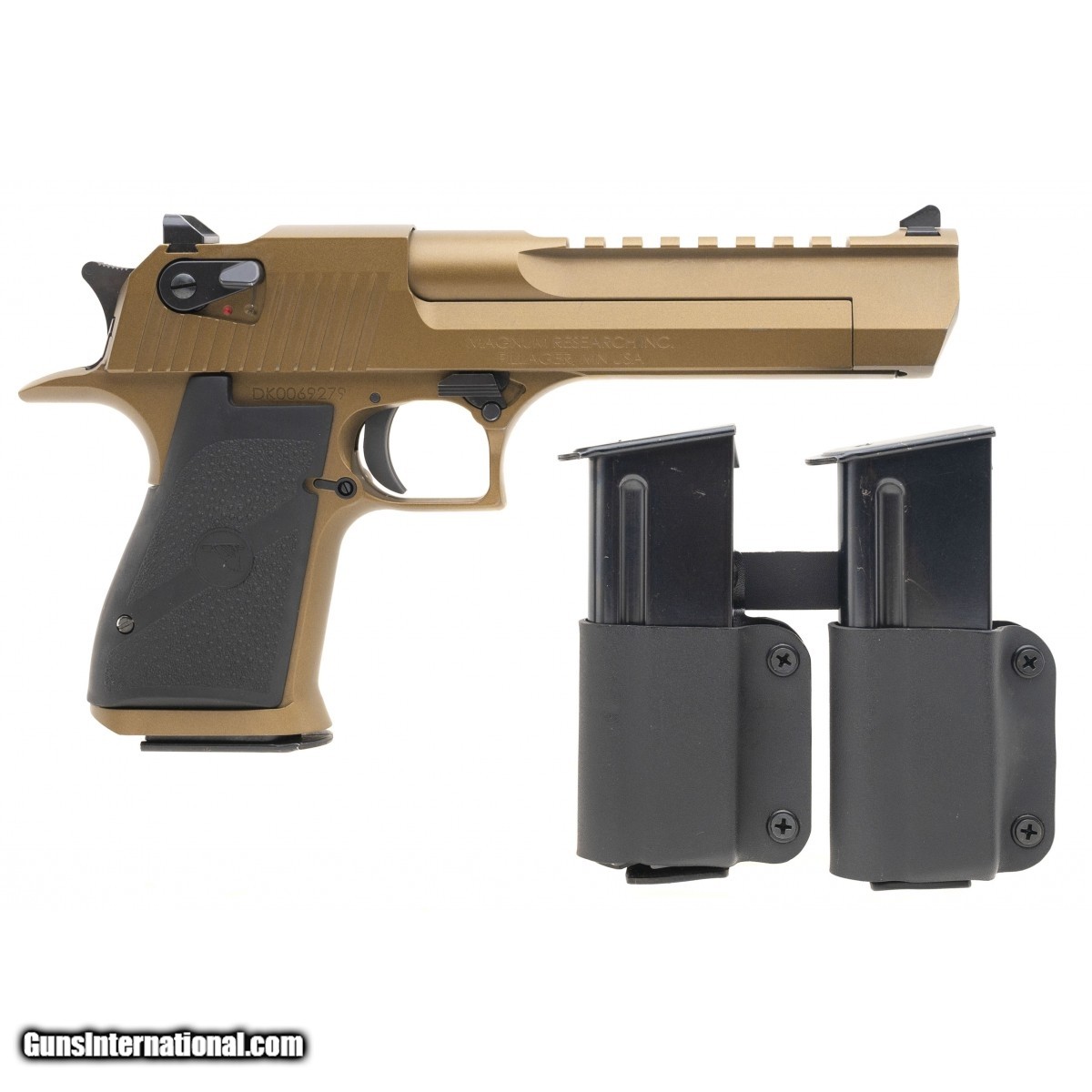 SN: DK0069279. Modern production. .50 AE with a 6"" barrel. Bore is very good. Steel frame Desert eagle. Burnt bronze finish is excellent condition. Soft rubber grips are in near perfect condition. Pistol has picatinny rail on top for mounting optics, comes with two extra magazines and a mag carrier. Overall condition is excellent. Consignment.