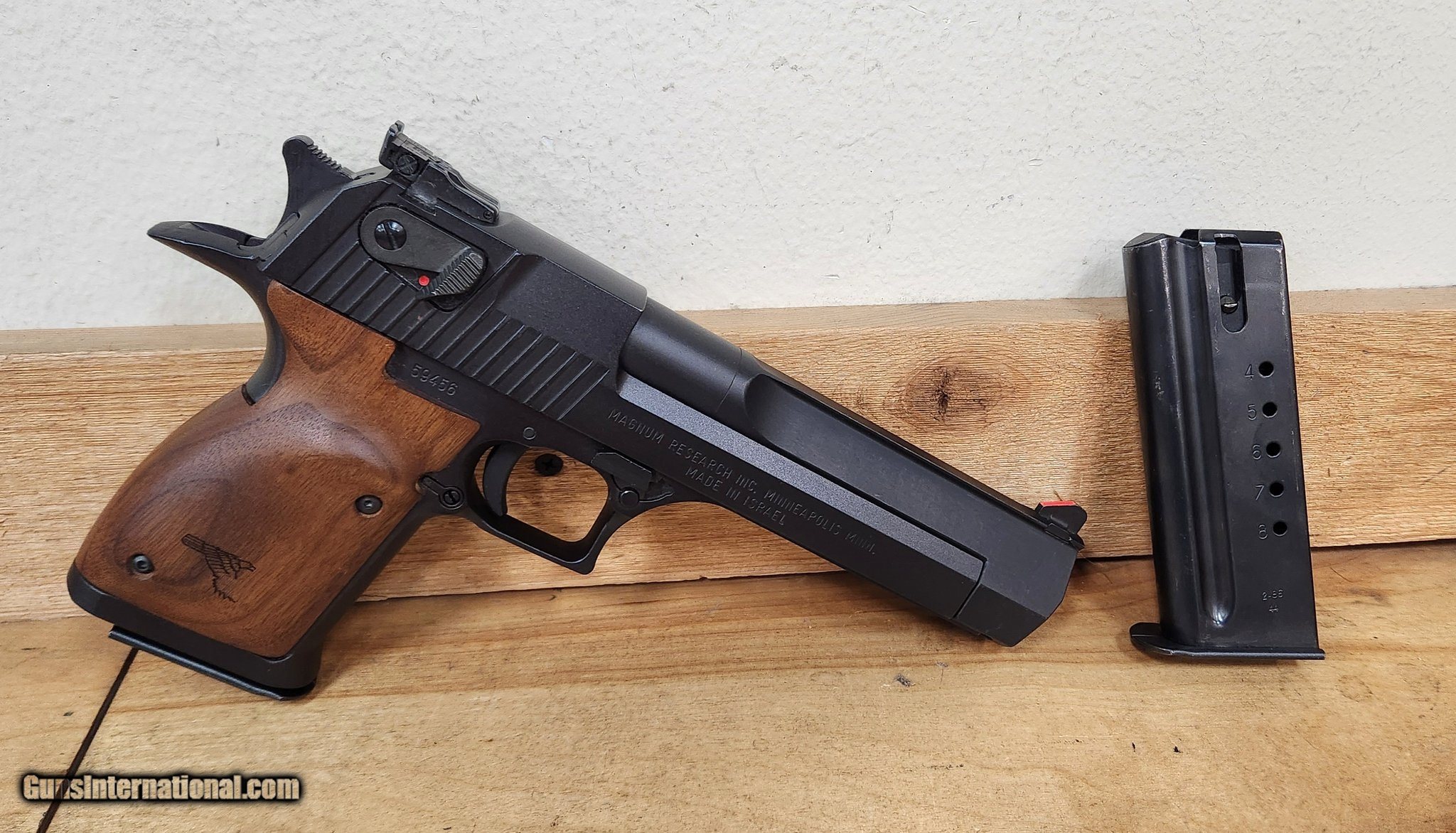 Description: Guns Listing ID: 1307494 This Israel made Magnum Research Desert Eagle is chambered in the powerful. 44 Magnum. It features a nice wood grip, black finish and 6\" Barrel. The front sight is fixed, Ramp style, with a highly visible orange line. The rear sight is adjustable with a white line for quick target acquisition. Overall the gun is in pretty nice condition. It does have a few minor handling marks/imperfections. The bore is in good condition. It includes two magazines. No box. SOLD Manufacturer: IMI Model: Desert Eagle .44 (Made in Israel) Caliber Info: .44 MAGNUM Condition: Used - Non-Certified Barrels: 6 BARREL Finish: BLACK /W WOOD STOCK |