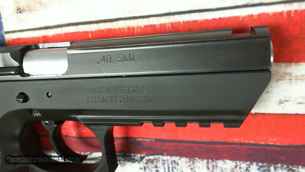 Description: Guns Listing ID: 539101 small scratch on back by hammer, otherwise, excellent condition. The Baby Desert Eagle is known by the industry as having one of the most reliable mechanisms in the world, and this is evident in the new Baby DE III Series as well. It features a precision land and groove match barrel, ambidextrous teardrop-shaped decocking mechanism on the slide, smoother trigger pull, fully interchangeable magazines with all Baby Desert Eagle II models, and a reversible magazine catch for either left- or right-handed shooters. The integral tactical accessory rail makes it ideal for a variety of laser and light accessories. Firearm Specifications Manufacturer: Magnum Research Model: Baby Desert Eagle III Caliber: 40 S&W Barrel Length: 4.43\" Height: 5.375\" Overall Length: 8\" Weight: 37.9 oz. Slide Width: 1.31\" Construction: High quality carbon steel frame and slide Finish: Black Oxide Finish Trigger: DA/SA Safety: Slide mounted safety and decocker; ambidextrous Sights: Combat type; white three dot; fixed Magazines: (2) 13 Round Magazines SOLD Manufacturer: MAGNUM RESEARCH Model: BABY DESERT EAGLE III Caliber Info: 40 S&W Condition: Used - Non-Certified Barrels: 4.43 BARREL Finish: BLACK |