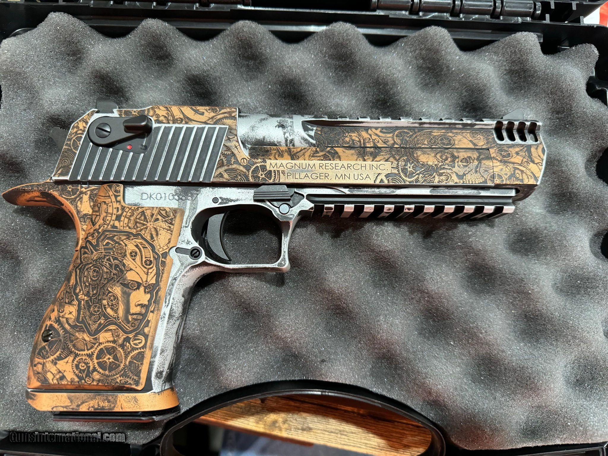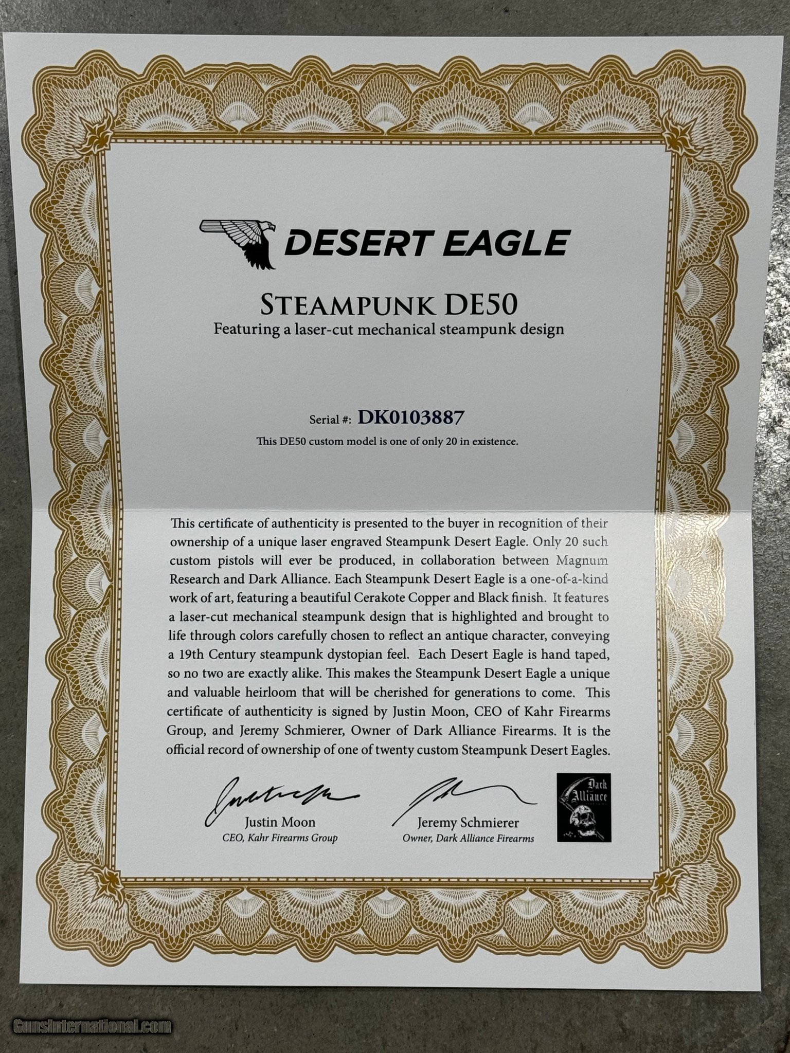 Description: Guns Listing ID: 1265398 This gun is NEW in box and unfired! 1 of only 20 ever to be produced. Custom \"Steampunk\" Edition Magnum Research DE .50AE. 6\" barrel, Dark Alliance and Koted Arms presents the ultimate incarnation of custom Desert Eagle. From the slide, to the frame, and across the grips, the artists at Dark Alliance and Koted Arms used the Desert Eagle as a canvas to engrave their vision of a steampunk universe. Each gun was then coated with a Cerakote Copper and Black finish, carefully chosen to reflect an antique character and dystopian 19th Century feel. The pistols are hand taped during finishing, so no two are exactly alike. SOLD Manufacturer: MAGNUM RESEARCH Model: DE50 Desert Eagle Caliber Info: .50 AE Condition: Used - Non-Certified Barrels: 6 BARREL Finish: CUSTOM CERAKOTE |