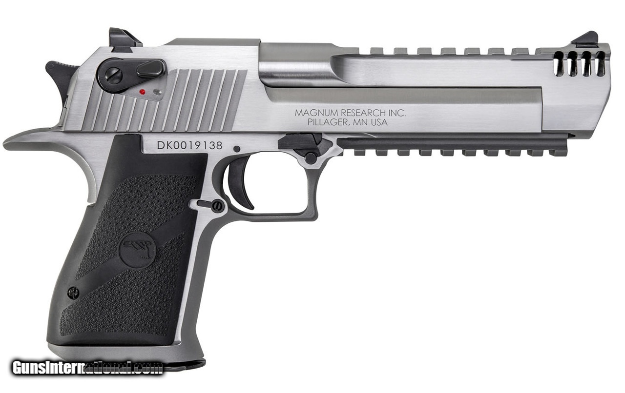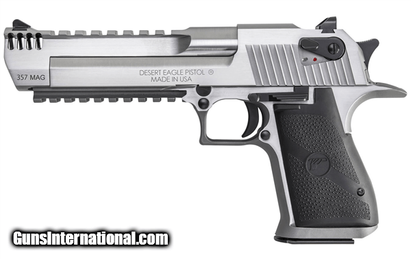 Description: Manufacturer: Magnum Research Model: Desert Eagle® Mark XIX SKU: DE357SRMB Caliber: .357 Magnum Capacity: 9 Rounds Sights: Combat type, fixed Barrel Length: 6" High quality stainless steel barrel frame w/ picattiny bottom rail and slide w/ full weaver style accessory rail and integral muzzle brake Overall Length: 10.75" Weight: 4 lbs 8.8 ozs Finish: Stainless Steel Grips: Black Twist: 1:14" After the successful launch of the stainless steel .50 AE Mark XIX pistol, Magnum Research is proud to introduce the highly anticipated .357 Mag Stainless Steel Desert Eagle. These pistols are 100% made in the USA, and include an all stainless steel frame, slide, barrel and rail, and is accented with attractive black appointments. This all stainless steel version comes with an integral muzzle brake. This hard hitting semi auto packs 9 rounds of 357 magnum punch into a package that is remarkably easy to handle. The muzzle brake reduces muzzle rise for faster follow up shots. Picatinny rails top and bottom make adding optics and accessories a breeze. The controls and sights are black making a nice contrast against the stainless steel finish. SOLD |