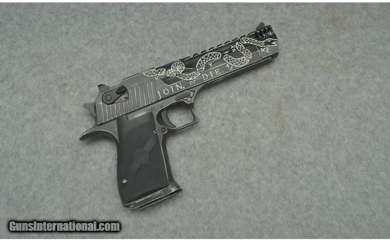 Description: Magnum Research Desert Eagle chambered in .50 AE. Overall condition is very good. The Join or Die (Benjamin Franklin's warning to the British colonies in America) has been added to the finish in Distress. This DE was made in USA, serial # DK0077751 .50 Action Express SOLD Chambers: 8 Metal Condition: V good Bore Condition: V good Barrels: 6 Weight: 4 Lb 6 Oz Item Location: Sun Prairie, WI |