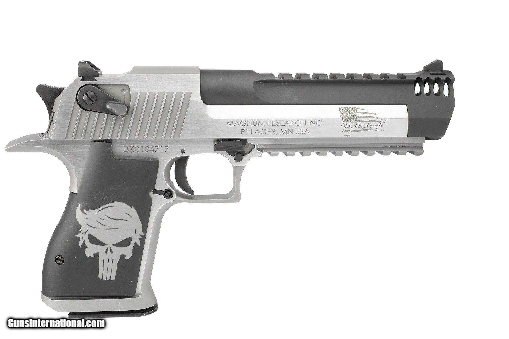 Description: Guns Listing ID: prod288300 Behold the Magnum Research Desert Eagle \"Trump Punisher\", a blend of power, precision, and patriotic aesthetics. Chambered in the formidable .50 AE caliber, this semi-automatic pistol boasts a 6\" barrel and a 7-round magazine capacity. Featuring a unique Black Cerakote finish and specialized aluminum \"Trump Punisher\" grips. SOLD Manufacturer: MAGNUM RESEARCH Model: DESERT EAGLE Caliber Info: .50 AE Condition: new Barrels: 6 BARREL Finish: STAINLESS & BLACK |