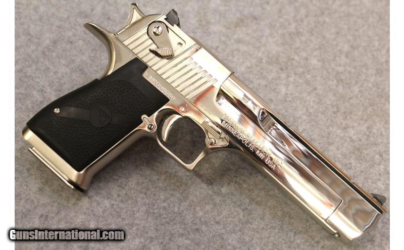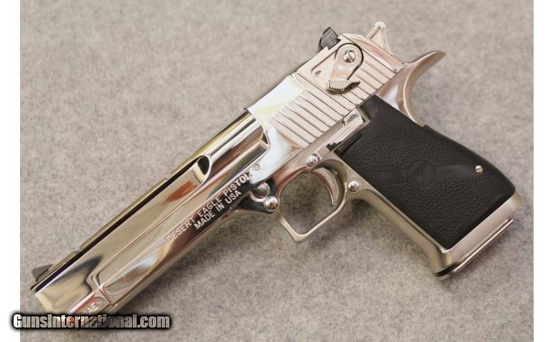 Description: This Magnum Research Desert Eagle chambered in .50 AE features, nickel finish, ambidextrous manual safety, integral barrel optic mount, and Magnum Research rubberized textured grips. .50 Action Express SOLD Metal Condition: Excellent Bore Condition: Bright Barrels: 6 Weight: 4.2 lbs Item Location: Hoffman Estates, IL |