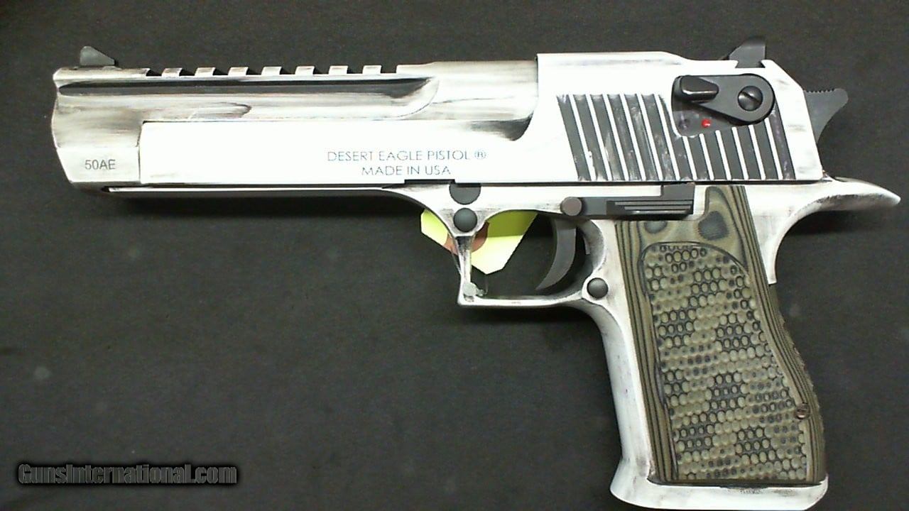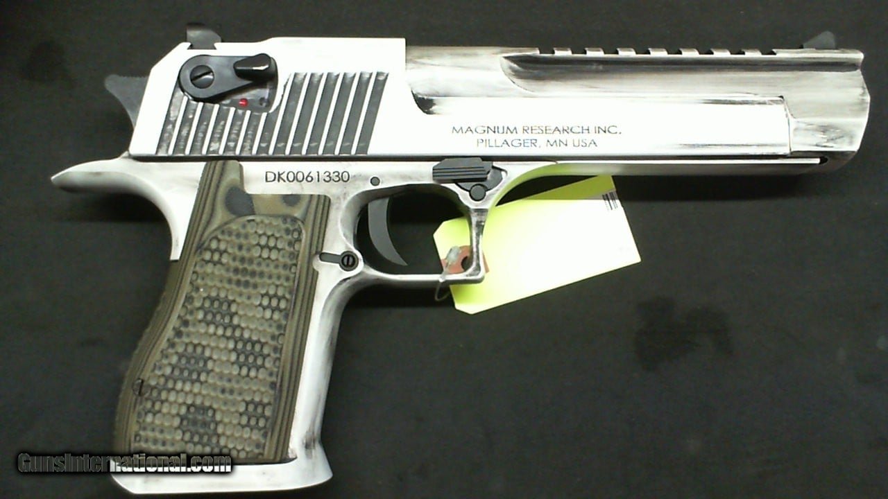 Description: Guns Listing ID: 472643 Magnum Research Desert Eagle Mark XIX 50 Action Express 6in White Matte Distressed Pistol - 7+1 Rounds - You can customize your Desert Eagle Pistol with a variety of impressive finishes to add your own distinctive twist to this timeless firearm. All models feature a full Weaver style accessory rail on the barrel from the end of the chamber to right behind the front sight and standard ambidextrous safeties. SOLD Manufacturer: MAGNUM RESEARCH Model: DESERT EAGLE Condition: Used - Non-Certified Barrels: 6.5 Gauge Info: .50 AE Finish: custom |