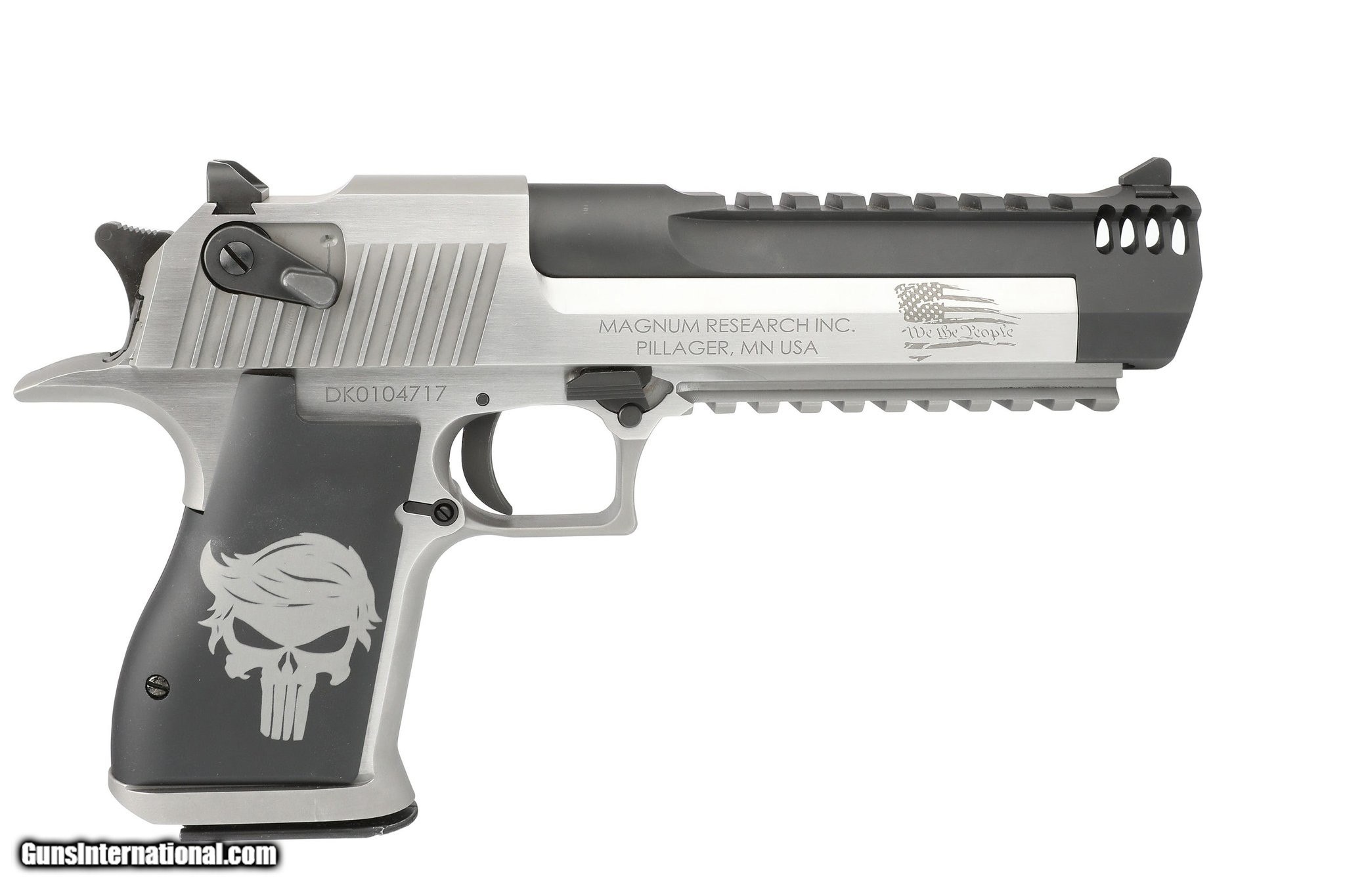 Description: Guns Listing ID: 314947 Behold the Magnum Research Desert Eagle \"Trump Punisher\", a blend of power, precision, and patriotic aesthetics. Chambered in the formidable .50 AE caliber, this semi-automatic pistol boasts a 6\" barrel and a 7-round magazine capacity. Featuring a unique Black Cerakote finish and specialized aluminum \"Trump Punisher\" grips. SOLD Manufacturer: MAGNUM RESEARCH Model: DESERT EAGLE Caliber Info: .50 AE Condition: new Barrels: 6 BARREL Action: SEMI AUTOMATIC Finish: STAINLESS & BLACK Weight: 4.4 LBS. |