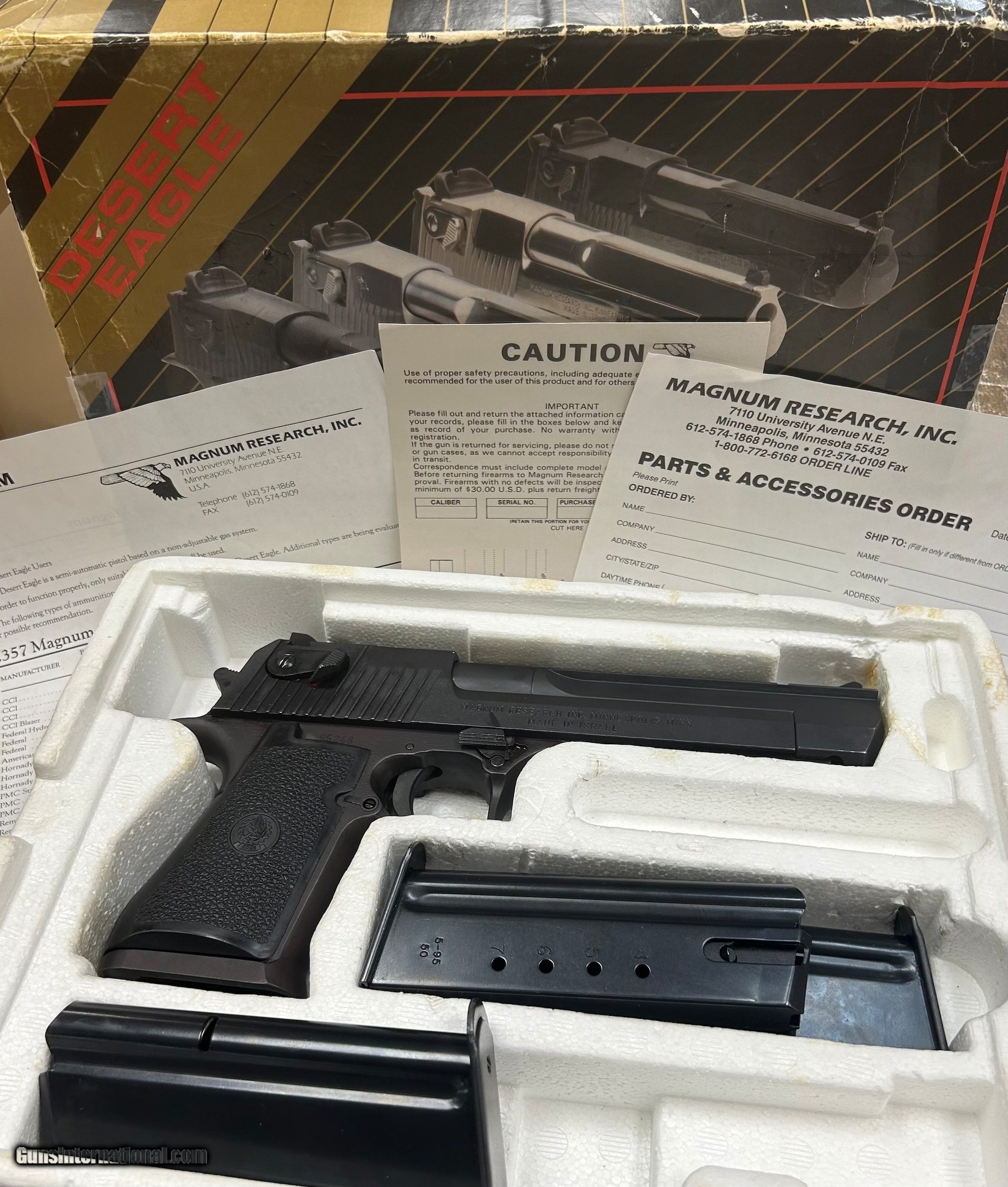 Description: Guns Listing ID: 1209832 Mid 90‚‚s Production IMI/Magnum Research Desert Eagle Chambered in .50AE. Handgun Ships as Pictured with 3 Mags, leather shoulder holster, Box, and paperwor SOLD Manufacturer: MAGNUM RESEARCH Model: Desert Eagle 50AE Caliber Info: .50 AE Condition: Used - Non-Certified Barrels: 6 BARREL Finish: PARKERIZED |
