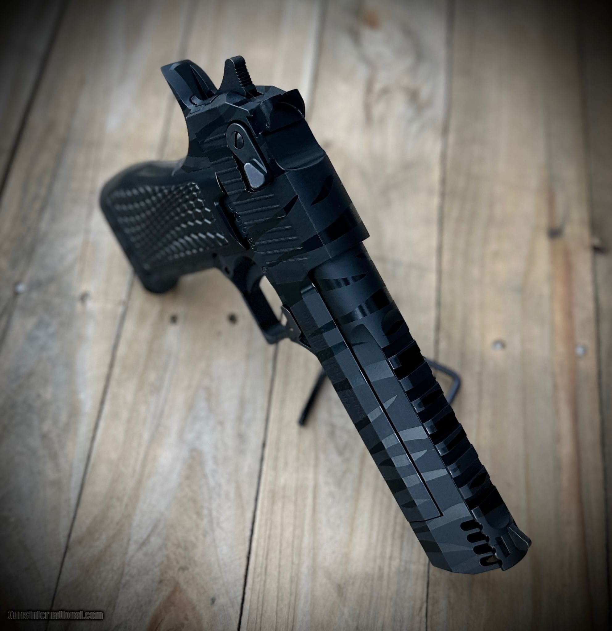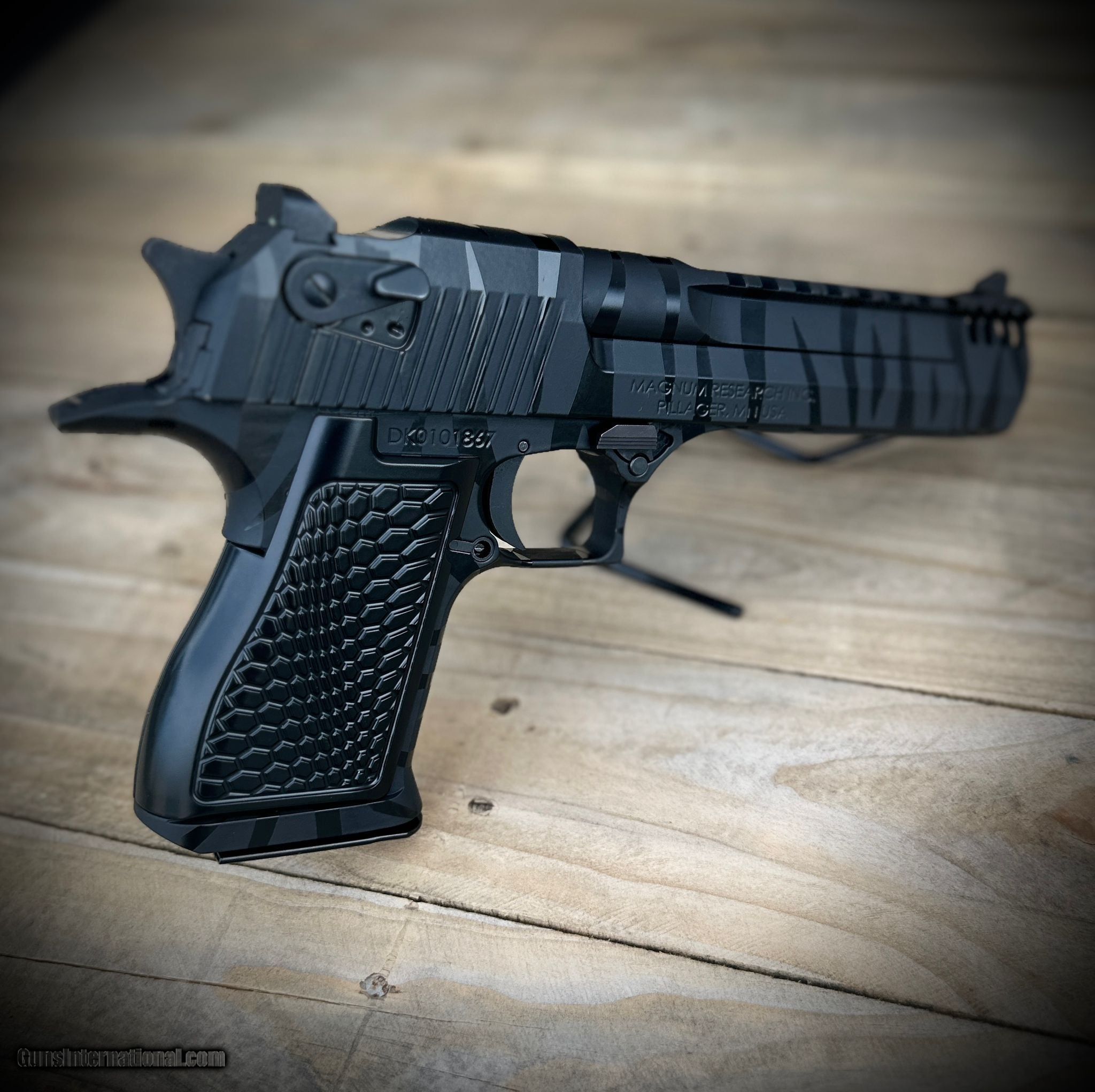 Description: Guns Listing ID: 887219 This is a factory NEW, Never-Fired Gun. Pistol, Magnum Research, Desert Eagle, Semi-Auto, .50AE, 6\" Barrel, 1 Magazine of 7 Rounds - Integral Muzzle Brake, Black Tiger Stripe by A Really Bad Design with the Integral Muzzle Brake this magazine monster will be easier to control!!! Our sister company, A Really Bad Design, is Certified by Cerakote(tm), they took the looks of this gun to another level. With these amazing black tiger stripes, you will stand out. But we went further, with an after-market grip by Wicked Grips and a distinguished finish done in house to give it the touch! SOLD Manufacturer: MAGNUM RESEARCH Model: Desert Eagle 50AE Caliber Info: .50 AE Condition: Used - Non-Certified Barrels: 6 BARREL Finish: MATTE BLACK |