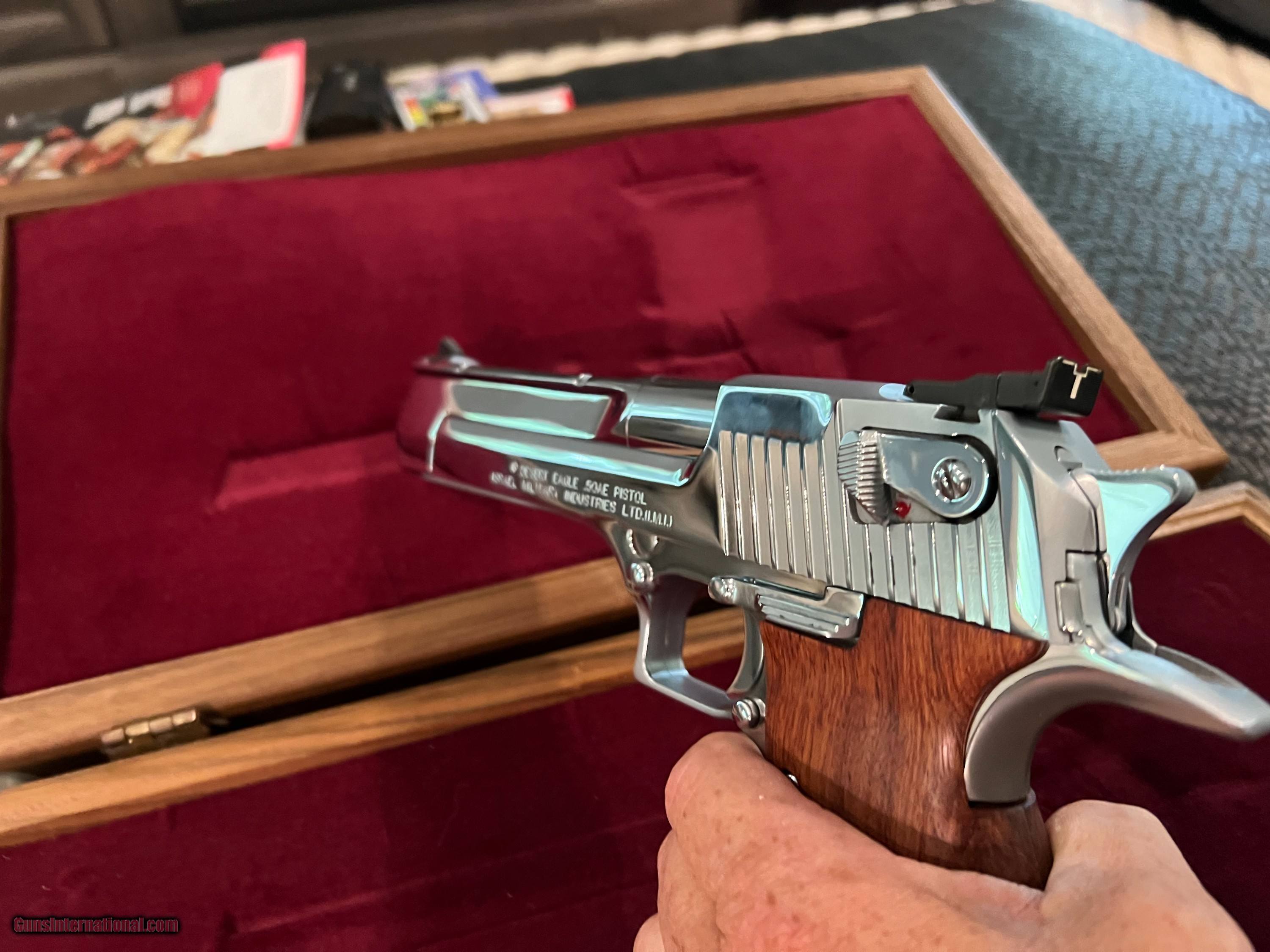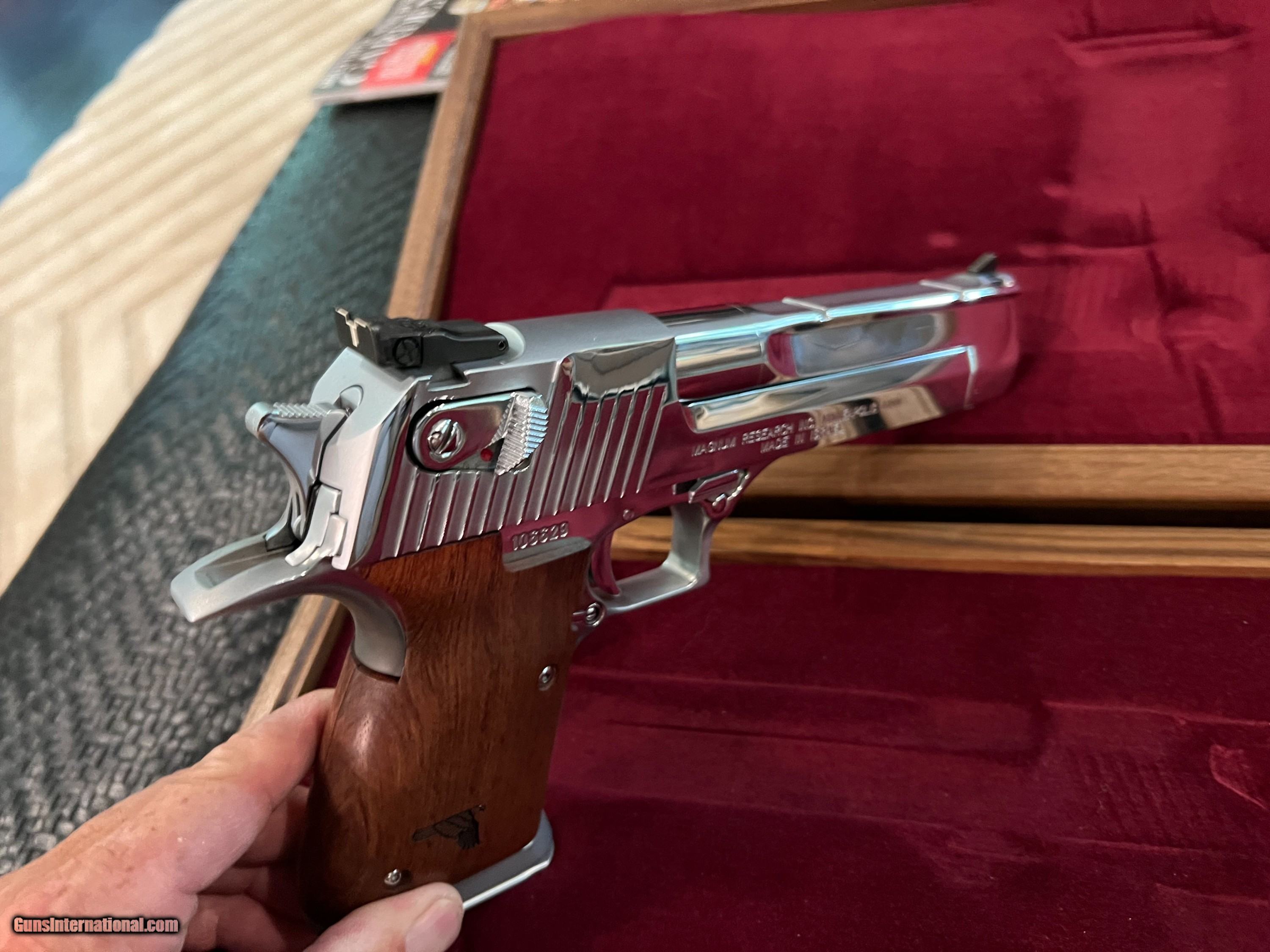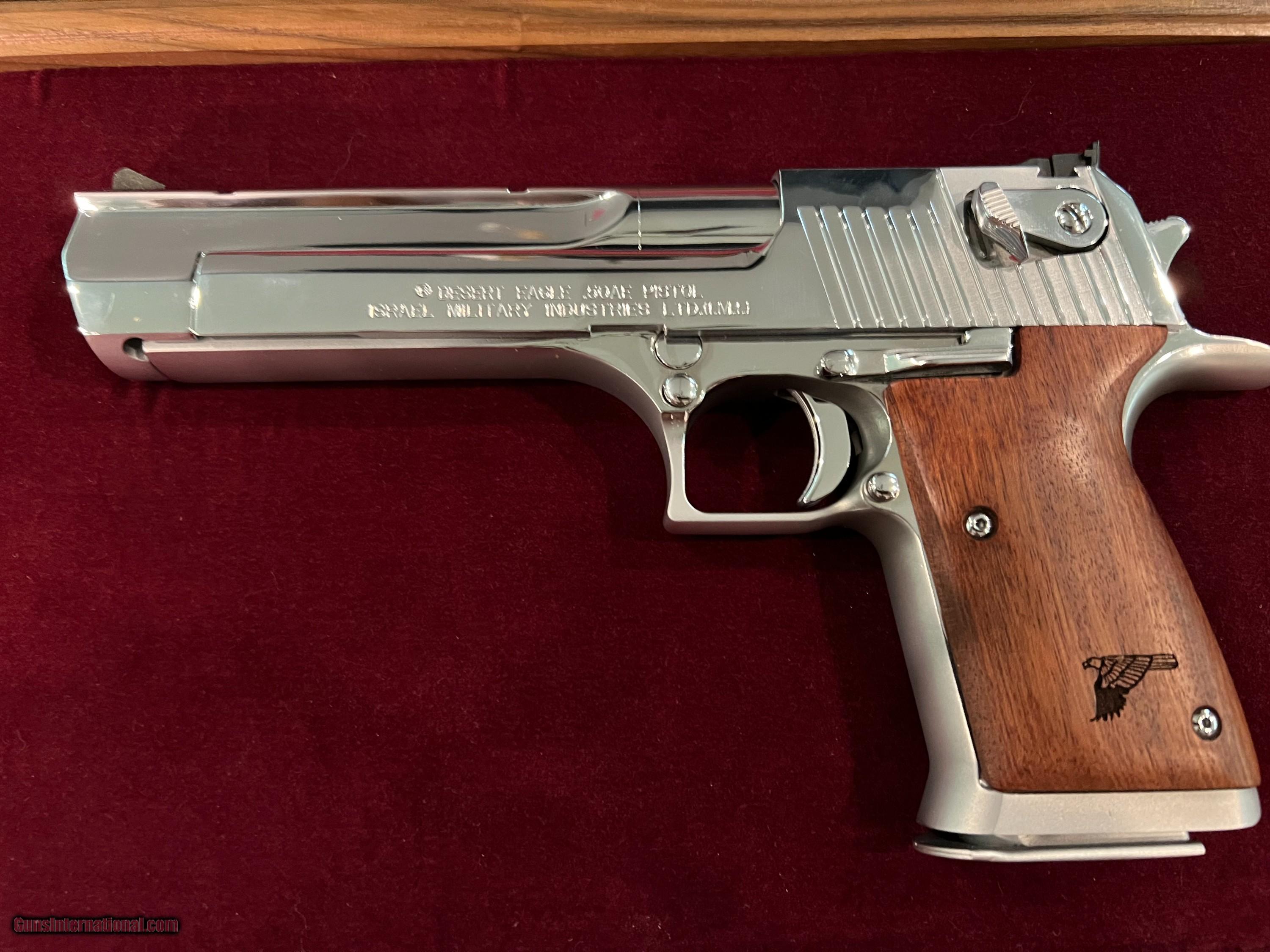 Description: A Magnum Research Desert Eagle .50AE, completely nickel plated, accompanied by a matching box and custom grips. SOLD Handgun Caliber: .50 Action Express Condition: Perfect Metal Condition: Perfect |