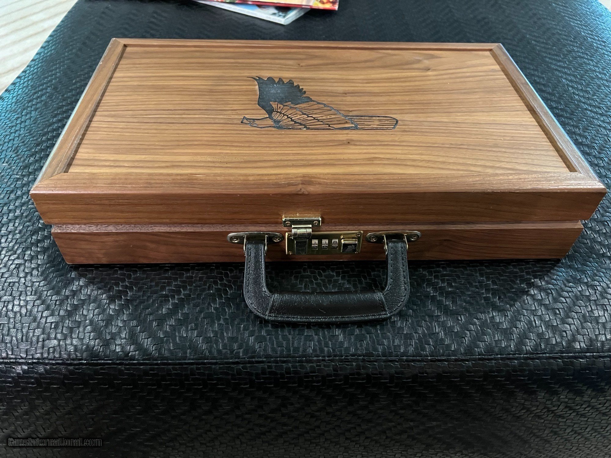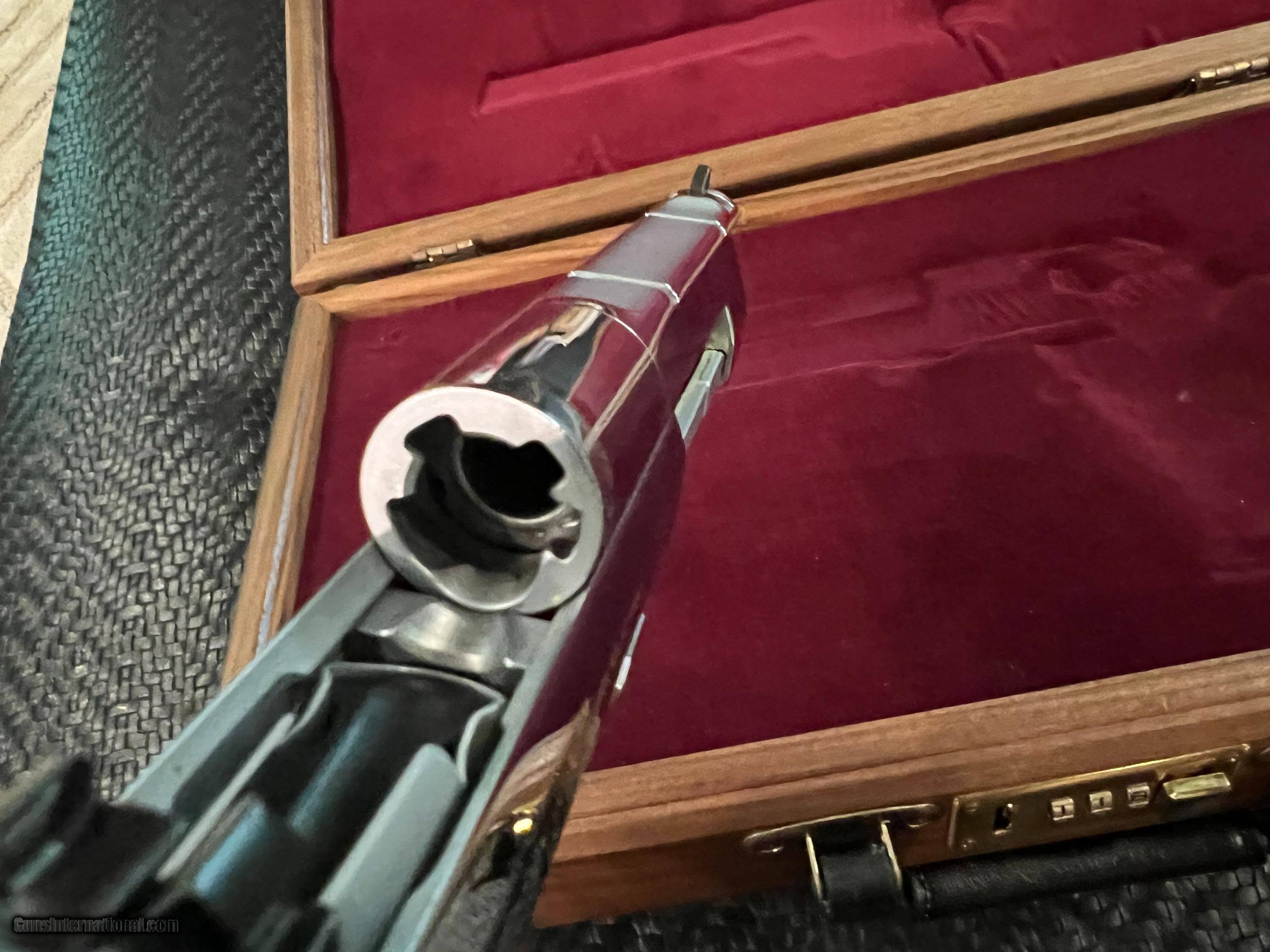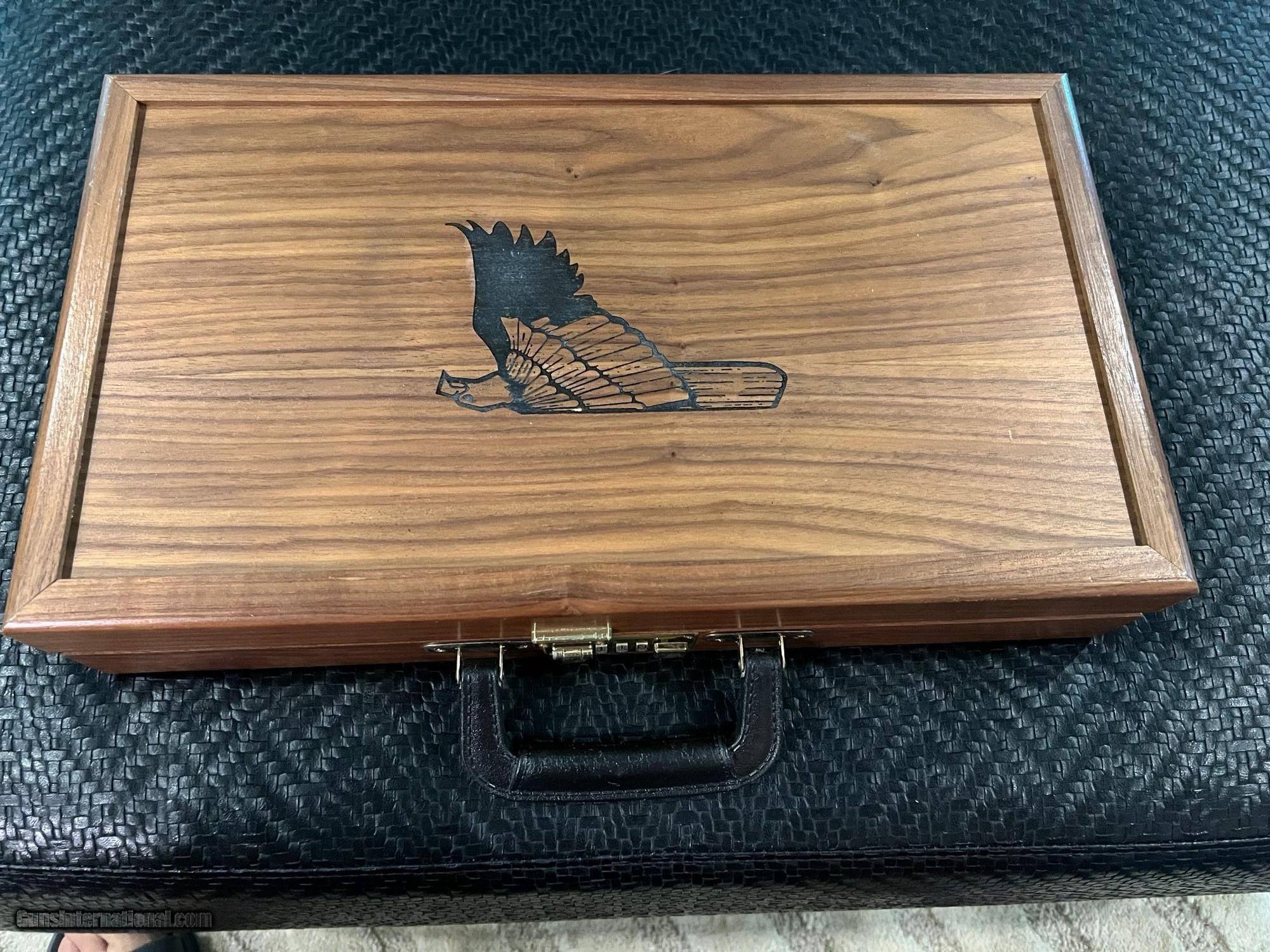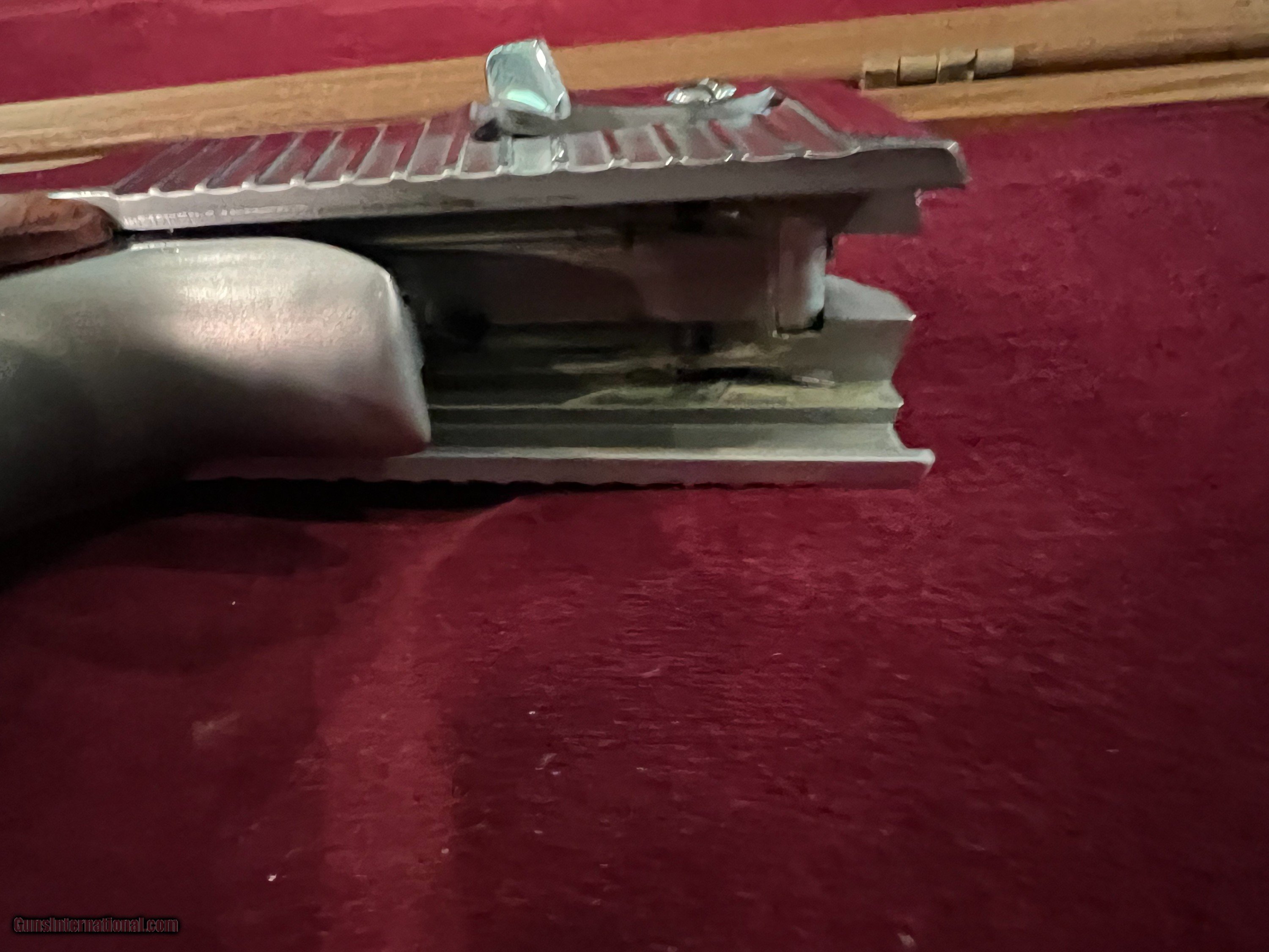 Description: A Magnum Research Desert Eagle .50AE, completely nickel plated, accompanied by a matching box and custom grips. SOLD Handgun Caliber: .50 Action Express Condition: Perfect Metal Condition: Perfect |