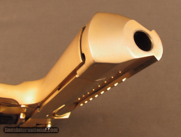 Description: S# DK 0000483, .50 AE, 6 inch barrel, bright excellent bore. This June 2011 built pistol is plated in 24 karat gold and features a gold bottom (no longer available) seven round magazine and box with owners manual and 5 in 1 disassembly tool. Pistol was built in USA and retains 95% gold finish with wear on high edges and mag floor plate. An importers mark is stamped by magazine port. A massive pistol with brilliant gold finish. FFL SOLD Manufacturer: Magnum Research Model: MKX1X Serial Number: DK0000483 Caliber Info: .50 AE Gauge Info: .50 AE |