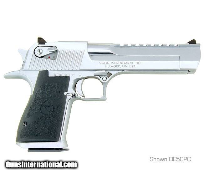 Description: Manufacturer: Magnum Research Model: Desert Eagle® Mark XIX SKU: DE357PC Caliber: .357 Magnum Capacity: 9 Rounds Sights: Combat type, fixed Barrel Length: 6" Overall Length: 10.75" Weight: 4 lbs 8.4 ozs Finish: Polished Chrome Grips: Black Rubber Twist: 1:14" After 25 years of being accessorized customized and re-imagined in countless movies television shows and video games the Desert Eagle Pistol has emerged as a pop-culture icon. You can customize your Desert Eagle Pistol with a variety of impressive finishes to add your own distinctive twist to this timeless firearm. All models feature a full Weaver style accessory rail on the barrel from the end of the chamber to right behind the front sight and standard ambidextrous safeties. SOLD |