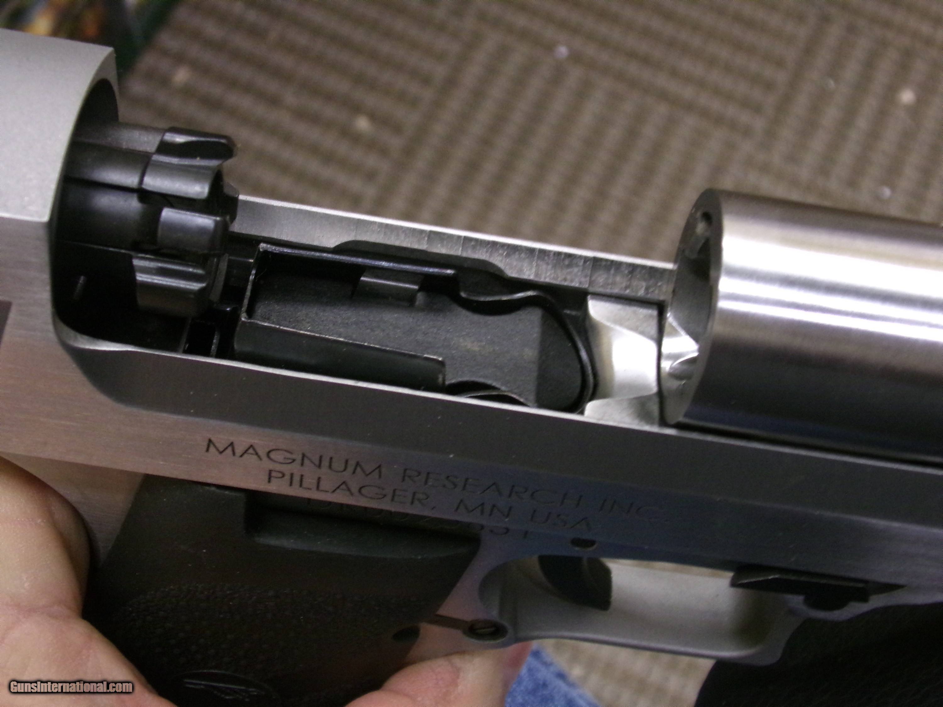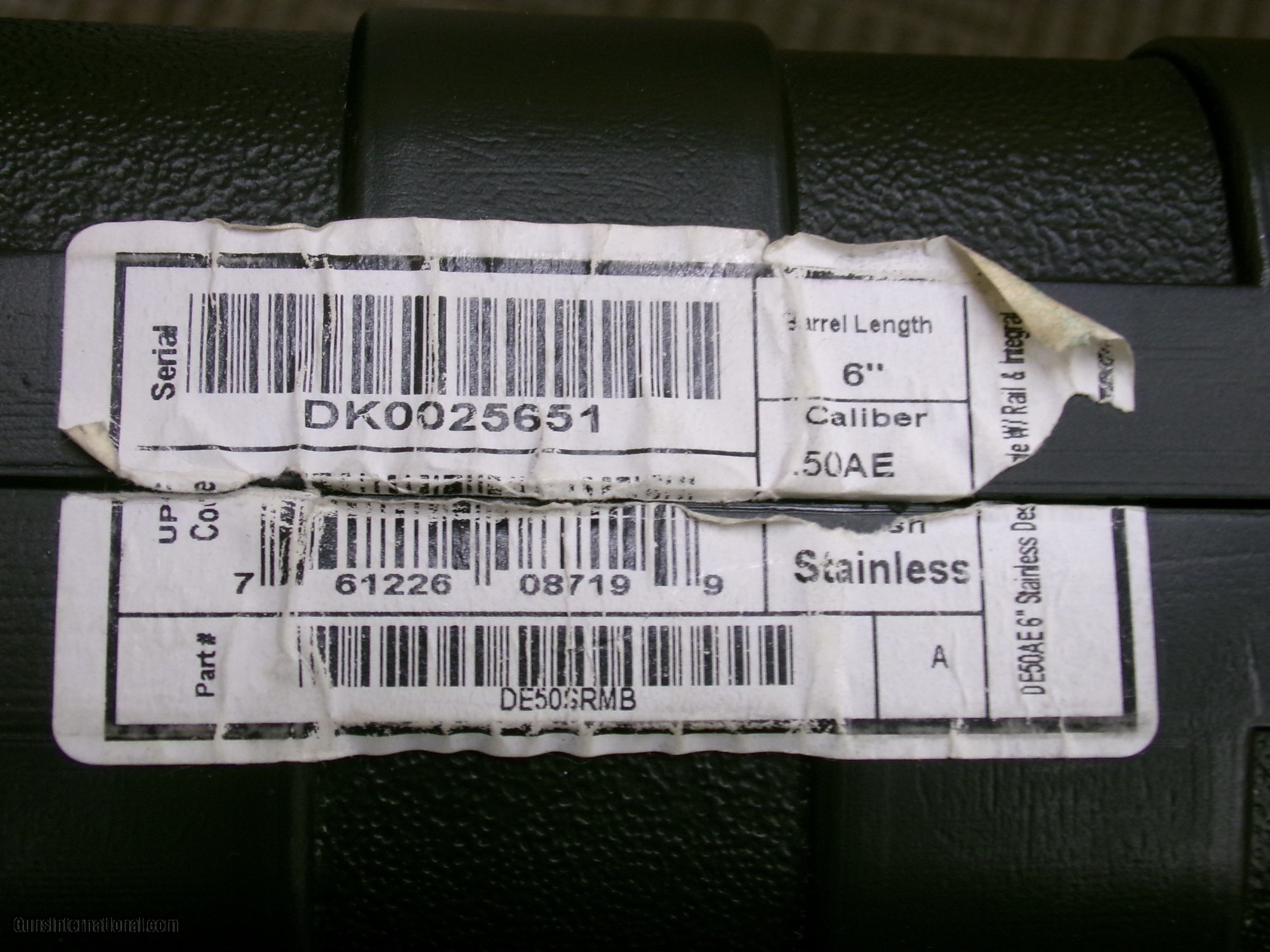 Description: USED GOOD CONDITION Magnum Research Desert Eagle Mark XIX W/ Integral Muzzle Brake 50 AE -- 6" Barrel, Stainless Steel, Silver, Plastic Grips, Fixed Sights, Ambidextrous Thumb Safety, 7 Rounds, 2 Magazines, Integral Muzzle Brake, Picatinny Rail, Ambidextrous Safety WITH FACTORY HARD CASE, MANUAL, LOCK & 2 MAGS ****PLEASE CALL IN THE WITH THE SELLER’S INVENTORY NUMBER IF INQUIRING ABOUT A FIREARM****** WE DO NOT SHIP FIREARMS AND/OR FIREARMS’ PARTS OUT OF THE 50 UNITED STATES, SO DON’T ASK—YOU NEED TO KNOW IF FIREARM IS LEGAL FOR YOUR STATE PRICE REFLECTS PAYMENT BY MONEY ORDER / CASHIERS CHECK. A 3% PREMIUM IS ADDED FOR CREDIT CARDS. WE DO ACCEPT PERSONAL OR BUSINESS CHECKS, BUT THERE IS A GRACE PERIOD OF 10 BUSINESSS DAYS ON THEM. Shipping is $60 for handgun and $50 for long gun. Shipping to Alaska and Hawaii will be more based on weight of firearm. USPS SHIPPING IS HIGHER. WE DO OFFER LAYAWAY PLANS FOR 30,60, OR 90 DAYS.NOT ON CONSIGNMENT GUNS THERE IS A $5.00 CHARGE FOR EVERY 30 DAYS ITEM IS ON LAYAWAY. WE ALSO REQUIRE A 20% DOWN PAYMENT ON TOTAL OF LAYAWAY SALE. LAYAWAYS ARE NON- REFUNDABLE. HERE IS HOW THIS PROCESS WORKS. YOU WOULD CALL US AT 540-337-9218 WITH LISTER # TO PURCHASE THE GUN. THEN ONCE I HAVE RECEIVED PAYMENT AND AN FFL (FEDERAL FIREARMS LICENSE) FROM A LICENSED DEALER IN YOUR AREA OF YOUR CHOICE. WE WILL THEN SHIP THE GUN TO THEM. YOU WOULD THEN PICK UP THE GUN AT YOUR LOCAL DEALER AND DO PAPERWORK THERE. Please have your FFL Dealers contact information when you call. DOMINION OUTDOORS 15 ANGELA COURT FISHERSVILLE, VA 22939 540-337-9218 540-337-2422 fax M – F 9 a.m. to 6 p.m. ETZ Sat 9 a.m. to 4 p.m. ETZ ****PLEASE CALL IN THE WITH THE SELLER’S INVENTORY NUMBER**** ***PLANO HARD CASES AVAIABLE FOR PURCHASE $25.00 WITH THE PURCHASE OF A FIREARM** *** Online prices compared to in store prices will vary. *** SOLD |