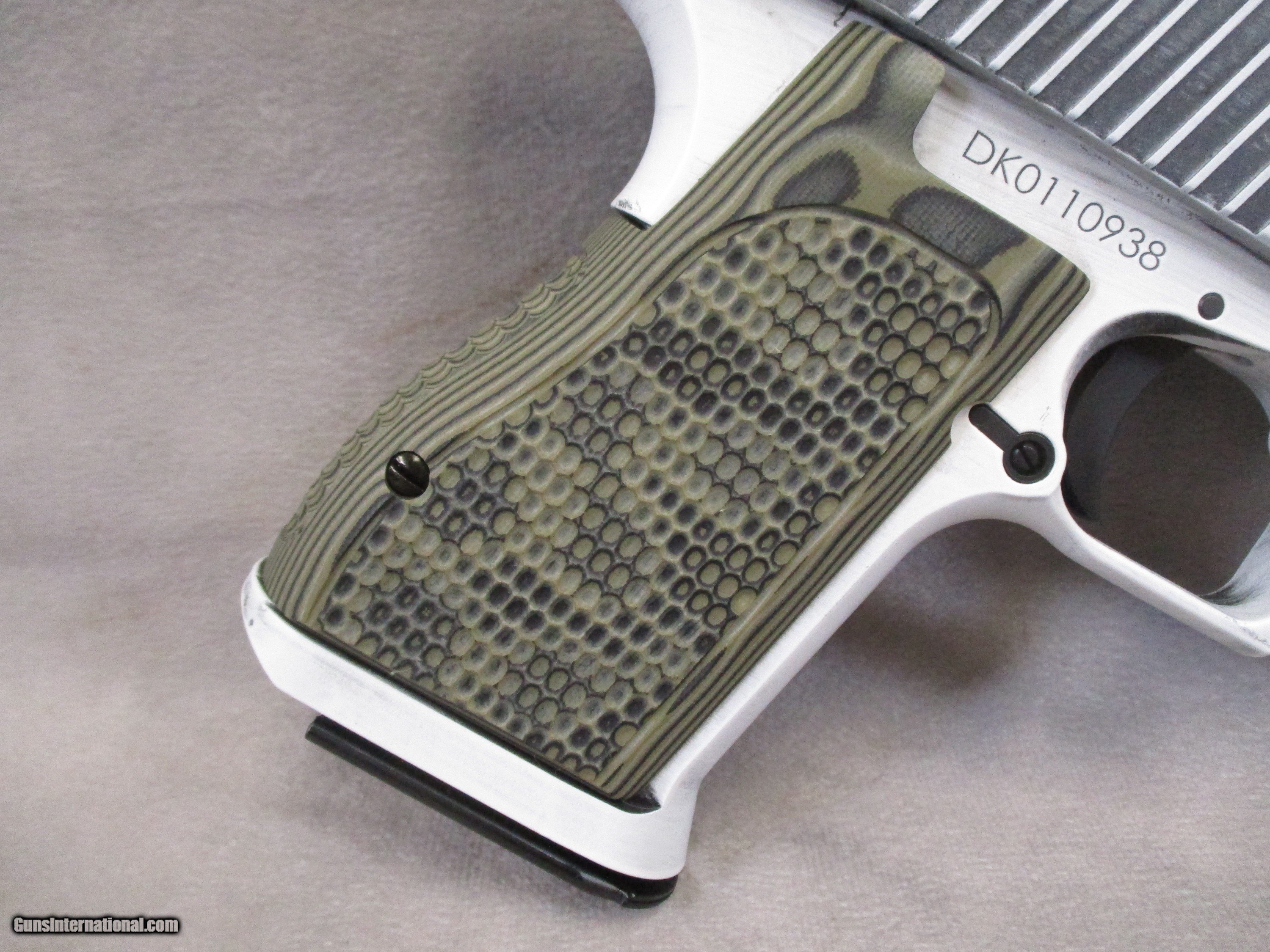 Description: The Desert Eagle! A name and image that has spread far and wide since the first models came out in the 1980s. Thanks to many appearances in film and TV, the Desert Eagle is probably one of the few firearms most will recognize by sight if not necessarily by name. The Desert Eagle was designed to operate in the worst environments and uses a gas piston to both increase accuracy and reduce recoil compared to a revolver. Chambered in the powerful .50 Action Express, the Desert Eagle has a 7-plus-1 capacity. The .50 AE is suitable for metallic silhouette shooting but has always been popular for medium/big game hunting. With heavy bullets, such as TII Armory’s 400-grain and 460-grain offerings, the .50 AE can match the performance of the .480 Ruger and even gets close to the .500 Linebaugh. This example is new in the box. It sports a White Matte Distressed Cerakote finish. Cerakote finish is much more durable and longer lasting than the more traditional finishes. The 6-inch barrel provides a long sight radius of 8.5 inches. The slide has an integral picatinny rail for mounting an optic or scope. The pistol comes with one magazine, the original box, papers, and a tool. In addition to hunting, the Desert Eagle has been used for self-defense from large predators in a wide range of environments. For someone looking for a powerful pistol for defense against Class III game or just something to blast away with at the range for some fun, the Desert Eagle is a good choice. SOLD Handgun Caliber: .50 Action Express Manufacturer: Magnum Research Model: DE50WMD Serial Number: DK0110938 Bore: Rifled, polygonal rifling, 6 grooves, 1:19 inches (1 in 483 mm) RH twist Ejectors: Auto-ejection Condition: New in Box Barrels: Carbon Steel Barrel Type: Fixed Action: Semi-auto pistol, gas piston operation, rotating bolt Triggers: Single-Action, serrated-faced, pull weight approx. 4.0 lbs. Stock: G10 grips LOP: 2.75 inches (70 mm) Finish: White Matte Distressed Cerakote Weight: 4.3 lbs. Sights: Combat type, fixed, sight radius 8.5 inches (216 mm) Case: Magnum Research hard plastic case |