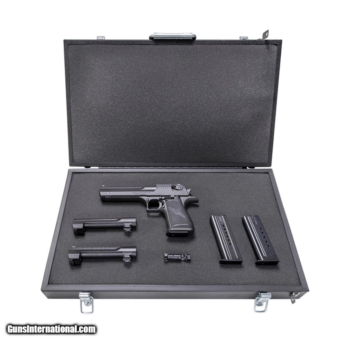 Description: Guns Listing ID: 629821 The Magnum Research Desert Eagle is a family of powerful semi-automatic pistols chambered in .357 Mag, .44 Mag, or 50 AE. Utilizing a gas-operated rotating bolt more commonly found in rifles the Desert Eagle was the first pistol capable of handling these outsized loads. Fixed sights adorn barrels at 6\" length depending on model and a rail allows users to mount the scope of their choice to the Desert Eagle. DE50 .50 AE Pistol with 6\" Barrel, Mag (1) 7rd capacity BAR446 .44 Magnum, 6\" Barrel, Mag (1) 8rd capacity BAR3576 .357 Magnum, 6\" Barrel, Mag (1) 9rd capacity w/ bolt assembly Shipped in Protective Lockable (locks not included) Aluminum Case SOLD Manufacturer: MAGNUM RESEARCH Model: DESERT EAGLE MKXIX Caliber Info: MULTI Condition: new Barrels: 6" barrel |