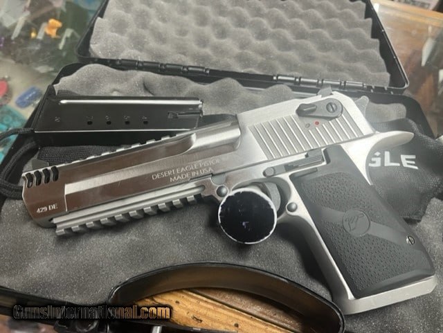 Description: Guns Listing ID: 480323 MANUFACTURER: Magnum Research FAMILY: Desert Eagle Series MODEL: Desert Eagle TYPE: Semi-Auto Pistol ACTION: Single Action CALIBER/GAUGE: 429 DE FINISH: Stainless Steel FINISH TYPE: Stainless Steel FRAME: Steel Frame BARREL: 6.0\" OVERALL LENGTH: 10.75\" RATE-OF-TWIST: 1-in-19 CAPACITY: 7 + 1 # OF MAGAZINES: 1 MAG DESCRIPTION: 7 rd. SIGHTS: Fixed SIGHT TYPE: Fixed Sights WEIGHT: 71.0 oz. SHIPPING WEIGHT: 6.3 lbs. SAFETY FEATURES: Ambidextrous ADDL INFO: Top Weaver Style Rail ADDL INFO: Bottom Picatinny Rail ADDL INFO: Integral Muzzle Brake MFG MODEL NO: DE429SRMB UPC: 761226089308 SOLD Manufacturer: MAGNUM RESEARCH Model: DESERT EAGLE Caliber Info: .429 DE Condition: Used - Non-Certified Barrels: 6 BARREL Finish: STAINLESS |