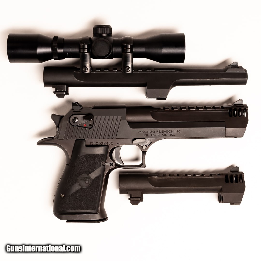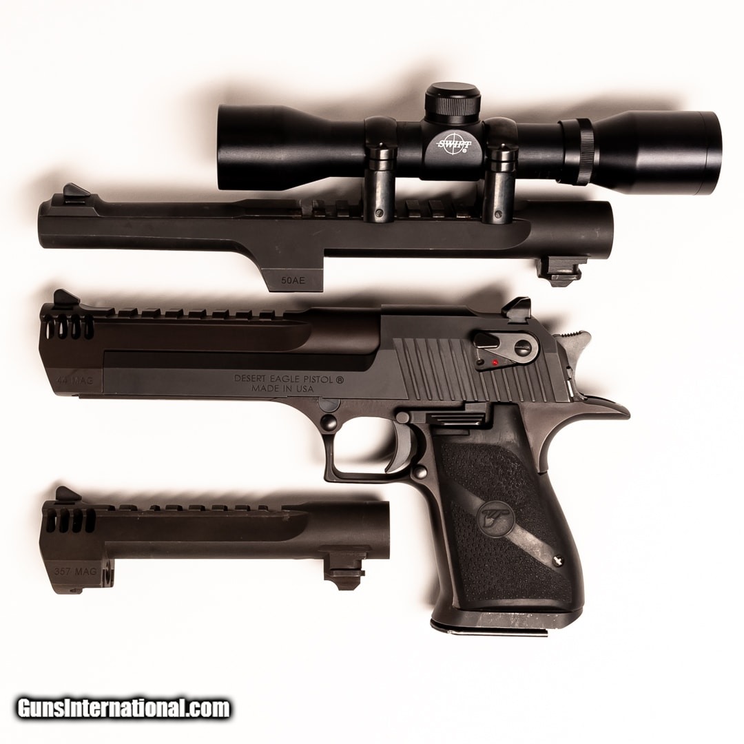 Description: Guns Listing ID: 619056 After 25 years of being accessorized, customized, and re-imagined in countless movies, television shows, and video games, the Desert Eagle has emerged as a pop-culture icon. The power and signature style make this a handgun that people don‚‚t necessarily need but definitely want. This Desert Eagle comes with three barrels - the currently installed 44 Mag barrel, a 5.5\" 357 Mag barrel, and a 10\" 50 AE barrel with a mounted Swift scope and Picatinny rail clamp. Purchase also includes the original case, manual, DVD, three 8-round 44 Mag magazines, two 9-round 357 Mag magazines, one 7-round 50 AE magazine, and an extra rail with a red dot SOLD Manufacturer: MAGNUM RESEARCH Model: DESERT EAGLE Caliber Info: .44 MAGNUM Condition: Used - Certified Barrels: not specified Finish: BLACK |