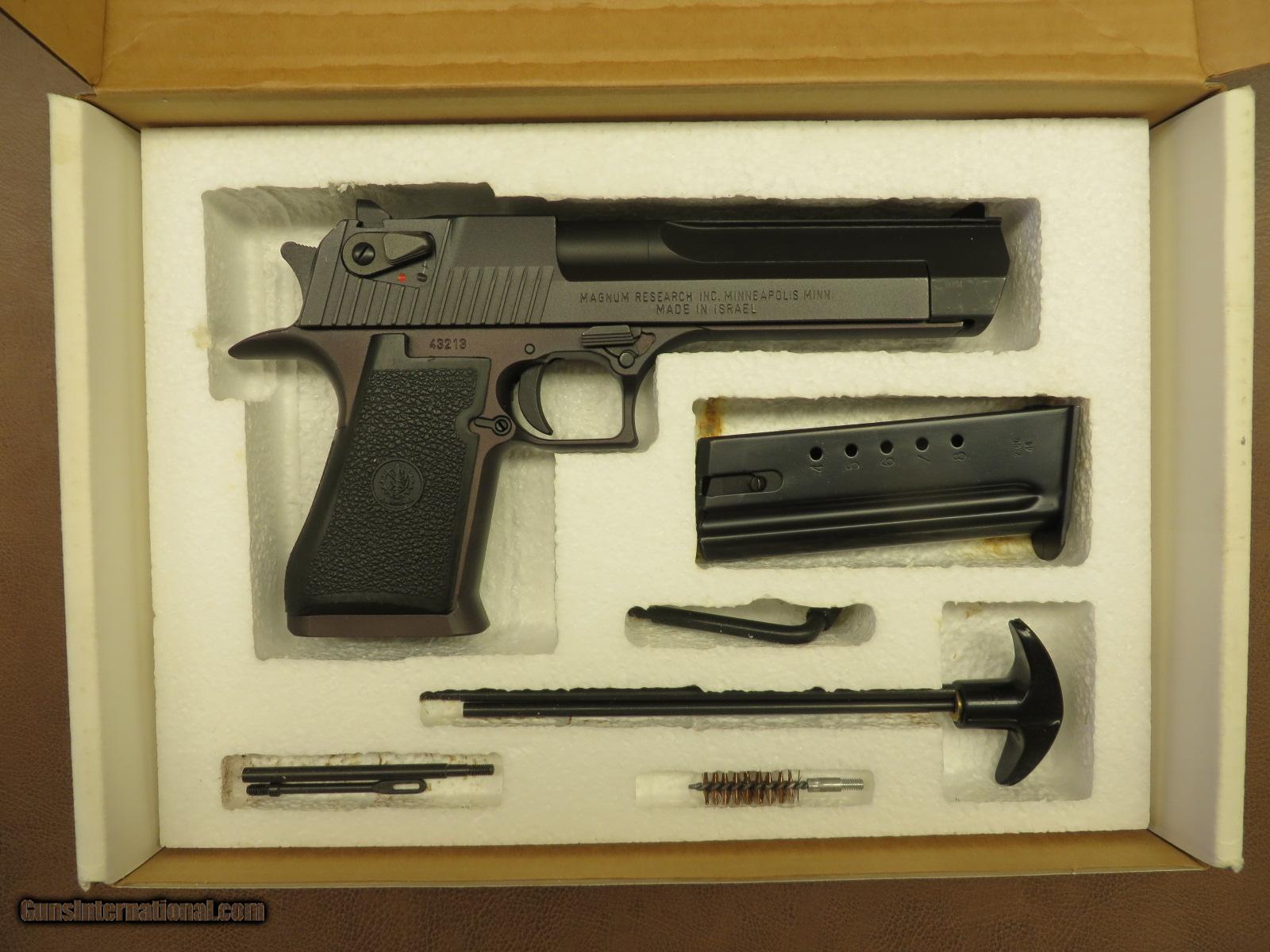 Description: .44 Magnum has 6 inch barrel with drift adjustable white outline rear sight and red ramp front sight. Slide is grooved for attaching scope mounting rail. Serial number 43xxx. Made in Israel. Textured synthetic grips. 99%+ condition and probably unfired in original box with all paperwork, cleaning kit, and tool. SOLD |
