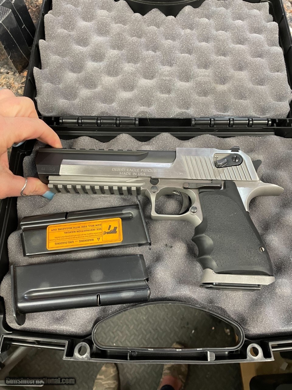 Description: Guns Listing ID: 748534 Gun is in great shape, comes in original box with 3-8 round magazines. SOLD Manufacturer: MAGNUM RESEARCH Model: DESERT EAGLE 44 MAG Caliber Info: 44 MAG Condition: Used - Non-Certified Barrels: 6 BARREL Finish: STAINLESS AND BLACK |