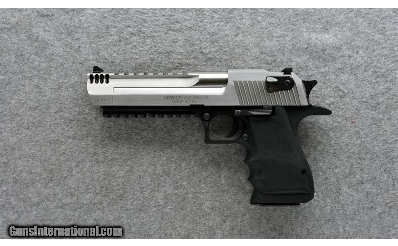 Description: Mark XIX Desert Eagle .44 Mag. with stainless slide and black aluminum frame. .44 Magnum SOLD Metal Condition: Factory finish remains excellent with a few minor handling marks. Bore Condition: Bright with sharp lands. Barrels: 5 1/4" (6" w/ compensator) Sights: Fixed Item Location: Post Falls, ID |