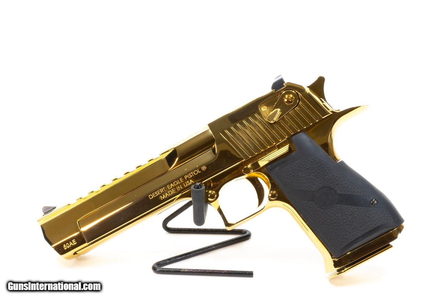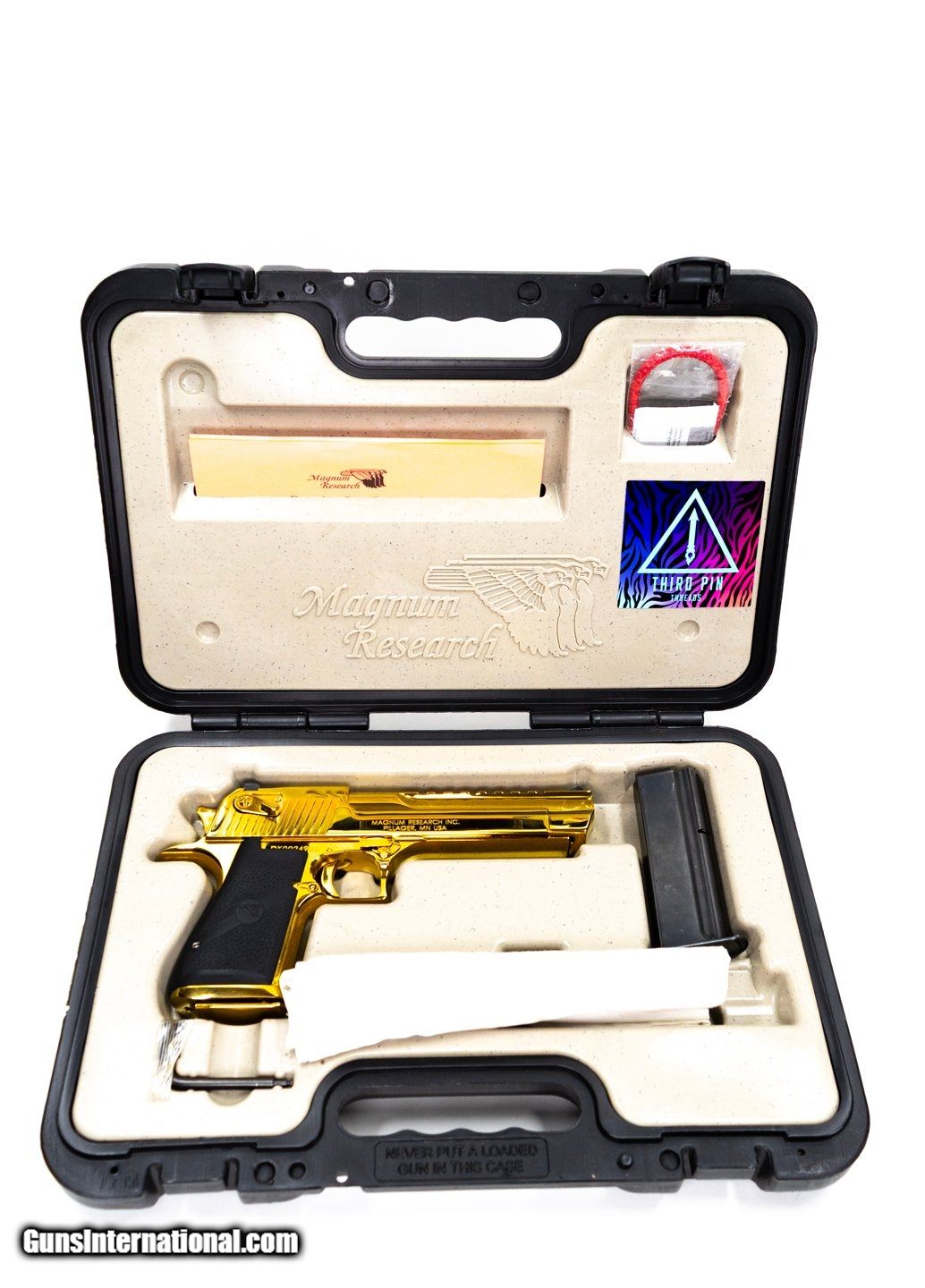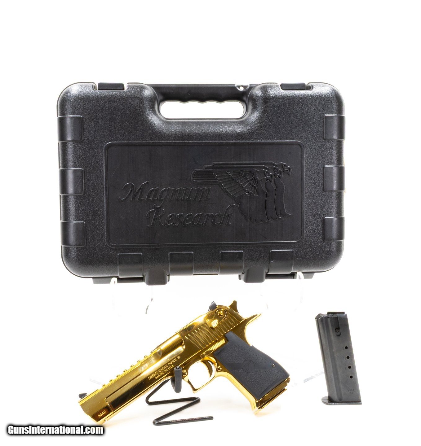 Description: Guns Listing ID: 545461 Pre-Owned Magnum Research Mark XIX Desert Eagle Titanium Gold w/ Case 2 Mags, .50AE 7+1 6\" Manufacturer: Magnum Research Model: Mark XIX Condition: Very Good Caliber: .50 Action Express Action: Semi-Auto / Single Action Barrel Length: 6\" Twist Rate: 1:19\" Capacity: 7+1 Finish: Titanium Gold frame & barrel Grips: Black, rubber Other Features: Ambidextrous safety, Weaver style optic ready top rail, steel frame & slide. Inventory: Firearm, (2) 8-rd magazines, original hard case, manual & cable lock. UPC: 761226029885 • We do not test fire used guns. All guns are function checked once we receive them. Unless stated otherwise, this firearm is functional. SOLD Manufacturer: MAGNUM RESEARCH Model: Mark XIX Desert Eagle Caliber Info: .50 AE Condition: Used - Non-Certified Barrels: 6 BARREL Action: SEMI AUTOMATIC Finish: gold |