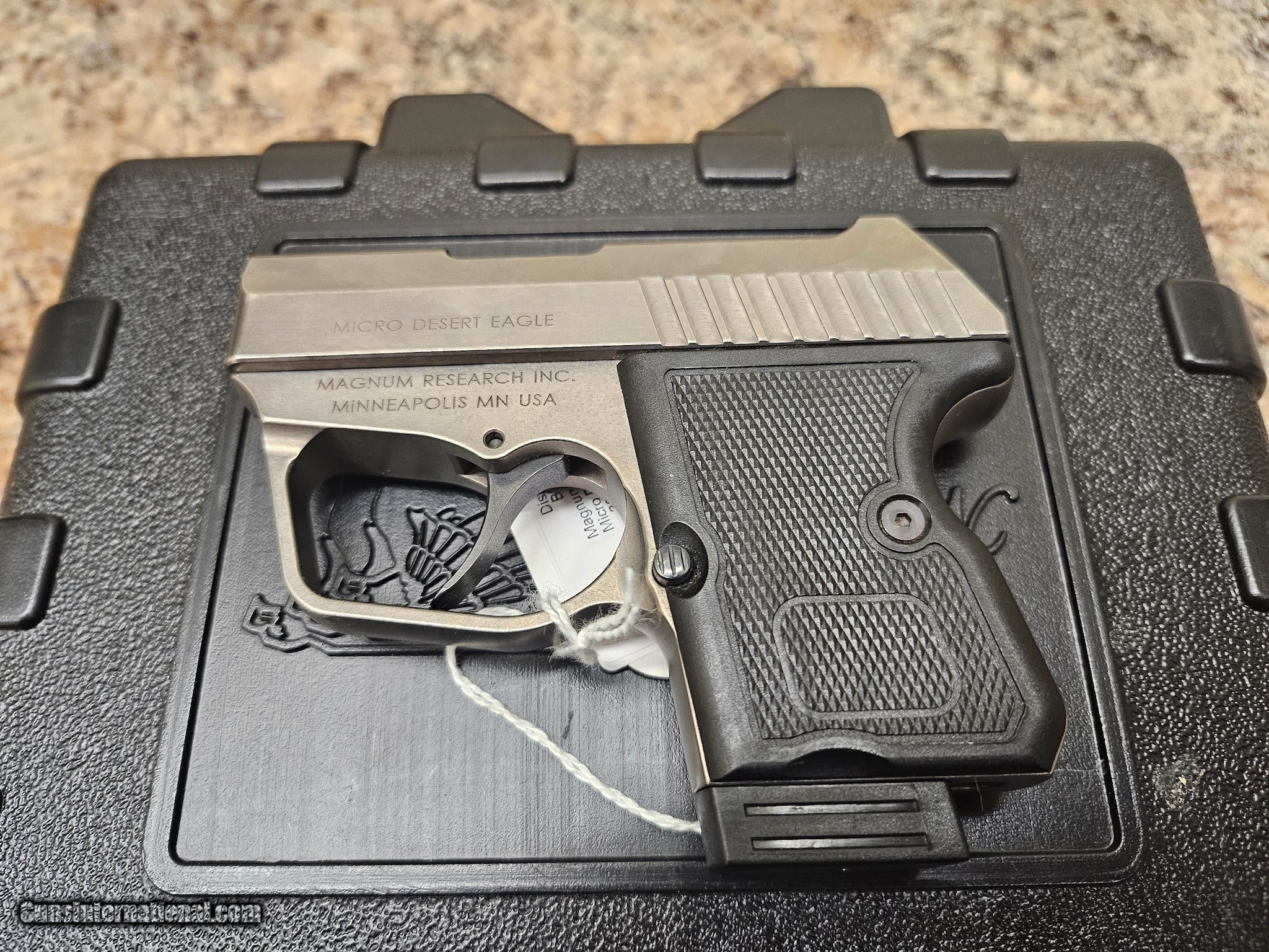Description: Guns Listing ID: 1105831 Very Good Condition, appears to be unfired. Comes with original box, 3 magazines, cleaning rod and brush, fired casing envelope, no booklet. Very minor if any slide wear. SOLD Manufacturer: MAGNUM RESEARCH Model: Micro Desert Eagle Caliber Info: .380 ACP Condition: Used - Non-Certified Barrels: 2.22 BARREL Finish: NICKEL |
