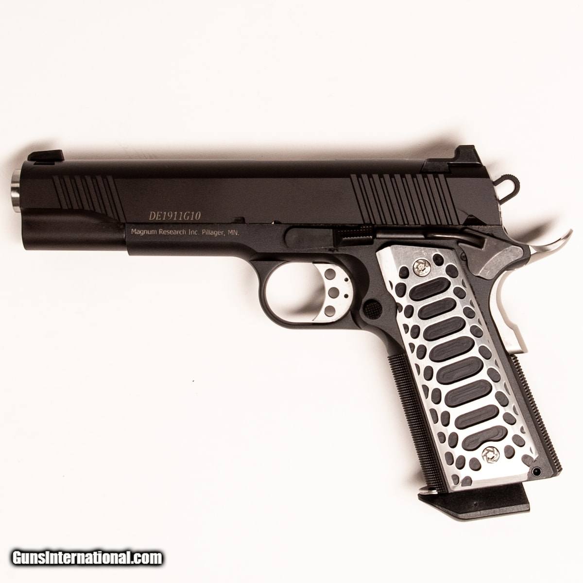 Description: Guns Listing ID: 608332 For sale is a Magnum Research DE1911G10. This is a 1911 chambered in 10mm. It is in excellent condition and includes grip and mag base plates. SOLD Manufacturer: MAGNUM RESEARCH Model: DE1911G10 Caliber Info: 10MM Condition: Used - Certified Barrels: 5 BARREL Finish: BLACK |