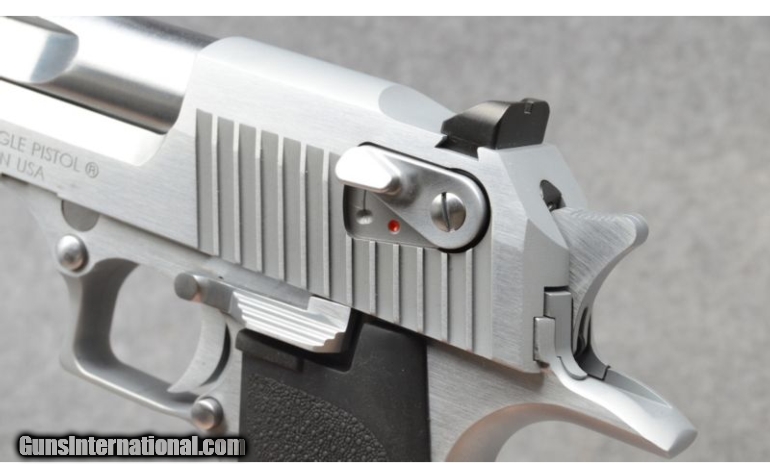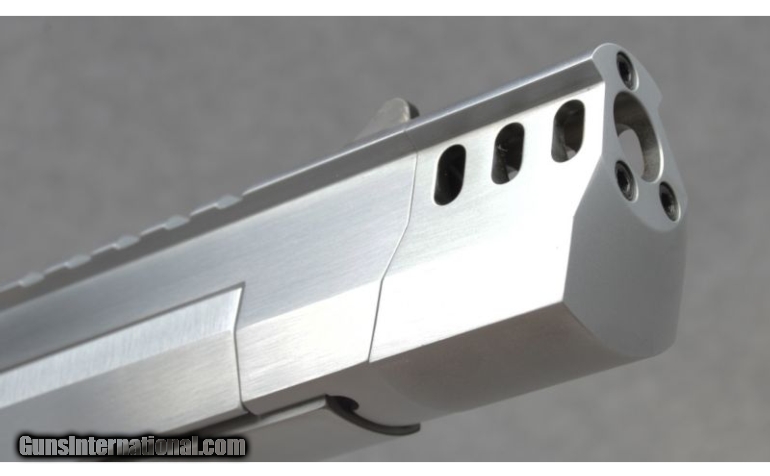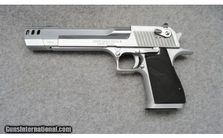 Description: SOLD Caliber Info: .50 AE Metal Condition: Fine scratches to the brushed stainless steel finish Bore Condition: Bright and shiny Barrels: 7 5/8" with muzzle break Triggers: Single action semi auto factory trigger Stock: One piece wrap around Hogue texturized black rubber grip Weight: 75 oz Sights: Dove tailed rear groved sight with dove tailed front blade sight Extras: Includes factory plastic case. Item Location: Fort Worth, TX |