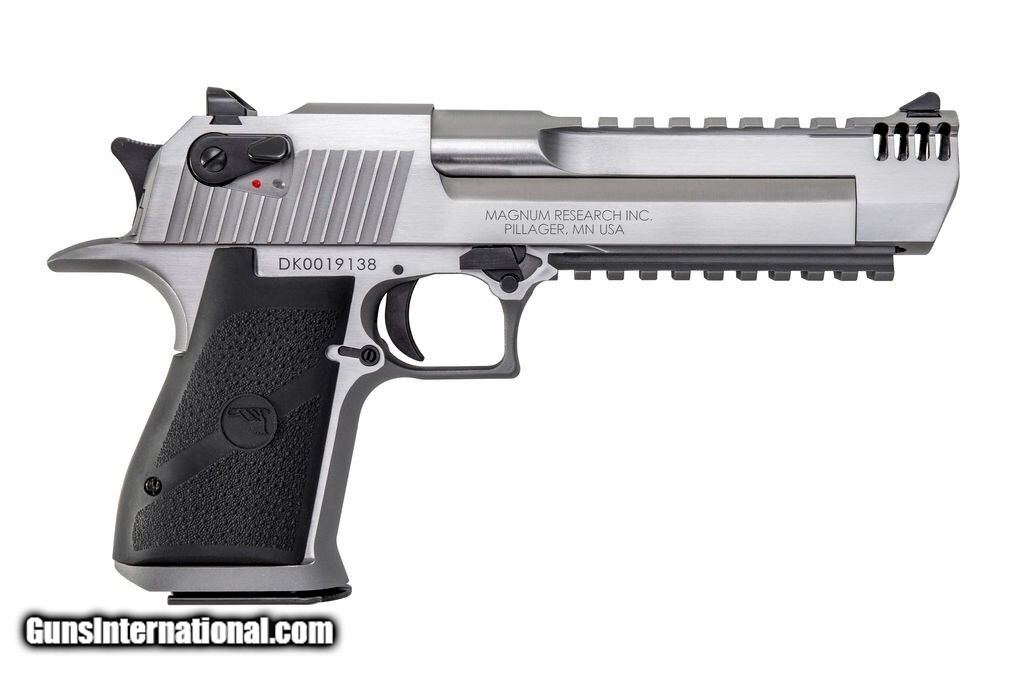 This listing is for one factory new Magnum Research Desert Eagle semi automatic pistol chambered for 50 AE caliber. Part # DE50SRMB. This pistol features a 6 inch barrel with integral muzzle break, combat type fixed sights, an ambidextrous thumb safety, stainless steel construction with a stainless finish, top and bottom picatinny rails, rubber grips, it comes with 1 - 7 round magazine. This pistol is Factory New and will ship in the original factory box with all paperwork and a safety lock.