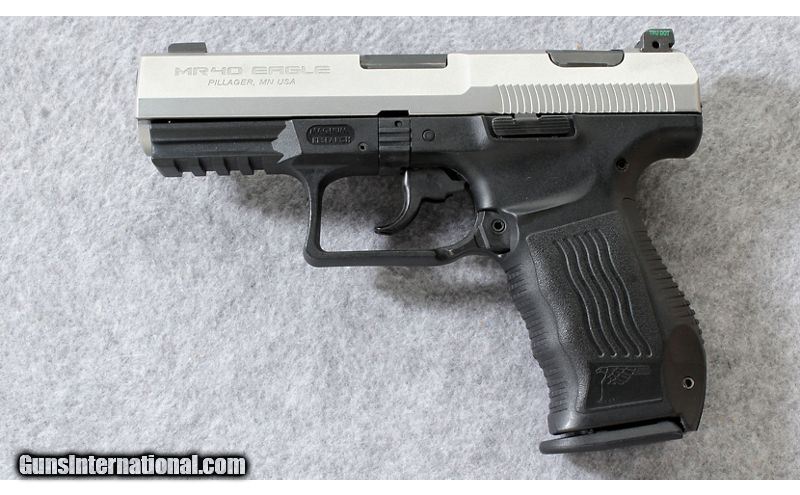 Description: Magnum Research MR40 Eagle pistol is a joint American/German effort featuring a black polymer frame with integral steel rails imported from Walther in Germany, a 416 stainless steel slide and a 4140 CrMo steel barrel machined in the USA and assembled and shipped from our Pillager, MN factory. The MR Eagle is a striker fire design. It features Magnum Researches "Fast Action" that allows de-cocking the striker so the first shot can be fired double action. Without de-cocking the MR40 Eagle functions like other striker fires pistols. Manufactured 2014. .40 S&W SOLD Metal Condition: Excellent Bore Condition: Excellent Barrels: 4.15 inch barrel Triggers: Fast action striker fire Weight: 27 oz. Sights: Three dot night sights Item Location: Lehi, UT |