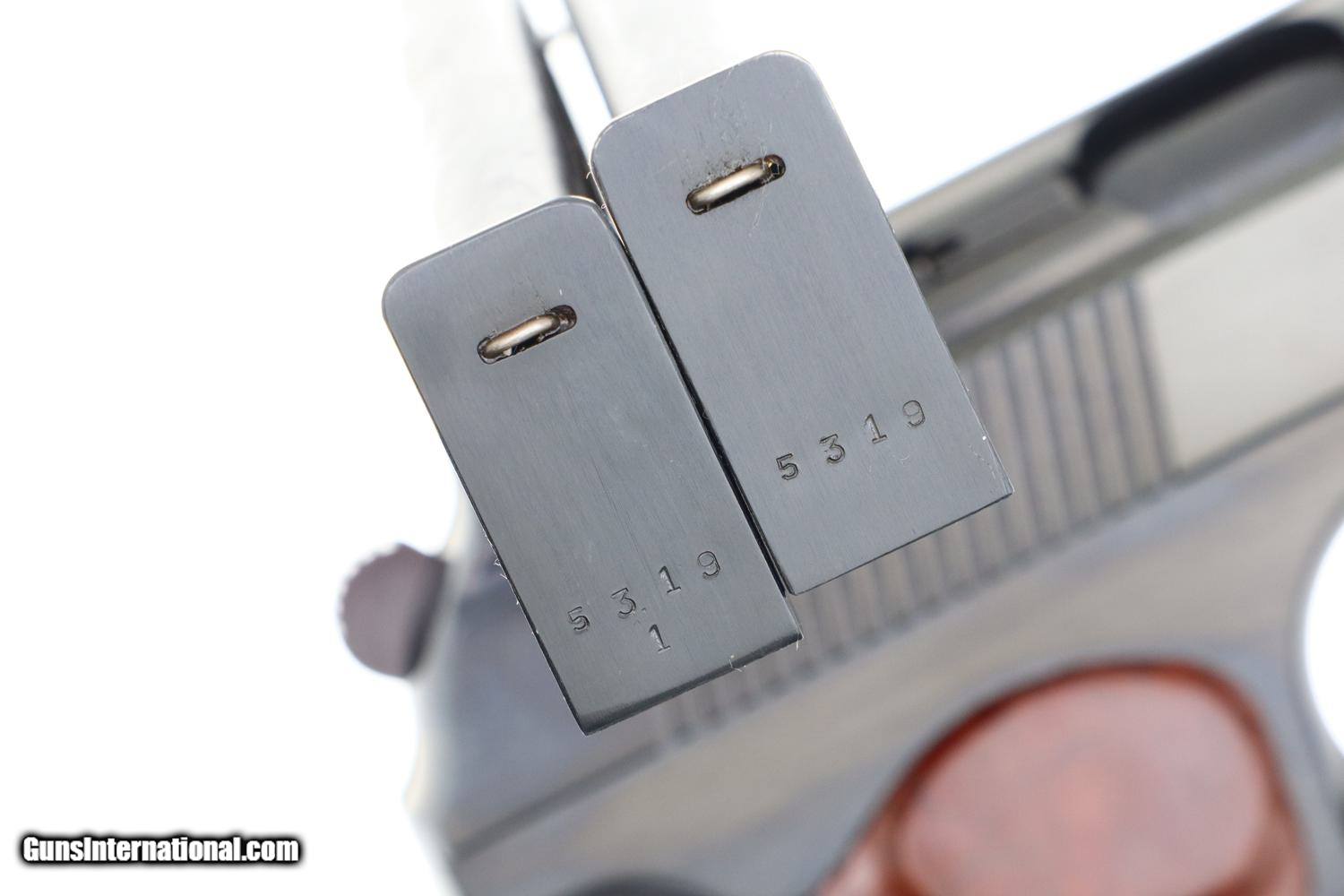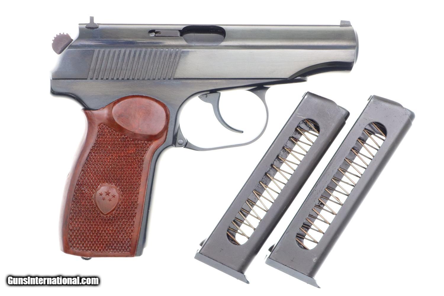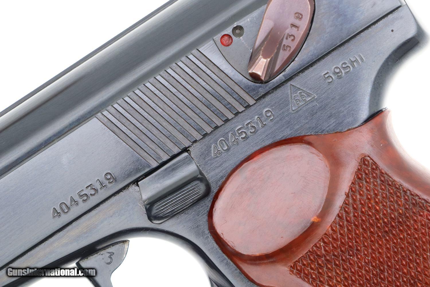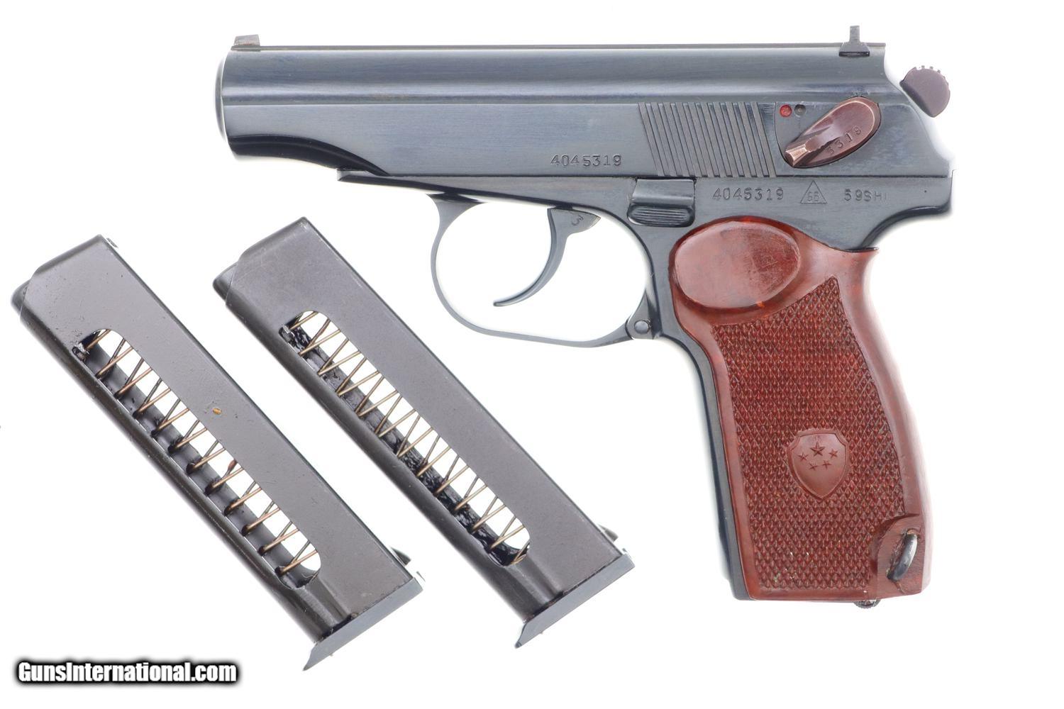 Description: Synopsis: Gorgeous, As New, Chinese Military Makarov, Two Factory Matching Magazines. Description: Beautiful, as new, standard configuration Chinese Military Makarov, cal 9mm, with two factory matching magazines. Pistol has fixed front sight and drift adjustable rear sight. Full serial number on left side of the slide, left side of frame, with the last four digits on the safety and electro-penciled on underside of trigger. Arsenal 66 marking on left side of frame, followed by “59SHI” denoting government issue Type 59. Single piece reddish maroon plastic grip with two checkered panels impressed with Shield adorned with five, 5-pointed stars. Two factory matching magazines, numbered on floorplate: primary mag with matching number, spare mag with an additional subnumber “1”. Condition: As new original blue with comparable condition grip and both magazines. Mirror bore. Perfect manual mechanics with each magazine. A virtually new Chinese Military Makarov pistol, with two matching factory magazines that would be impossible to upgrade!!!! ~~Insured shipping fee of $65; most packages shipped using FedEx 2nd Day.~~ SOLD Manufacturer: Chinese Serial Number: 4045319 Caliber Info: 9mm |