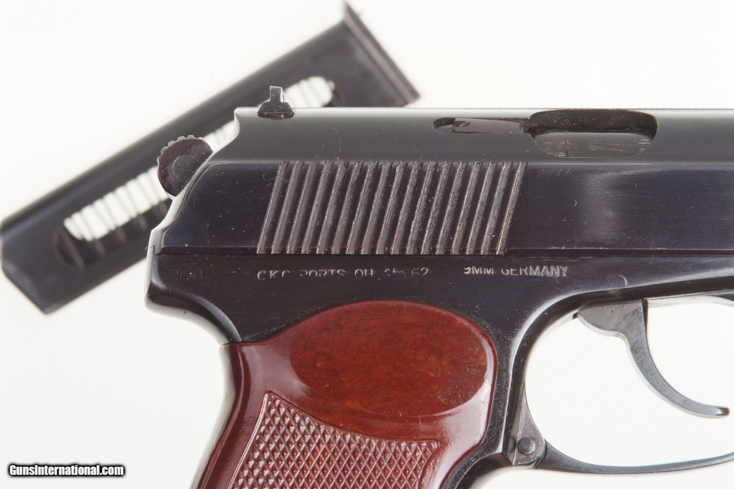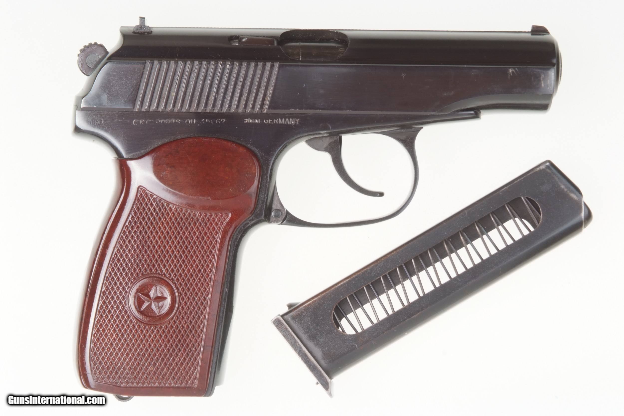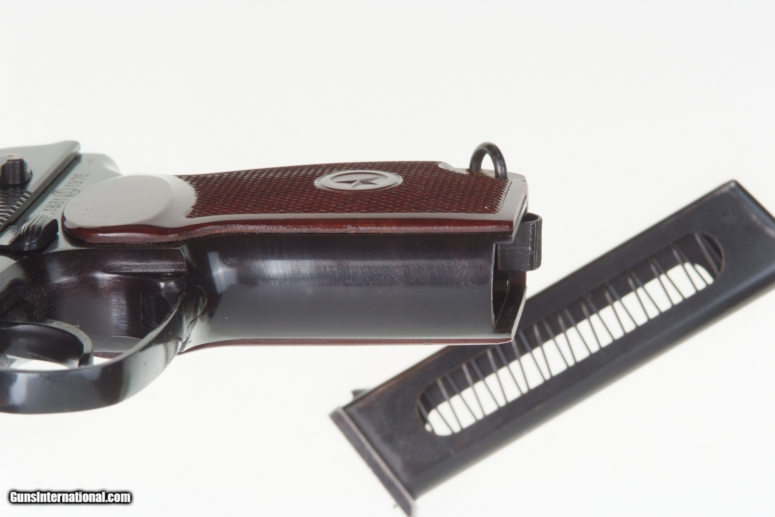 Description: Russian Military Makarov, dated 1976 with Unmarked Russian magazine. SN: KE1831. Cal. 9mm Mak. Standard configuration Makarov with fixed front and drift adjustable rear sight. Full serial number on left side of slide that is repeated on the left frame adjacent to the Izhvesk Arsenal symbol and the year 1976. Import marking on right frame. Usual reddish brown phenolic grips impressed with encircled 5 pointed star on each side. Lanyard ring. Russian Mag. Condition: Approximately 98% salt blue. Comparable or better condition grips. Near mirror bore. Perfect manual mechanics. A HISTORIC INVESTMENT! Buyer pays $40.00 shipping SOLD Manufacturer: Izhvesk Model: Makarov |