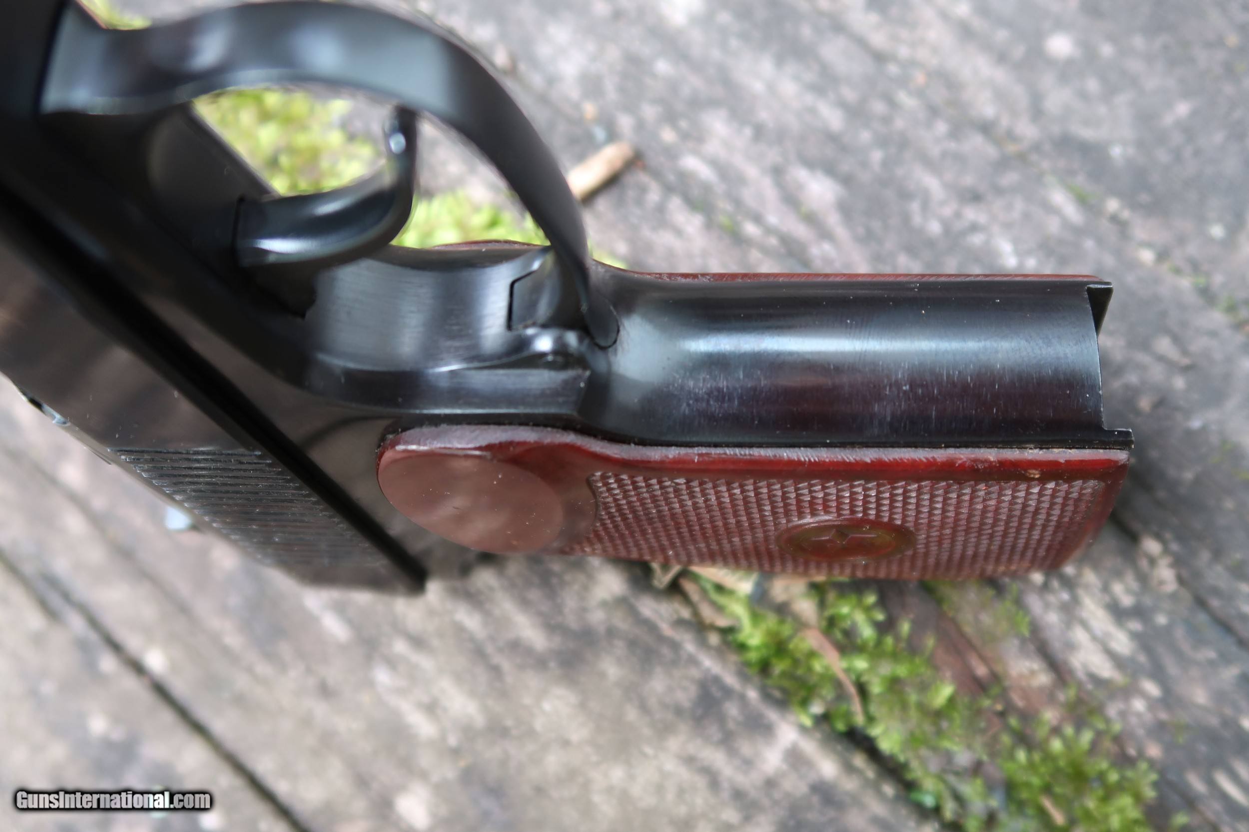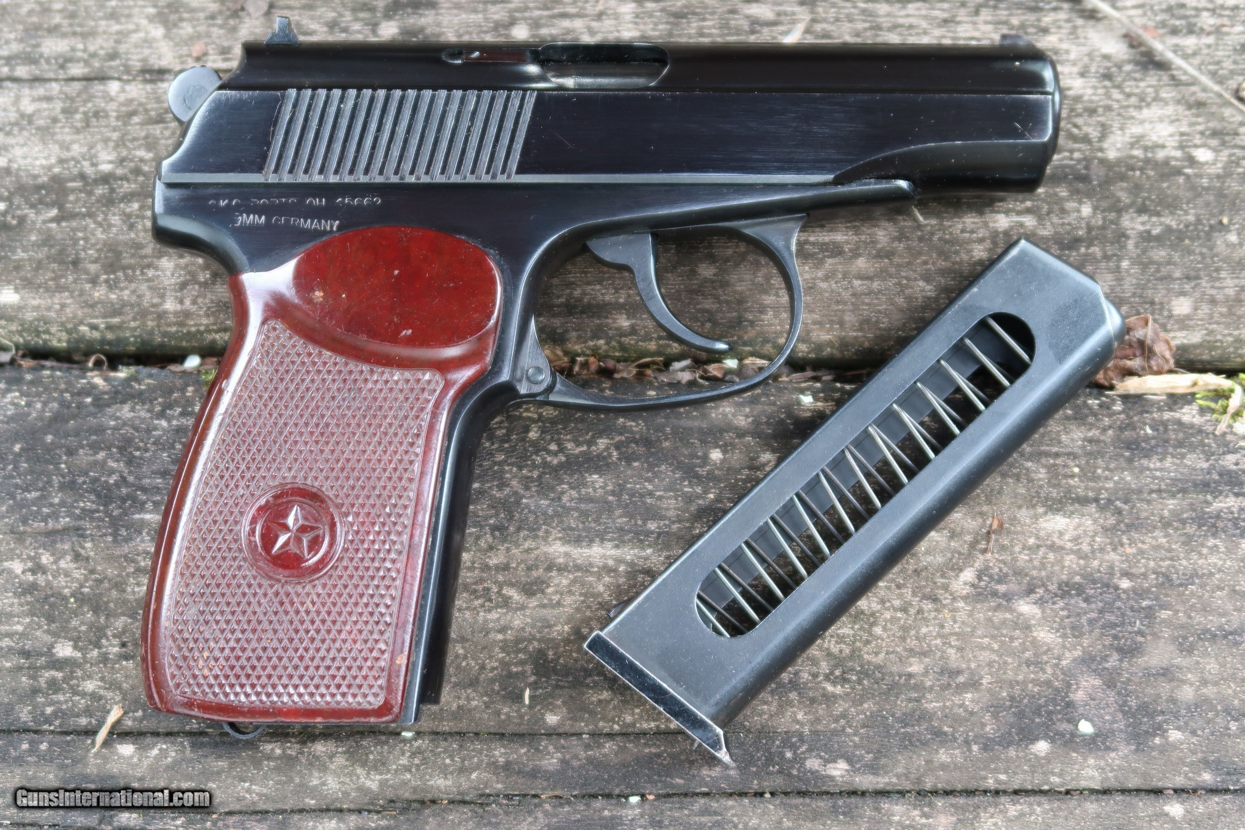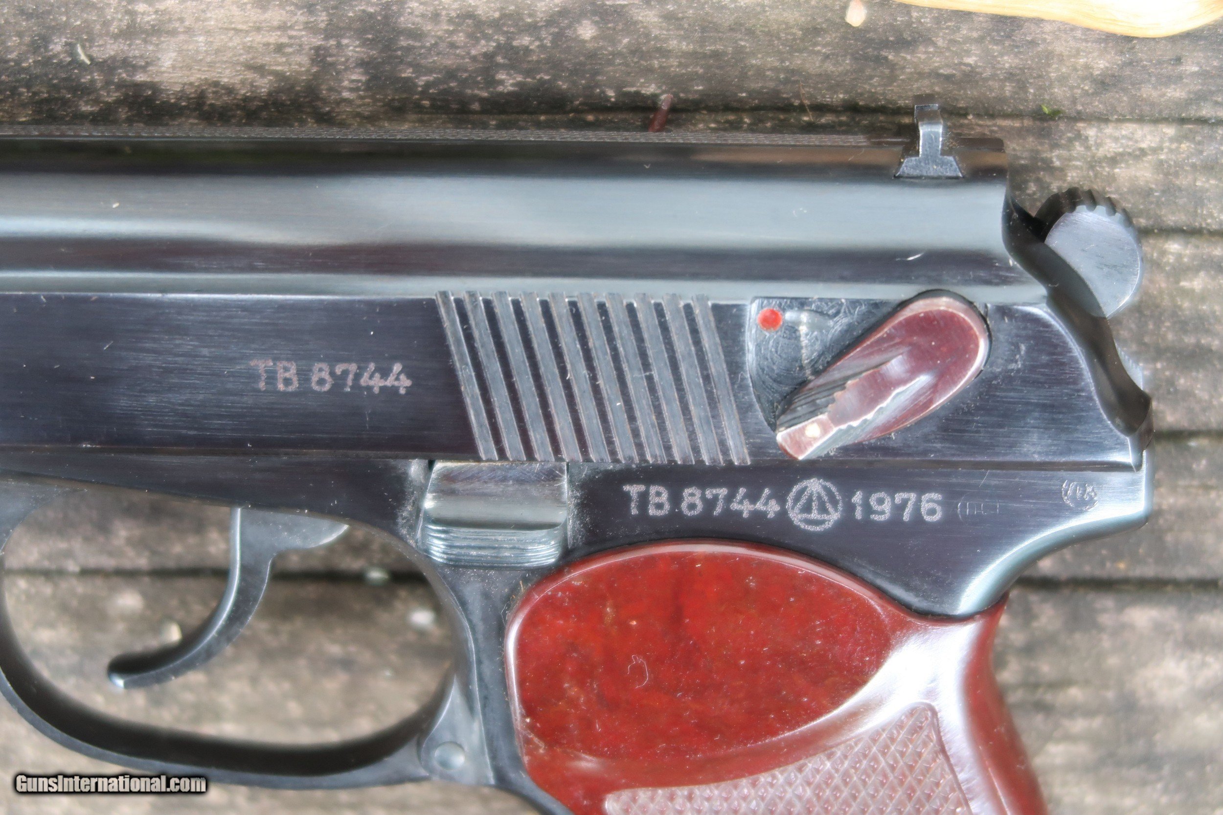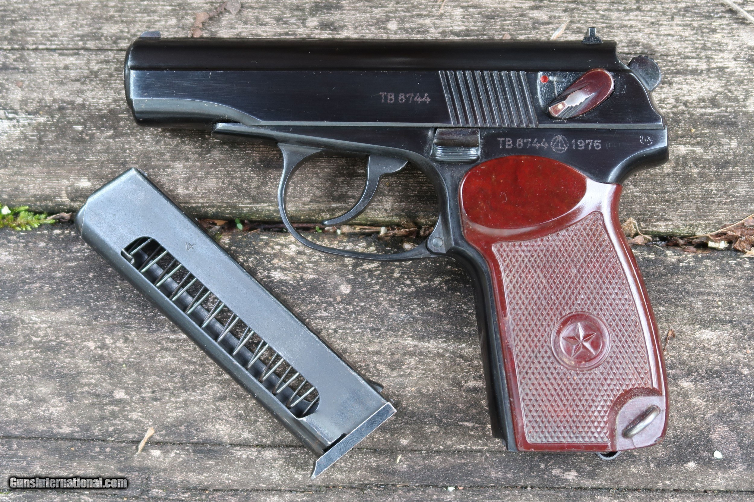 Description: Russian Military Makarov, dated 1976 with Unmarked Russian magazine. SN: TB 8744. Cal. 9mm Mak. Standard configuration Makarov with fixed front and drift adjustable rear sight. Full serial number on left side of slide that is repeated on the left frame adjacent to the Izhvesk Arsenal symbol and the year 1976. Import marking on right frame. Usual reddish brown phenolic grips impressed with encircled 5 pointed star on each side. Lanyard ring. Unmarked Russian Mag. Condition: Approximately 97-98% salt blue. Comparable or better condition grips. Near mirror bore. Perfect manual mechanics. A HISTORIC INVESTMENT! Buyer pays $40.00 shipping SOLD Manufacturer: Makarov Model: Makarov |