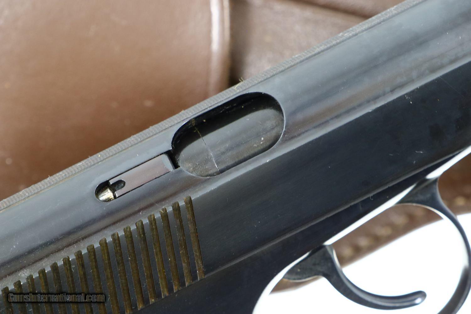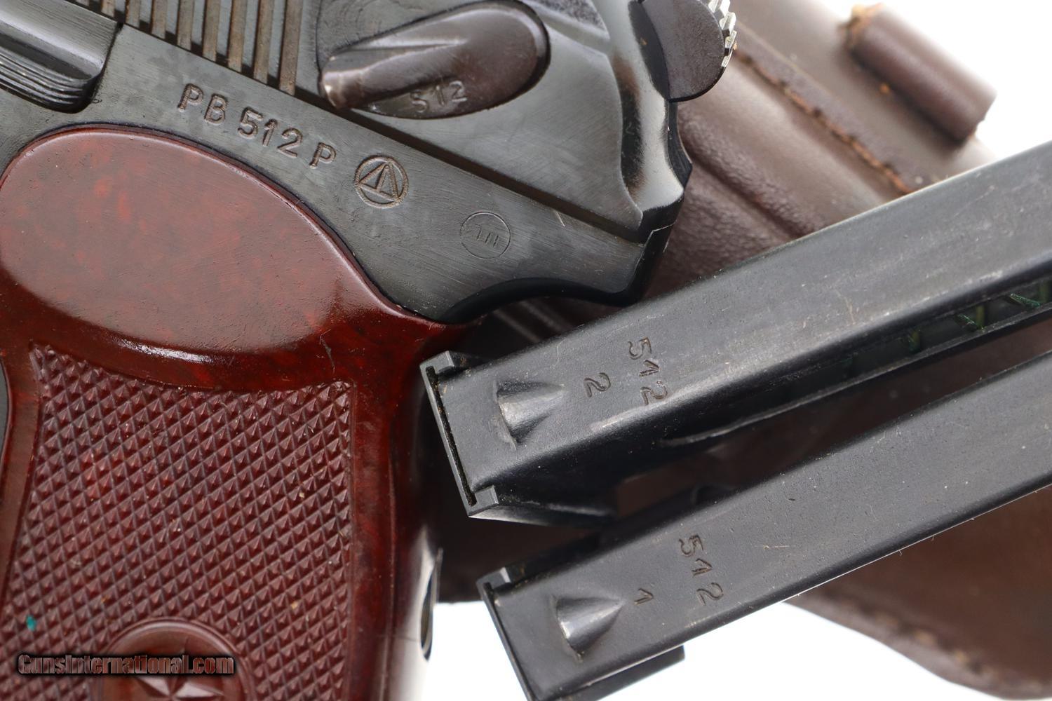 Description: Synopsis: Rare, High Condition, Russian Military, Makarov Rig, P Code Description: Standard configuration Makarov with fixed front sight and drift adjustable rear sight. Full serial number on left side of slide, safety, and left side of frame. Original factory-matching magazines sub numbered "1" and "2". Izhevsk Arsenal marking on left side of frame followed by “P” code reflecting manufacture in 1964. Import markings as imaged. Single piece reddish maroon plastic grip with two checkered panels impressed with encircled 5 pointed star. Correct later-year Russian holster, no cleaning rod, dated 72. Condition: Fantastic 99+% arsenal blue with comparable condition magazines. Mirror bore. Perfect manual mechanics with each magazine. Excellent holster with a few scuffs, missing cleaning rod. A beautiful and scarce ensemble with “P” code reflecting production in 1964. ~~Insured shipping fee of $65; most packages shipped using FedEx 2nd Day.~~ SOLD Manufacturer: Izhevsk Serial Number: PB512P Caliber Info: 9mmM |