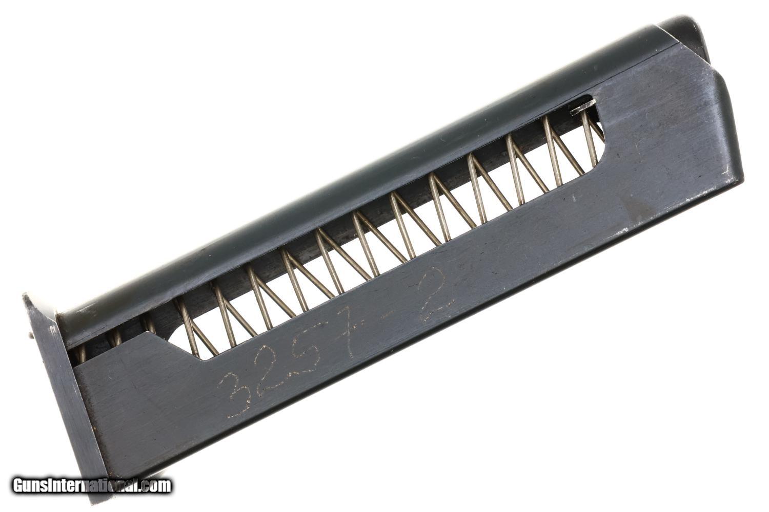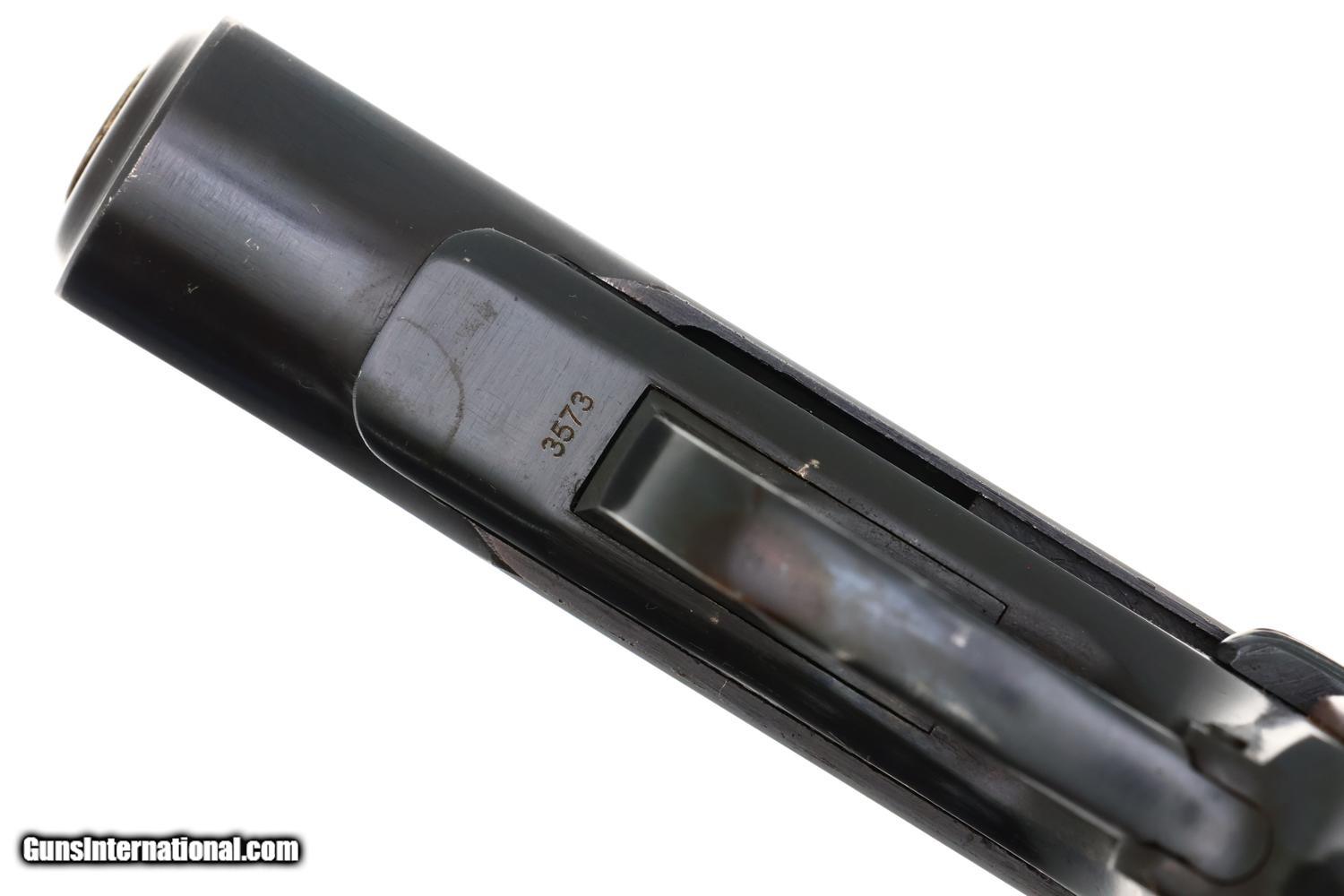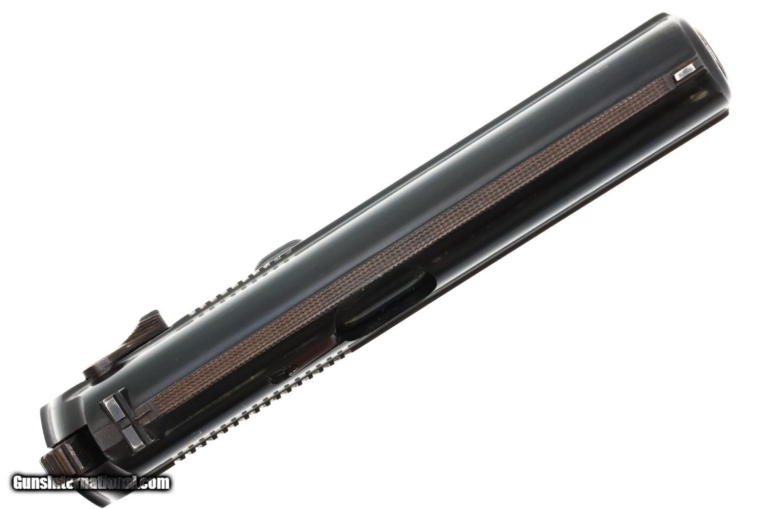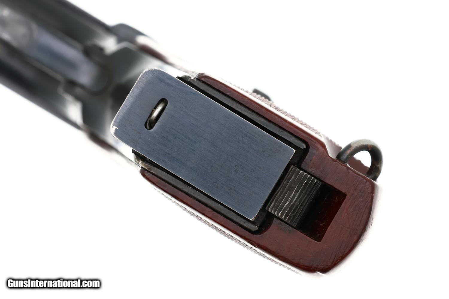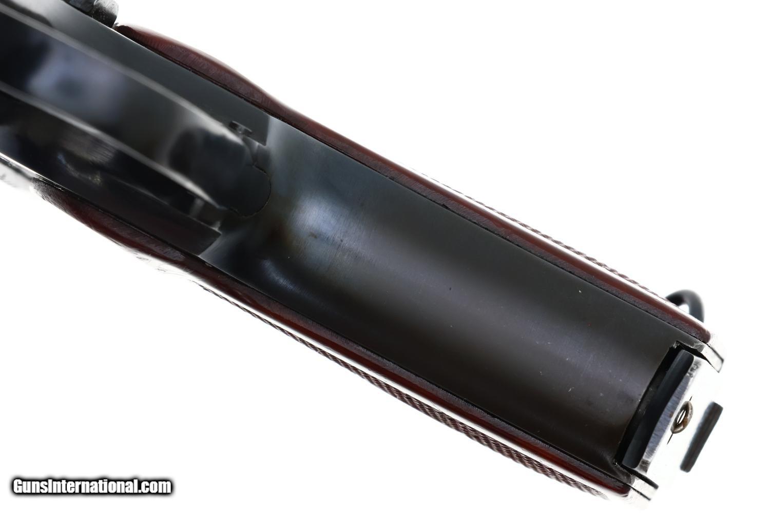 VG original salt blue with light carry wear as reflected by the rub marks around the muzzle, over crest/left side of slide, and a slight dulling of the front strap. Comparable condition grip with blunted checkering. Excellent magazine with minor insertional wear. Mirror bore. Correct manual mechanics.