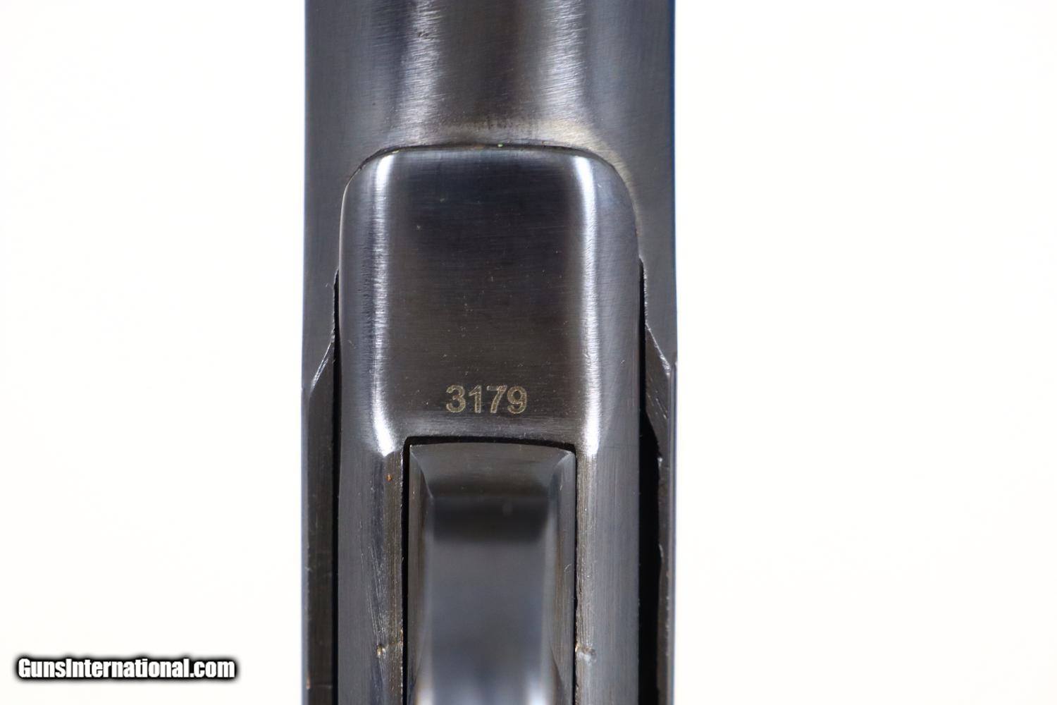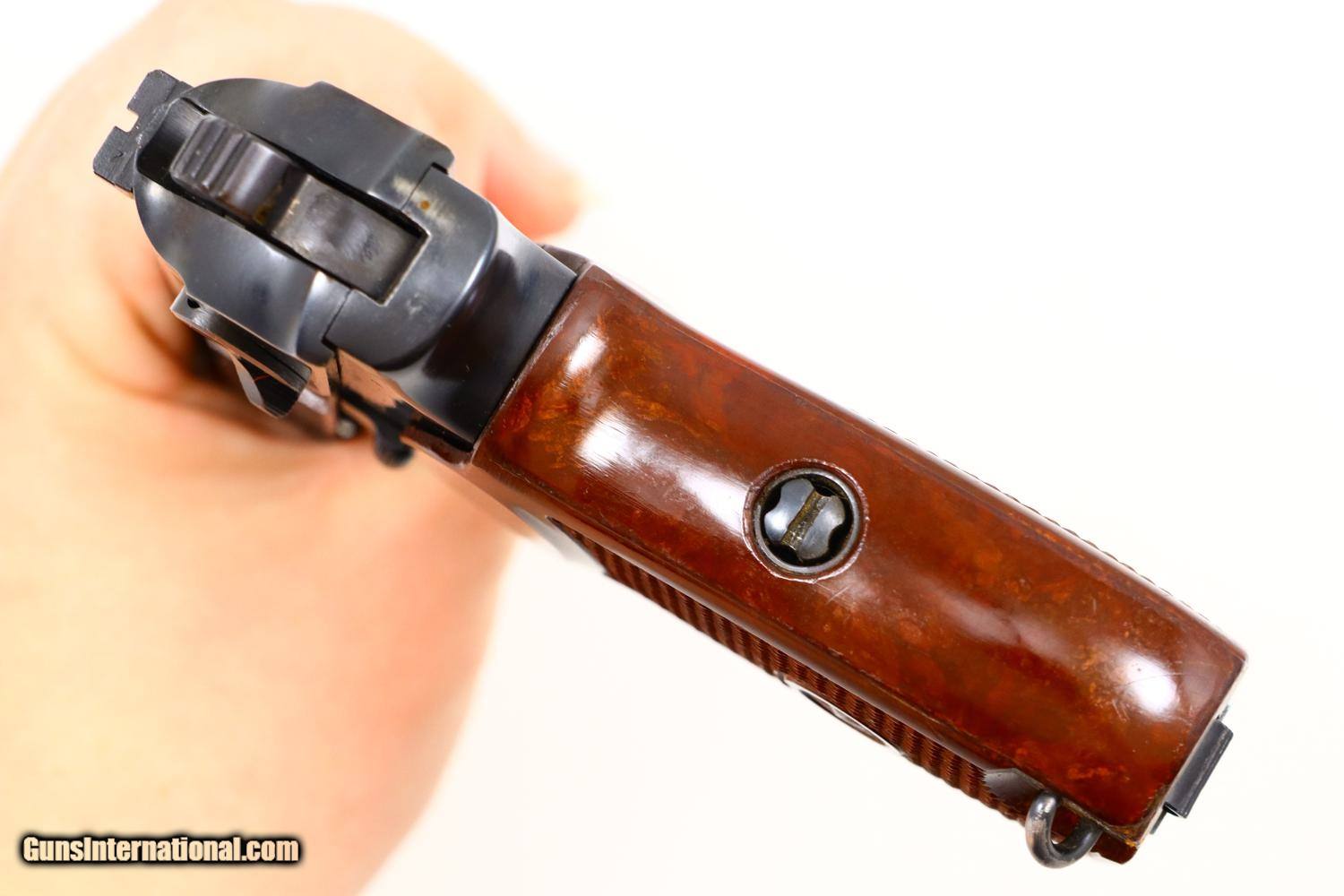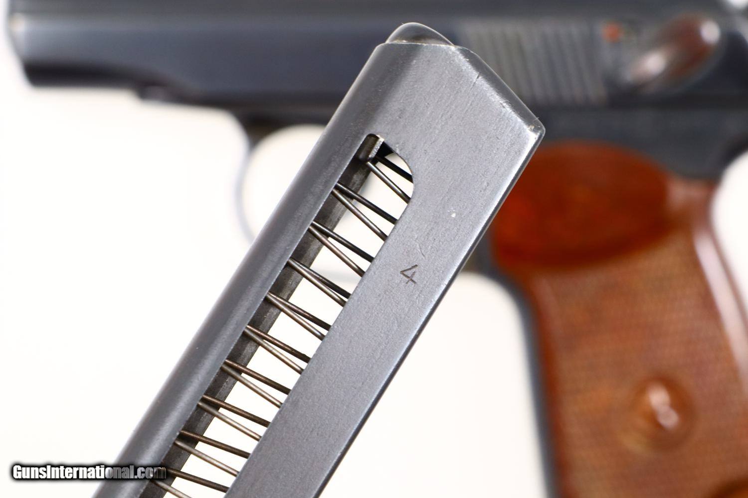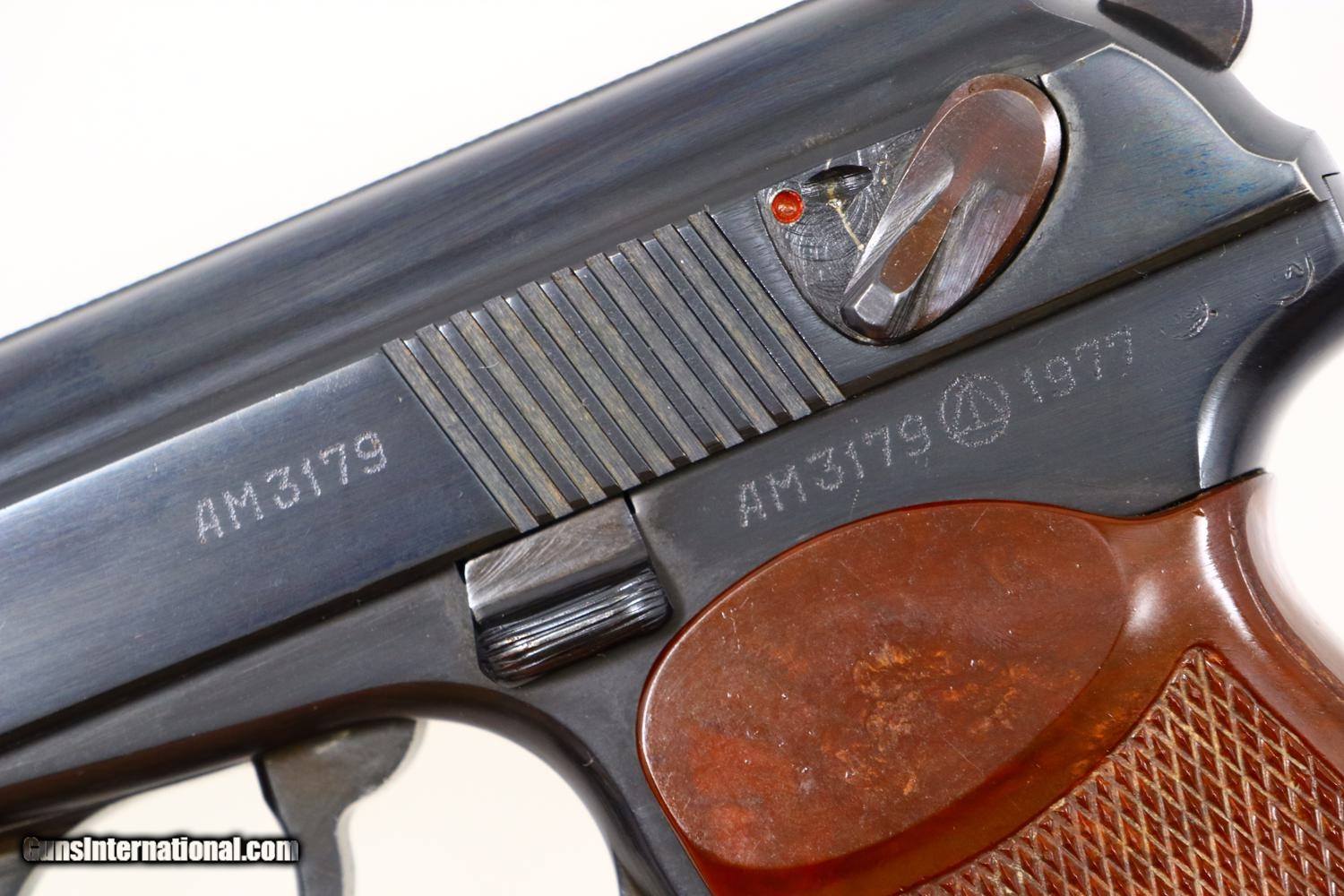 Description: Synopsis: Russian Izhevsk, Makarov, 1977 dated, 3179, A-716 Description: Standard configuration Makarov with fixed front sight and drift adjustable rear sight. Full serial number in front of trigger guard. Izhevsk Arsenal marking on left side of frame along with manufacturing date of "1977". TRA and Eagle/N stamped on right side of frame. Barrel engraved with Eagle/N and caliber “9mm Mak”. Standard configuration safety and unnumbered Russian-style magazine. Single piece reddish maroon plastic grip with two checkered panels impressed with encircled 5 pointed star. Condition: 99% bright original salt blue with negligible muzzle/holster wear as imaged. Bright bore. Perfect manual mechanics. ~~Insured shipping fee of $55; most packages shipped using FedEx 2nd Day.~~ SOLD Manufacturer: Russian Izhevsk Serial Number: 3179 Caliber Info: 9mm |