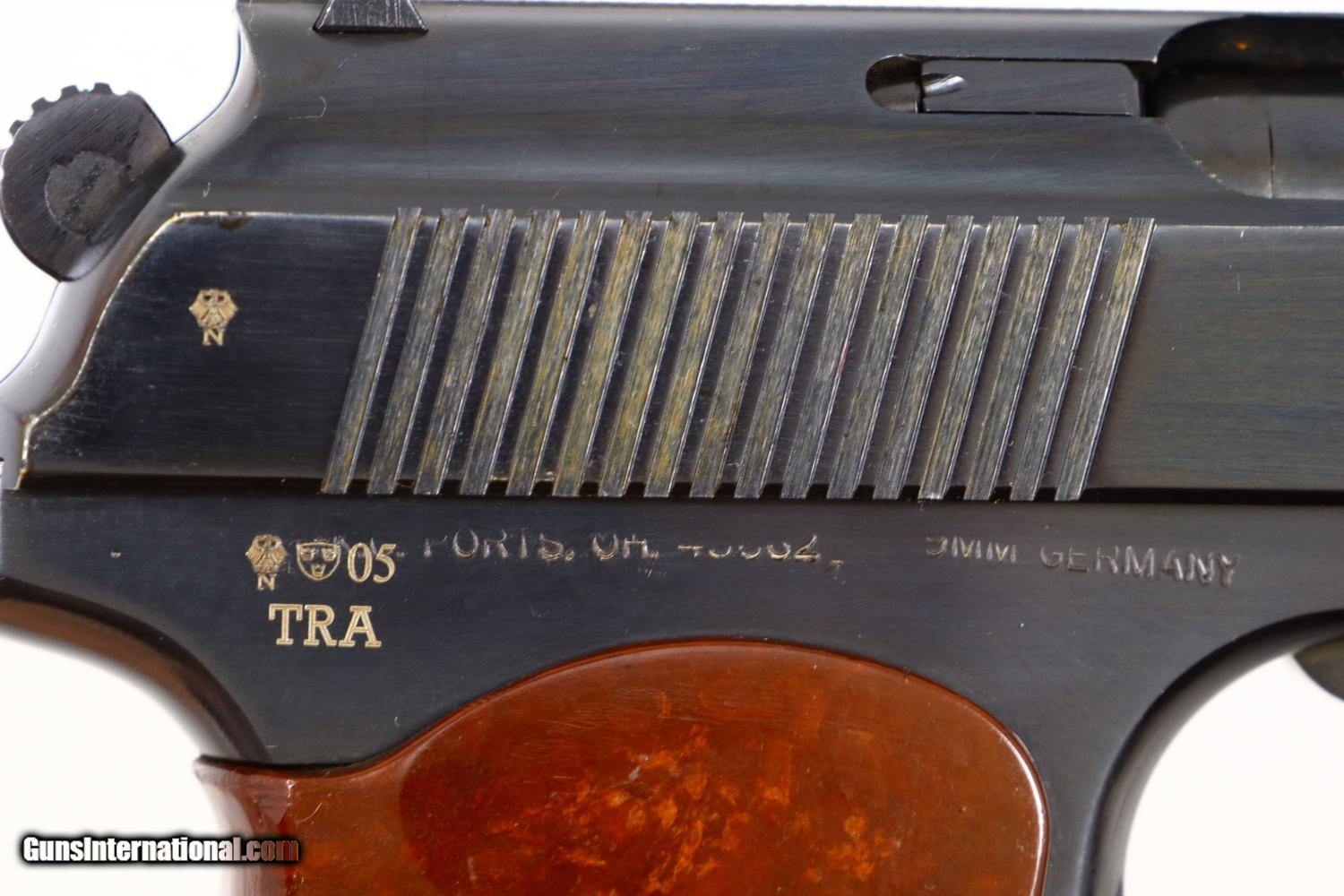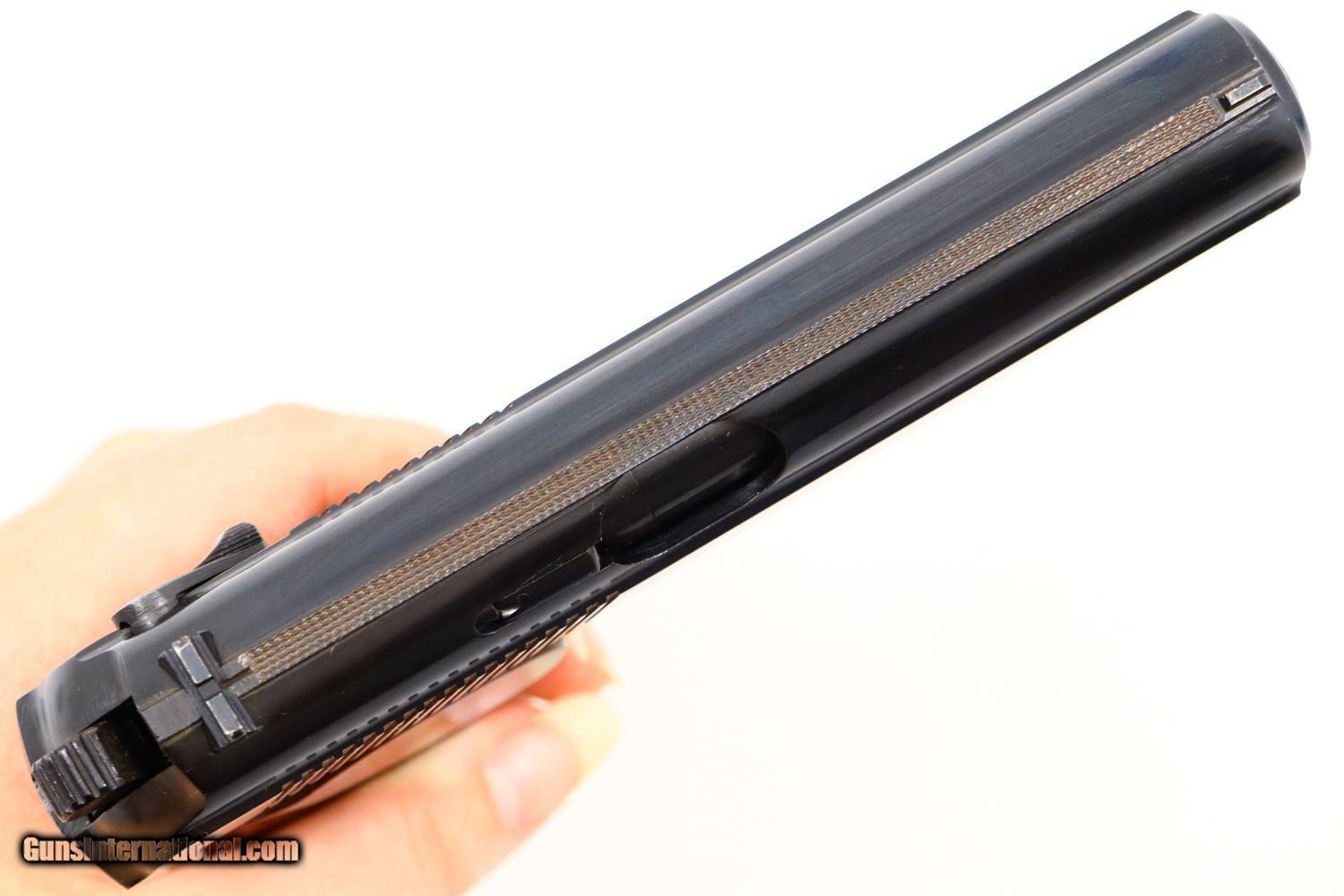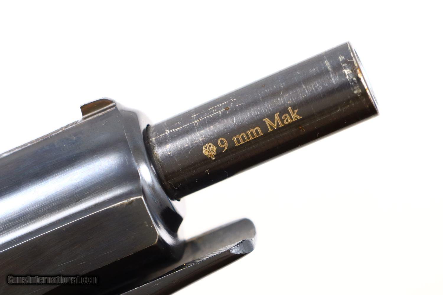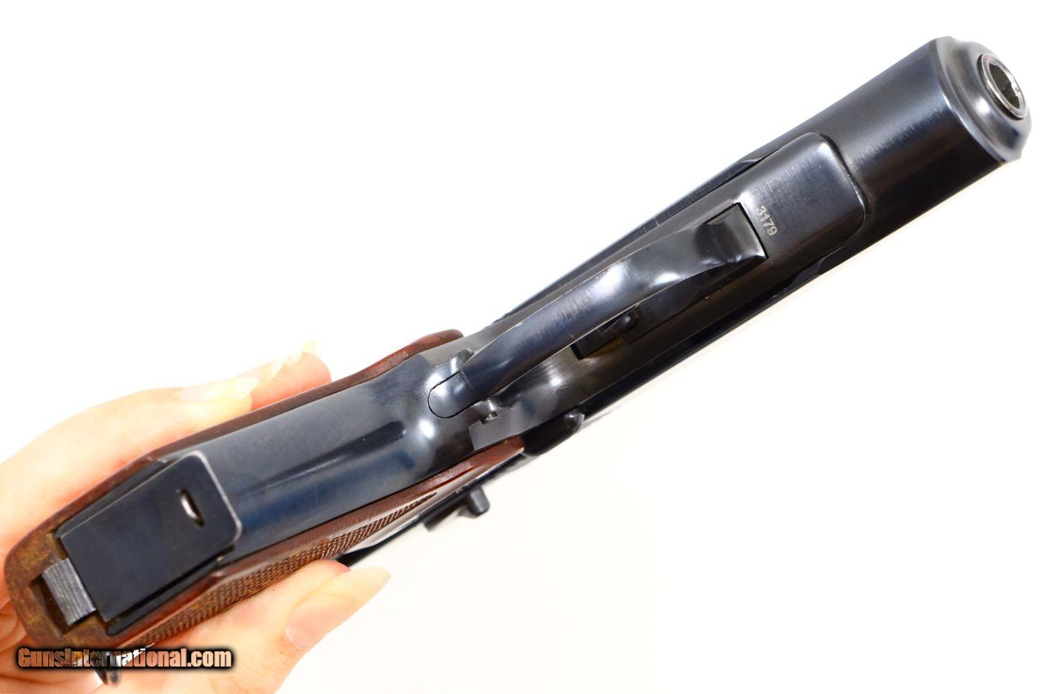 Description: Synopsis: Russian Izhevsk, Makarov, 1977 dated, 3179, A-716 Description: Standard configuration Makarov with fixed front sight and drift adjustable rear sight. Full serial number in front of trigger guard. Izhevsk Arsenal marking on left side of frame along with manufacturing date of "1977". TRA and Eagle/N stamped on right side of frame. Barrel engraved with Eagle/N and caliber “9mm Mak”. Standard configuration safety and unnumbered Russian-style magazine. Single piece reddish maroon plastic grip with two checkered panels impressed with encircled 5 pointed star. Condition: 99% bright original salt blue with negligible muzzle/holster wear as imaged. Bright bore. Perfect manual mechanics. ~~Insured shipping fee of $55; most packages shipped using FedEx 2nd Day.~~ SOLD Manufacturer: Russian Izhevsk Serial Number: 3179 Caliber Info: 9mm |