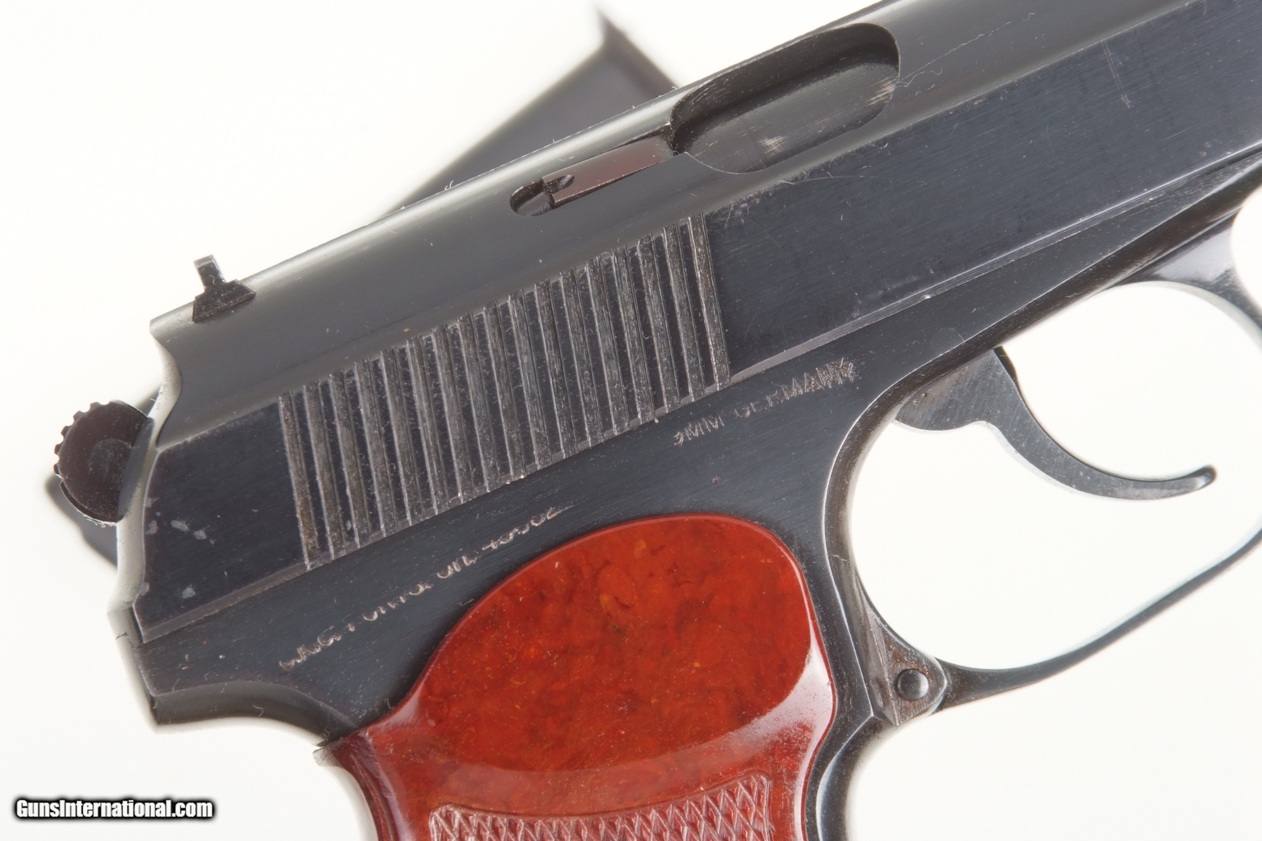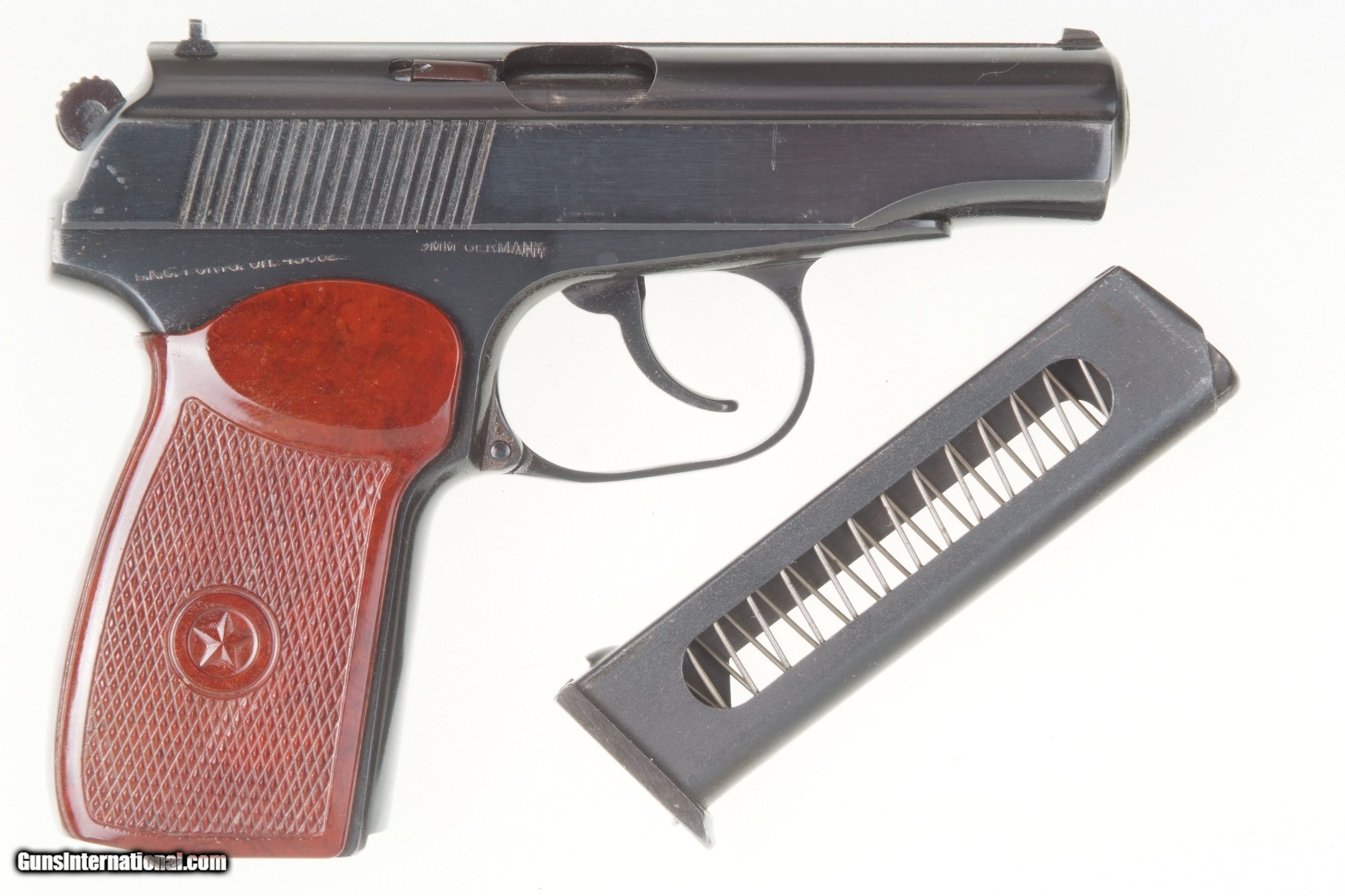 Description: Russian Military Makarov, dated 1977 with Bulgarian magazine. SN: AM3207. Cal. 9mm Mak. Standard configuration Makarov with fixed front and drift adjustable rear sight. Full serial number on left side of slide that is repeated on the left frame adjacent to the Izhevsk Arsenal symbol and the year 1977. Import marking on right frame. Usual reddish brown phenolic grips impressed with encircled 5 pointed star on each side. Lanyard ring. Bulgarian magazine marked “3088-2”. Condition: Approximately 97% salt blue. Comparable or better condition grips. Mirror bore. Perfect manual mechanics. A HISTORIC INVESTMENT! A-673. $675 +$40 shipping SOLD Curio/Relic: Yes Manufacturer: Izhevsk Model: Makarov |
