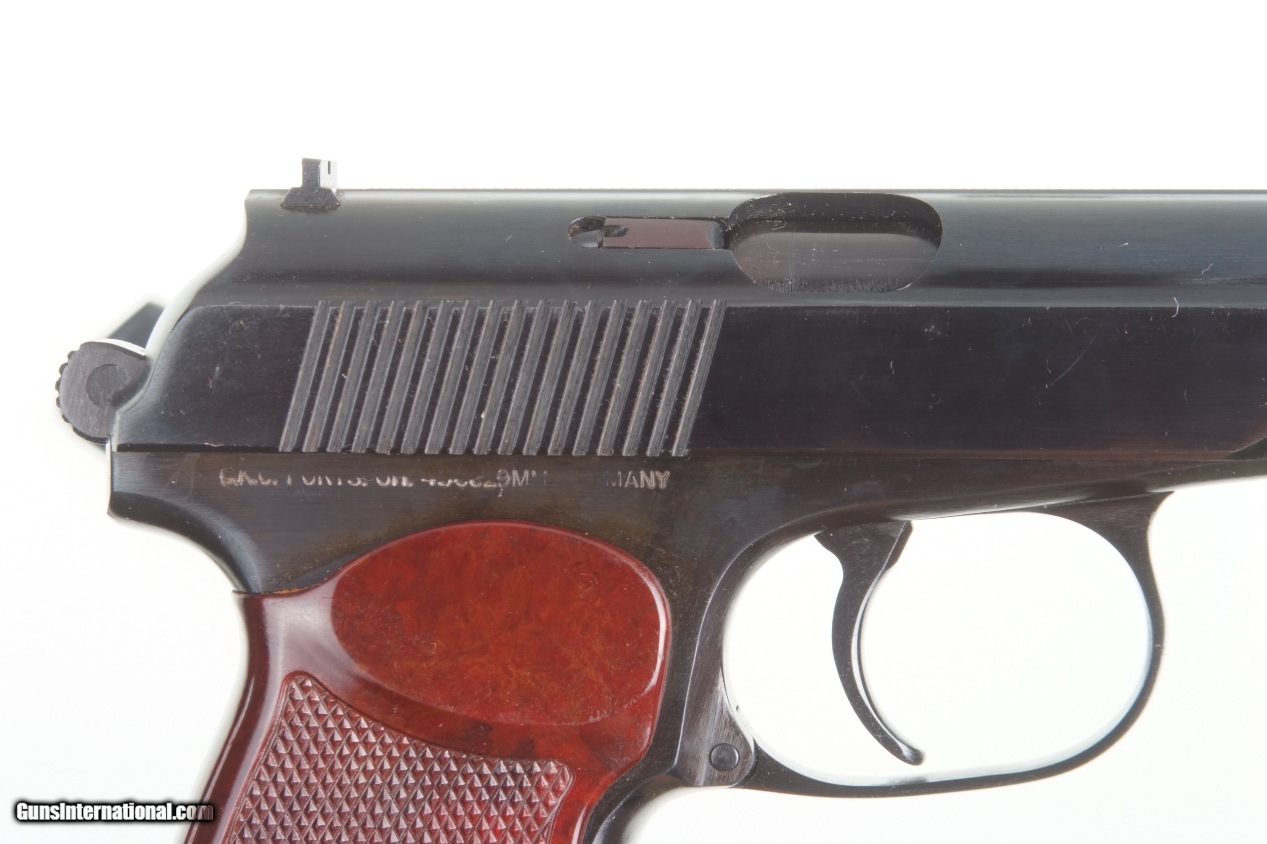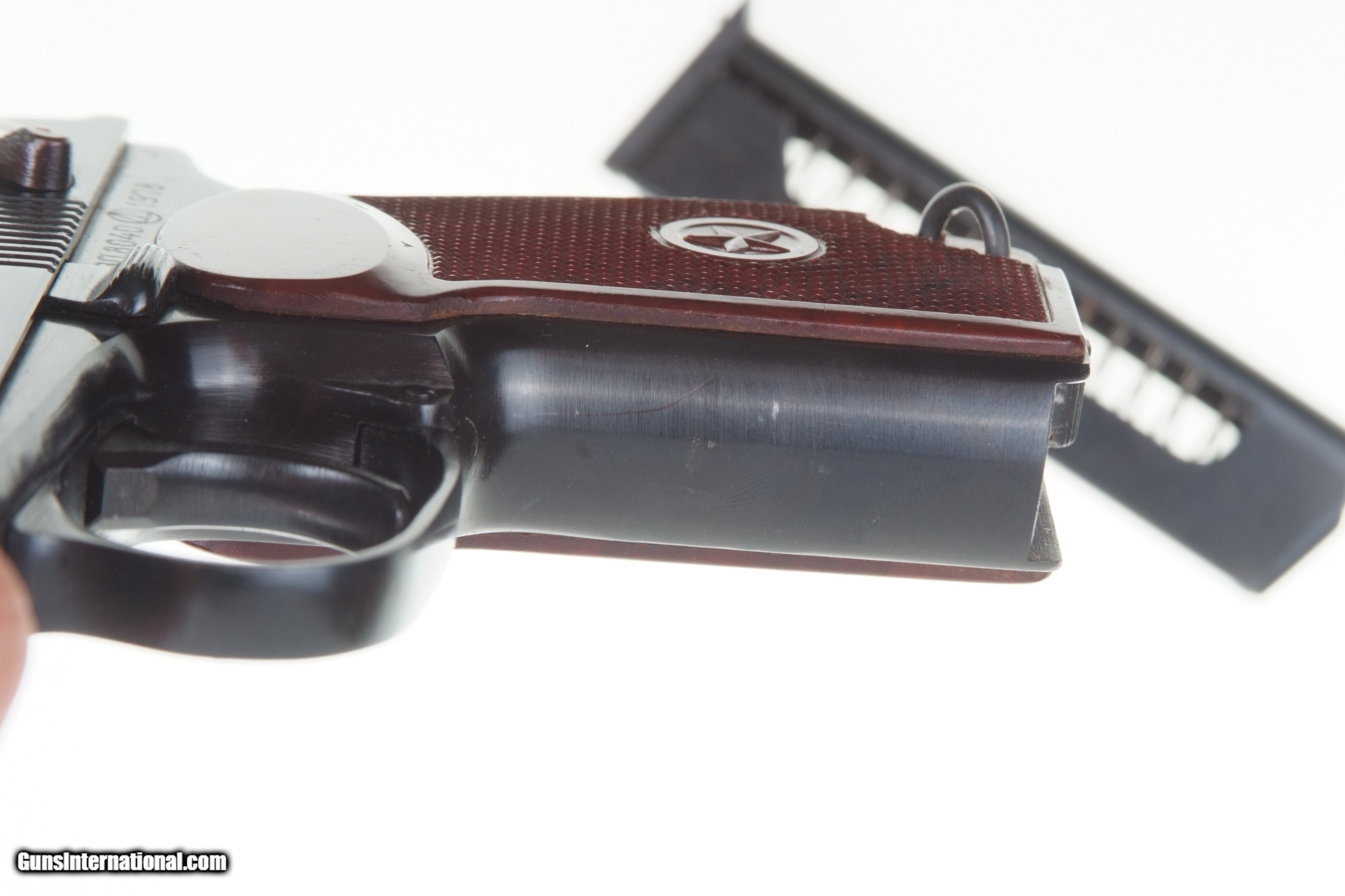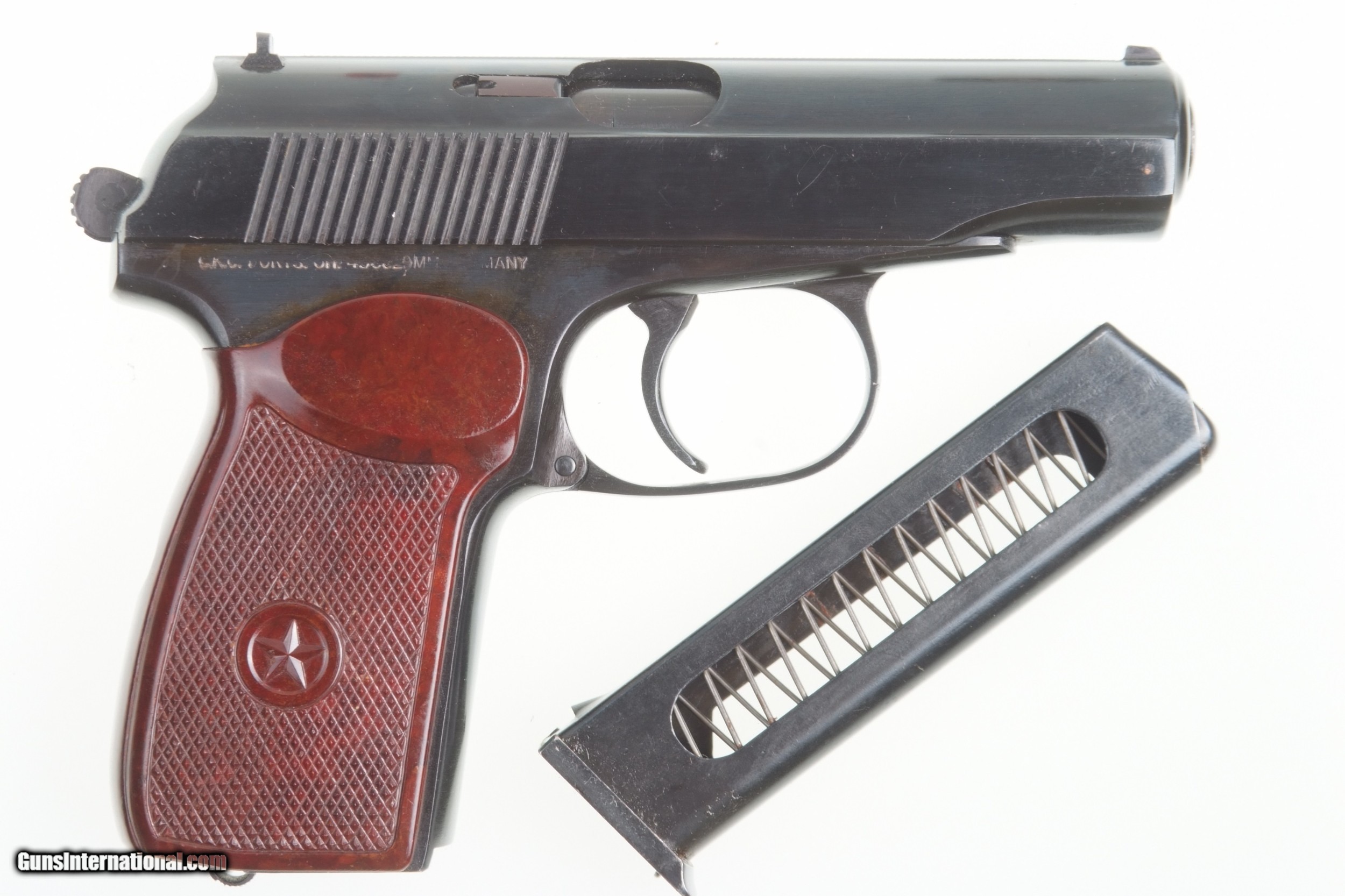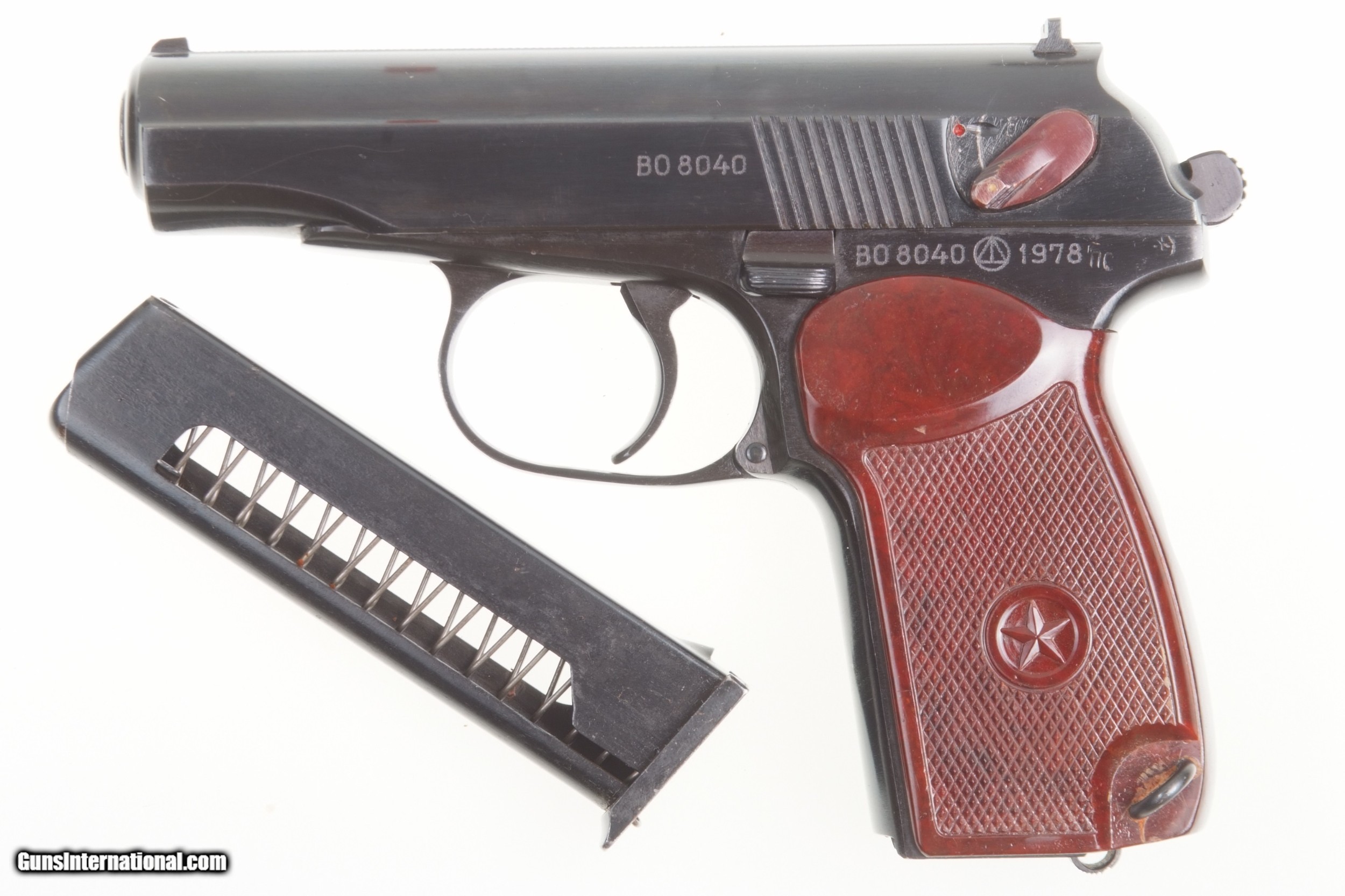 Description: Russian Military Makarov, dated 1976 with Bulgarian magazine. SN: BO8040. Cal. 9mm Mak. Standard configuration Makarov with fixed front and drift adjustable rear sight. Full serial number on left side of slide that is repeated on the left frame adjacent to the Izhvesk Arsenal symbol and the year 1976. Import marking on right frame. Usual reddish brown phenolic grips impressed with encircled 5 pointed star on each side. Lanyard ring. Unmarked Bulgarian magazine. Condition: Approximately 98% salt blue. Comparable or better condition grips. Mirror bore. Sharp rifling. Perfect manual mechanics. A HISTORIC INVESTMENT! A-677. $695. SOLD Curio/Relic: Yes Manufacturer: Izhevsk |