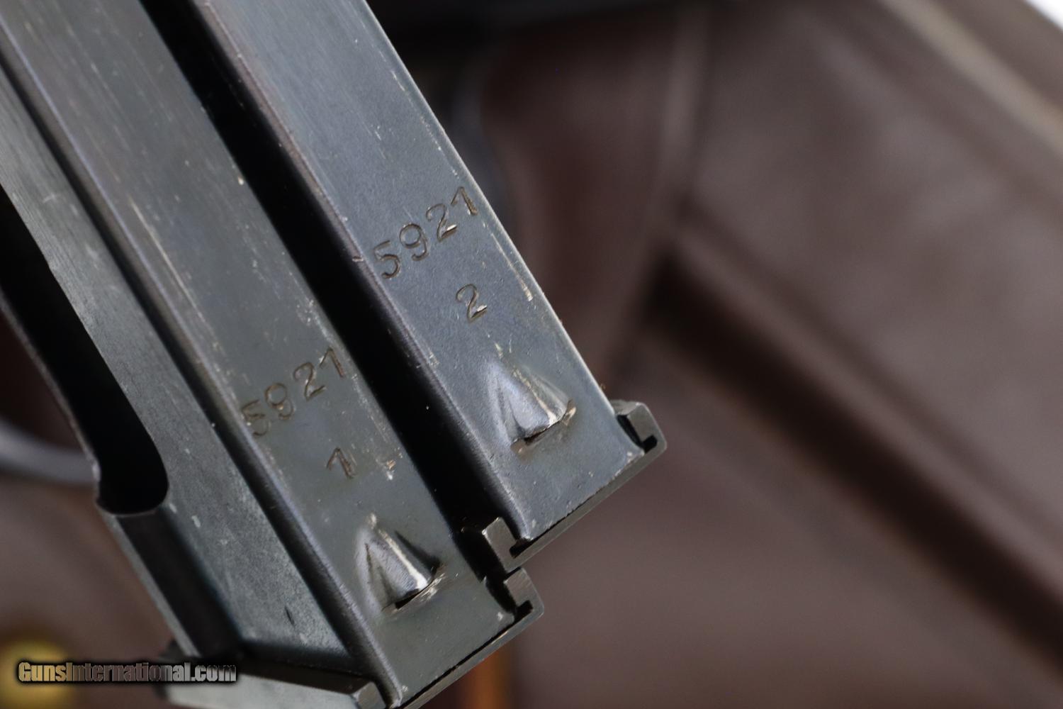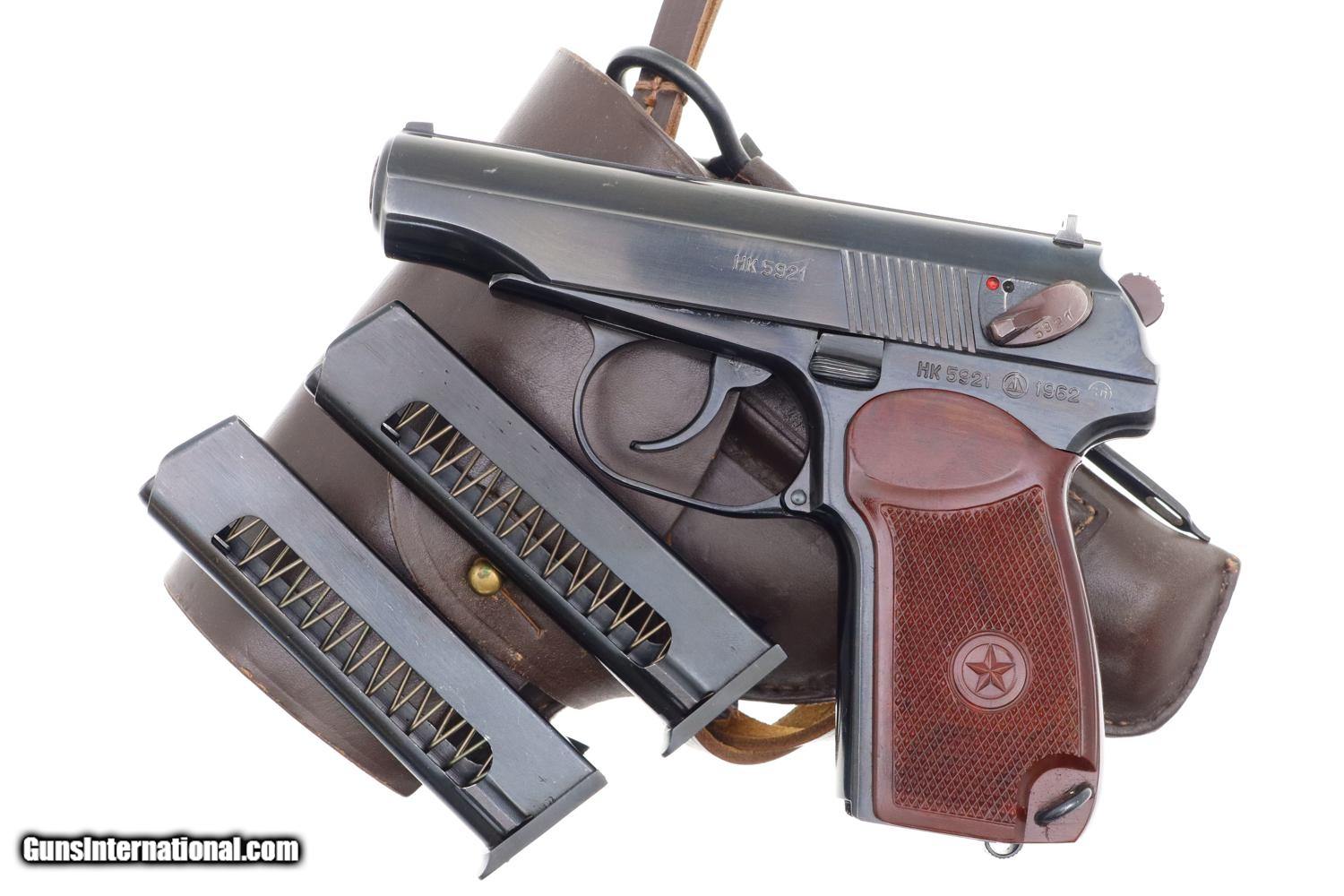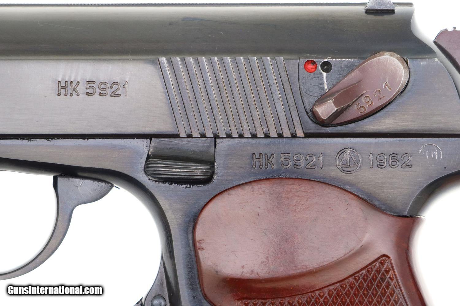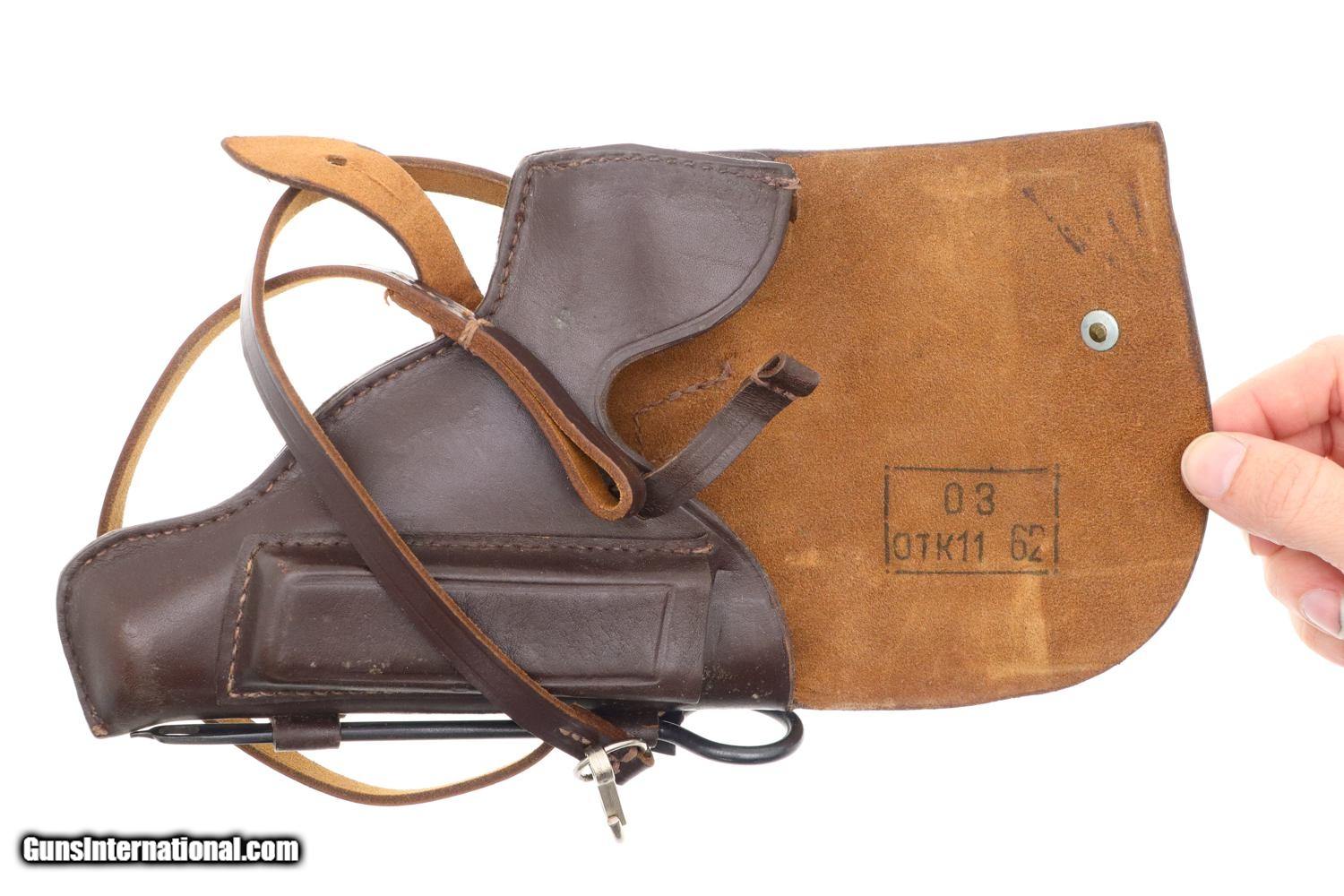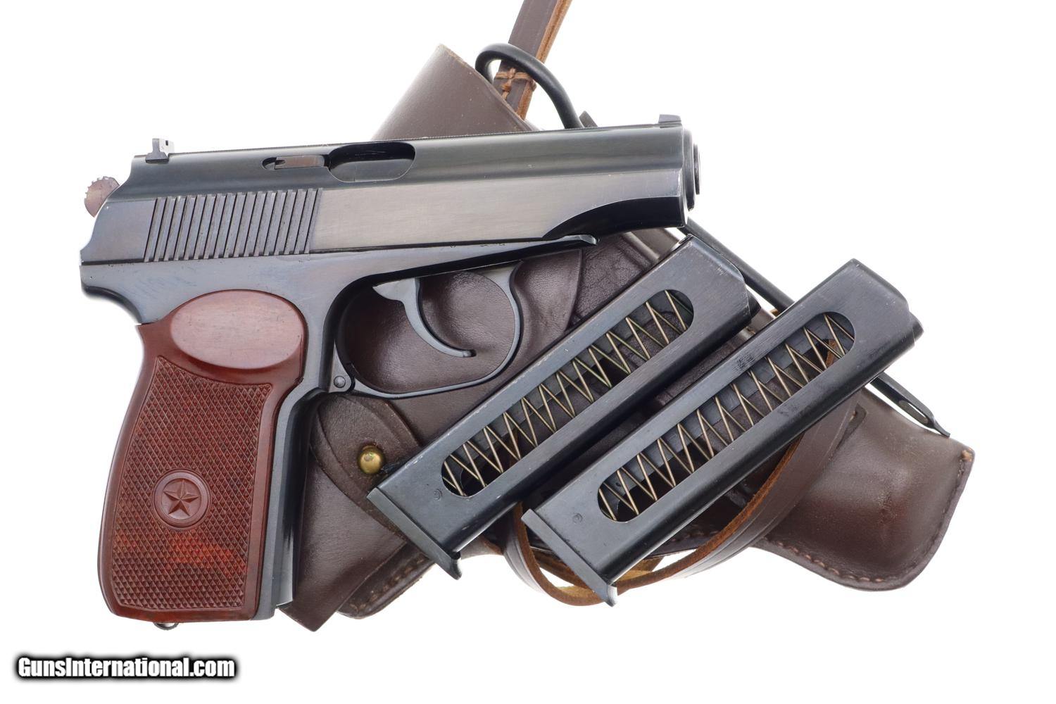 Description: Synopsis: Extraordinary Russian, Cold War Makarov, dated 1962, with two matching magazines and matching dated Russian Holster. Description: Gorgeous standard configuration Makarov, dated 1962, with fixed front sight and drift adjustable rear sight. Soviet Arsenal marking on left side of frame along with manufacturing date of "1962”. Standard configuration plum colored safety and two early factory matching Russian magazines. Single piece reddish maroon plastic grip with two checkered panels impressed with encircled 5 pointed star. Complete with matching dated holster with cleaning rod and straps. Condition: 99% bright original salt blue with just trace sharp edge wear at the muzzle. Mirror bore. Perfect manual mechanics with both magazines. A gorgeous and all original example with two matching magazines and NO IMPORT MARKS! Impossible to improve upon! ~~Insured shipping fee of $75; most packages shipped using FedEx 2nd Day.~~ SOLD Manufacturer: Soviet Union Serial Number: HK5921 Caliber Info: 9mm |