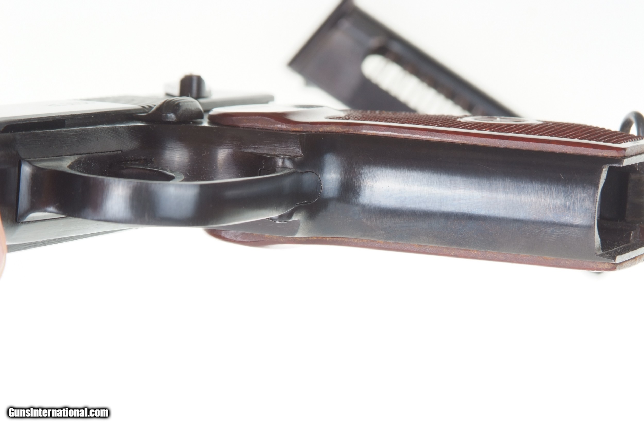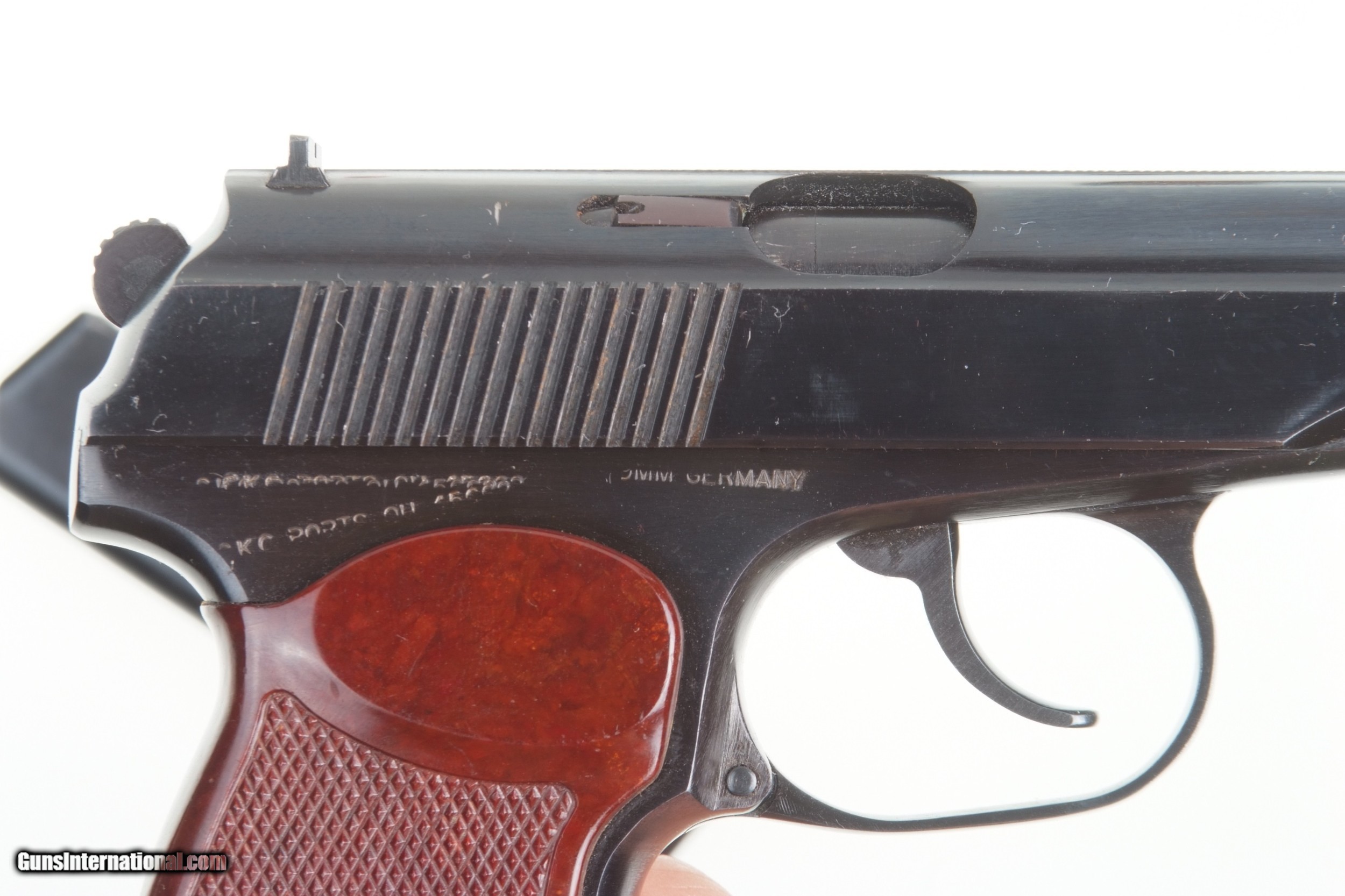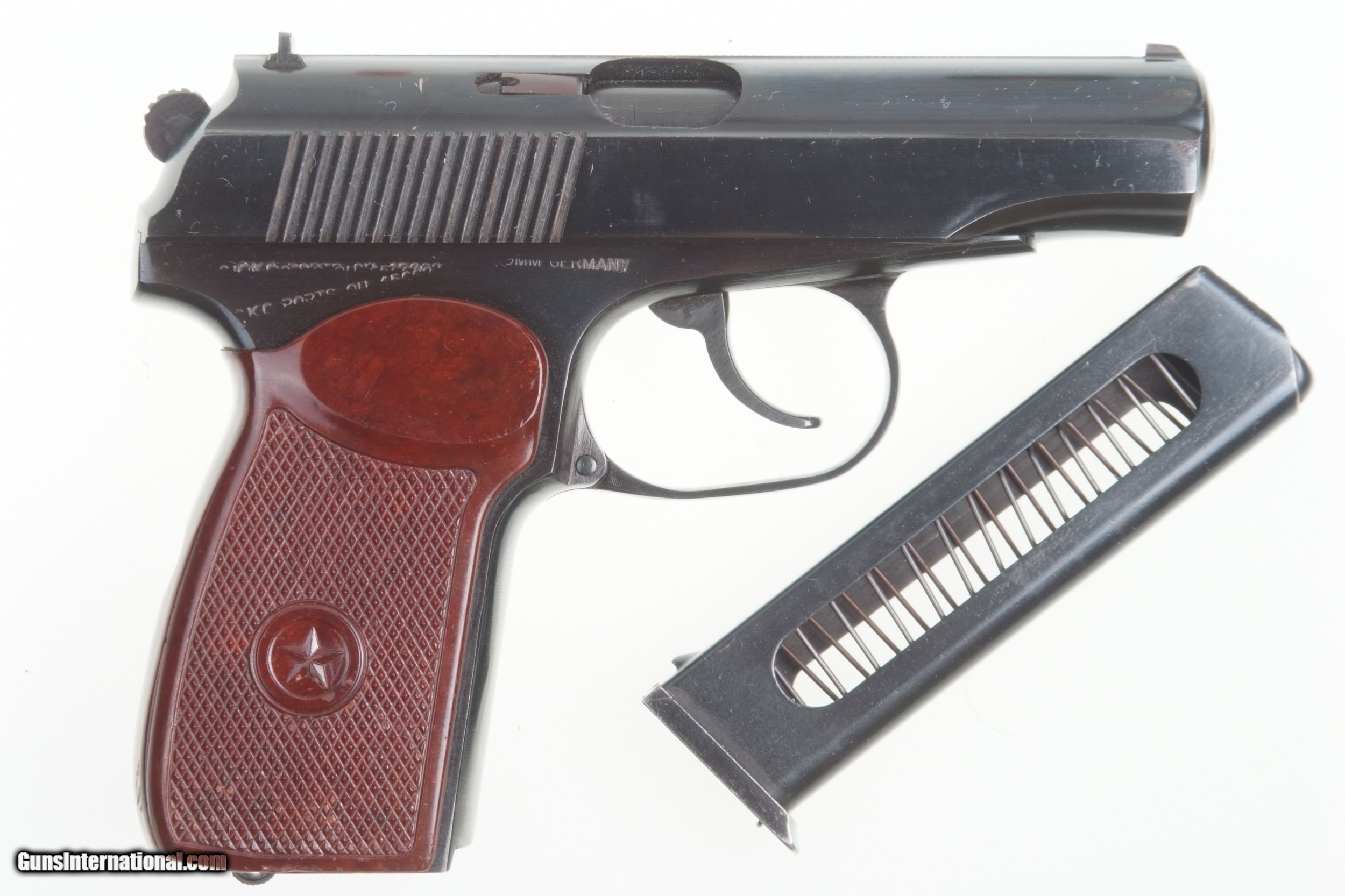 Description: Russian Military Makarov, dated 1976 with Russian magazine. SN: KE0656. Cal. 9mm Mak. Standard configuration Makarov with fixed front and drift adjustable rear sight. Full serial number on left side of slide that is repeated on the left frame adjacent to the Izhvesk Arsenal symbol and the year 1976. Import marking on right frame. Usual reddish brown phenolic grips impressed with encircled 5 pointed star on each side. Lanyard ring. Unmarked Russian magazine. Condition: Approximately 98% salt blue. Comparable or better condition grips. Mirror bore. Perfect manual mechanics. A HISTORIC INVESTMENT! A-418. $695. SOLD Curio/Relic: Yes Manufacturer: Izhevsk |