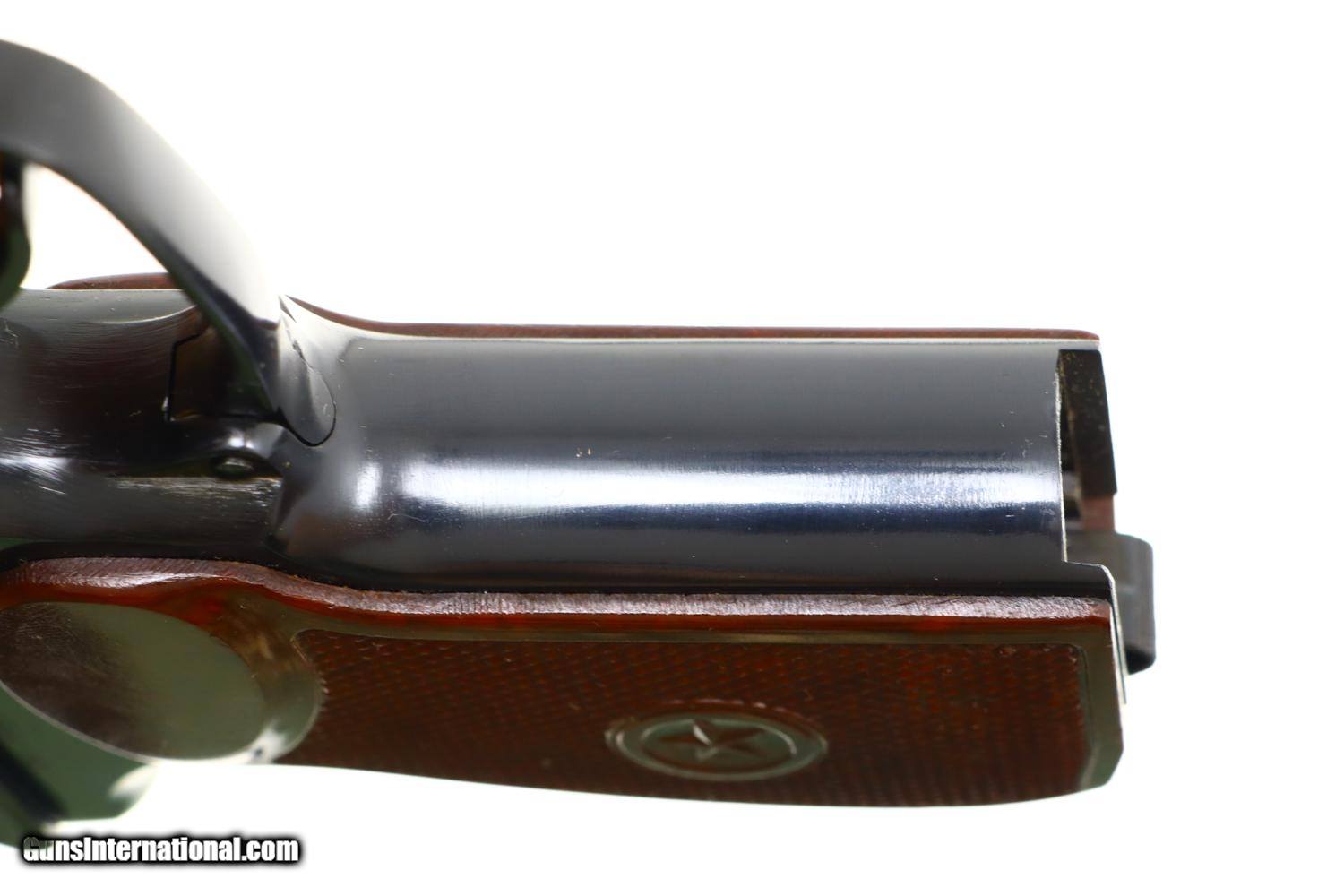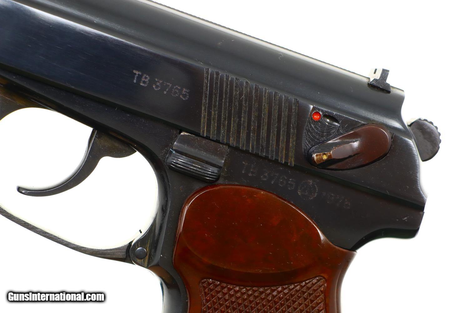 Description: Standard configuration Makarov with fixed front sight and drift adjustable rear sight. Full serial number on left side of slide and left side of frame. Izhevsk Arsenal marking on left side of frame along with manufacturing date of "1976". Standard configuration safety and Russian-style magazine. Single piece reddish maroon plastic grip with two checkered panels impressed with encircled 5 pointed star. Synopsis: Russian Izhevsk, Makarov, Military, 1976, TB3765, A-712 Condition: 99% bright original salt blue with muzzle/holster wear as imaged. Mirror bore. Perfect manual mechanics. ~~Insured shipping fee of $55; most packages shipped using FedEx 2nd Day.~~ SOLD Manufacturer: Izhevsk Serial Number: TB3765 Caliber Info: 9mm |