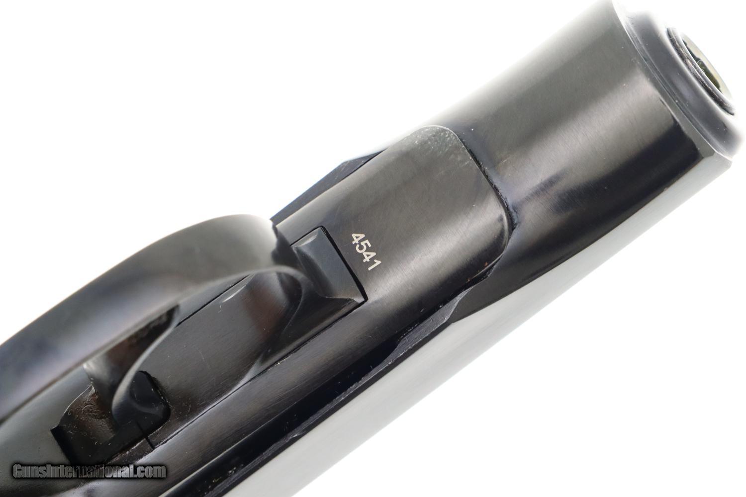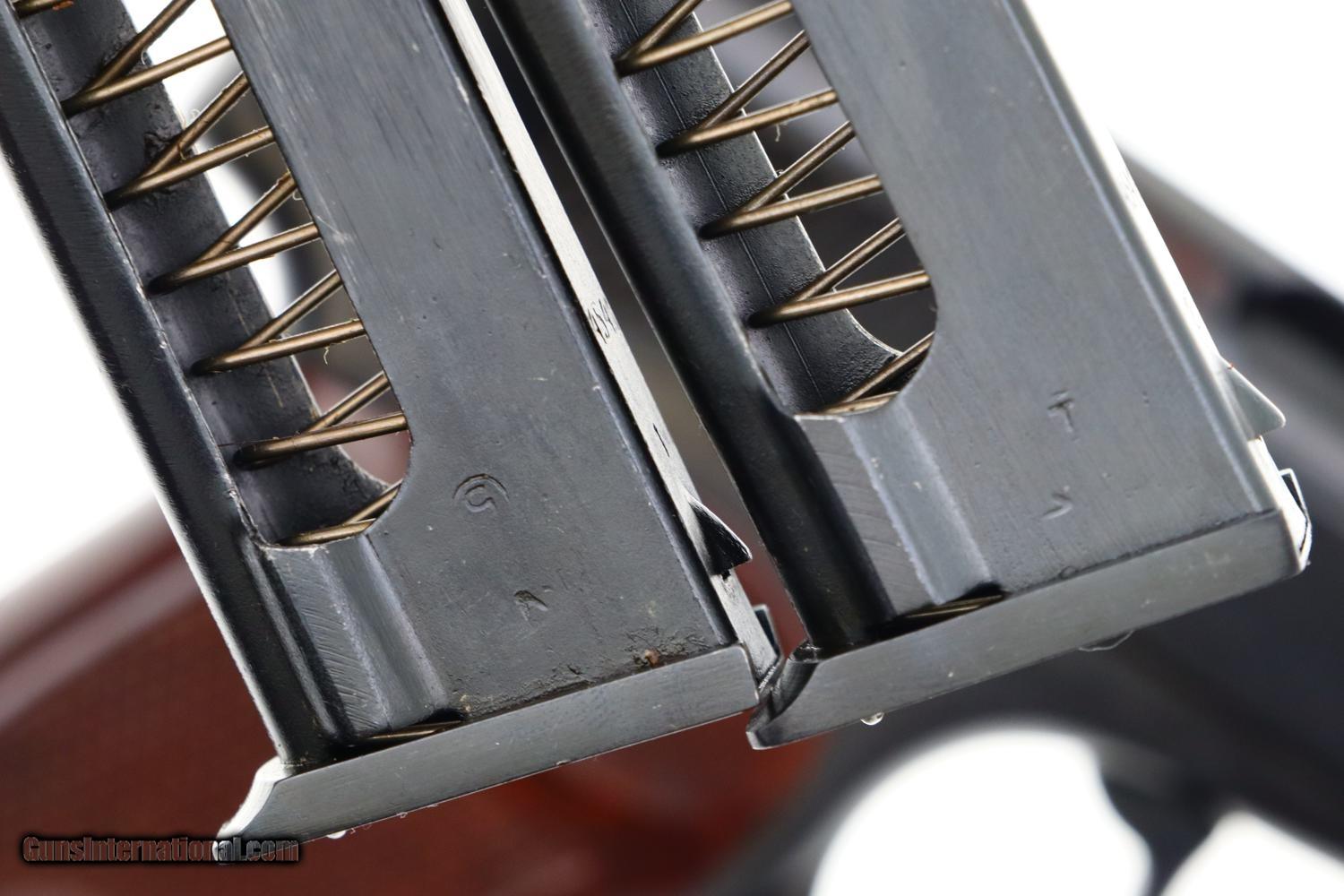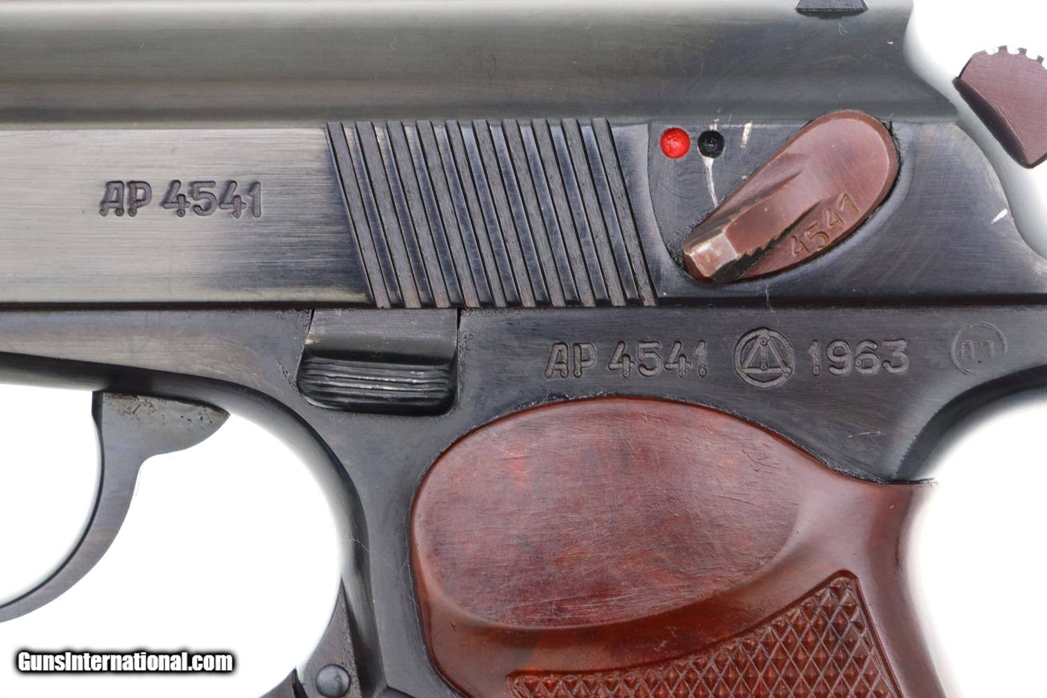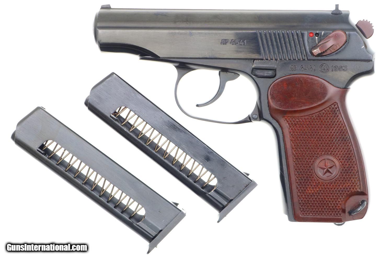 Description: Synopsis: Phenomenal Russian Izhevsk Military Makarov, Dated 1963, with two factory matching magazines and NO IMPORT MARKS. Description: Beautiful standard configuration Makarov, dated 1963, with fixed front sight and drift adjustable rear sight. Soviet Arsenal marking on left side of frame along with manufacturing date of "1963”. Standard configuration plum colored safety and two early factory matching Russian magazines. Single piece reddish maroon plastic grip with two checkered panels impressed with encircled 5 pointed star. Condition: 99% bright original salt blue with just a tiny scuff on the right side of the slide as imaged. Mirror bore with factory grease. Perfect manual mechanics with both magazines. A gorgeous and all original example with two matching magazines and NO IMPORT MARKS! ~~Insured shipping fee of $75; most packages shipped using FedEx 2nd Day.~~ SOLD Manufacturer: Izhevsk Serial Number: 4541 Caliber Info: 9mm |