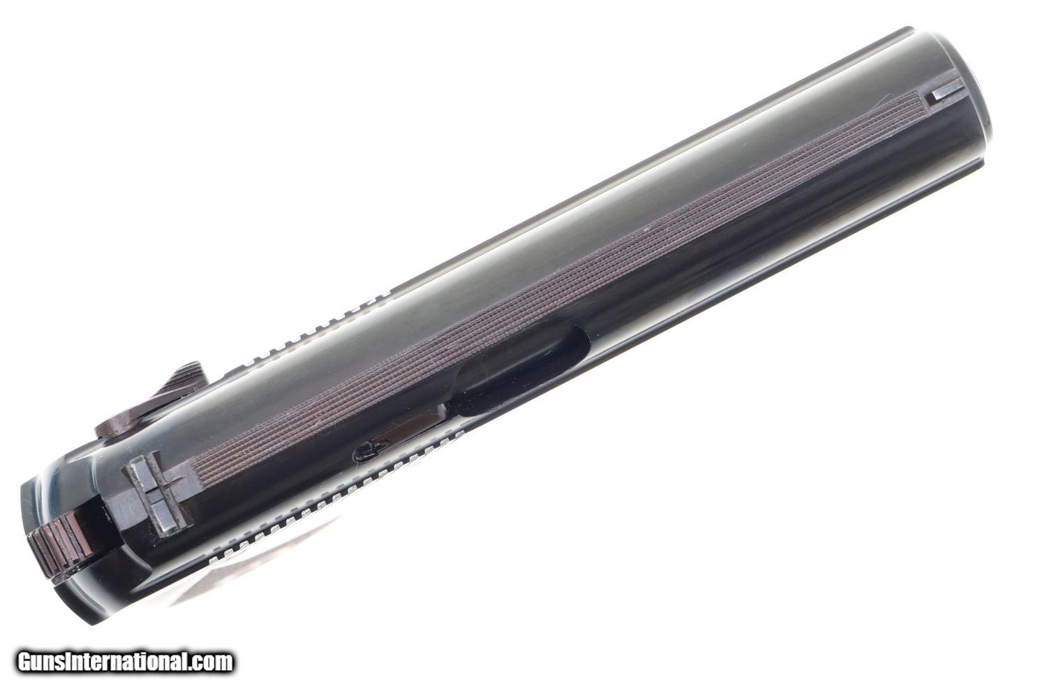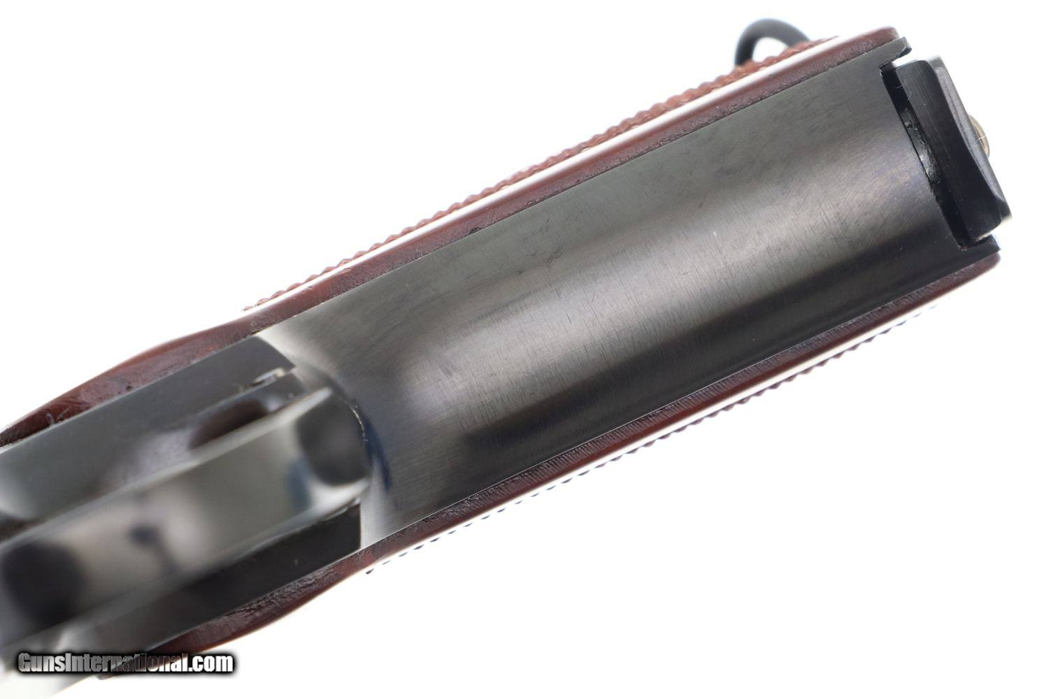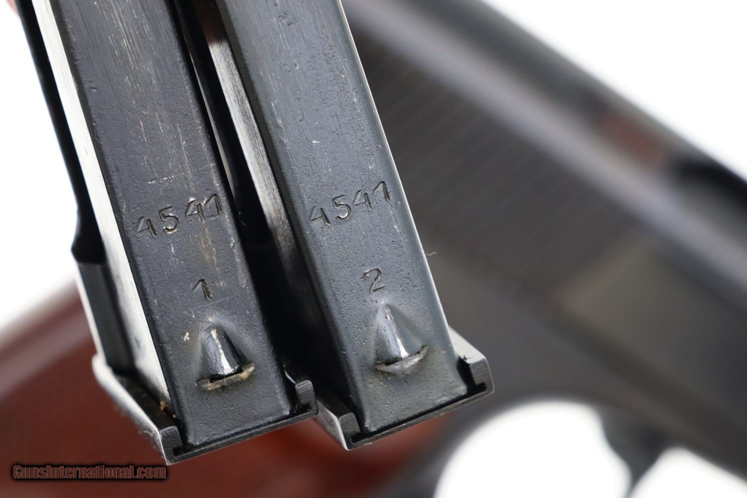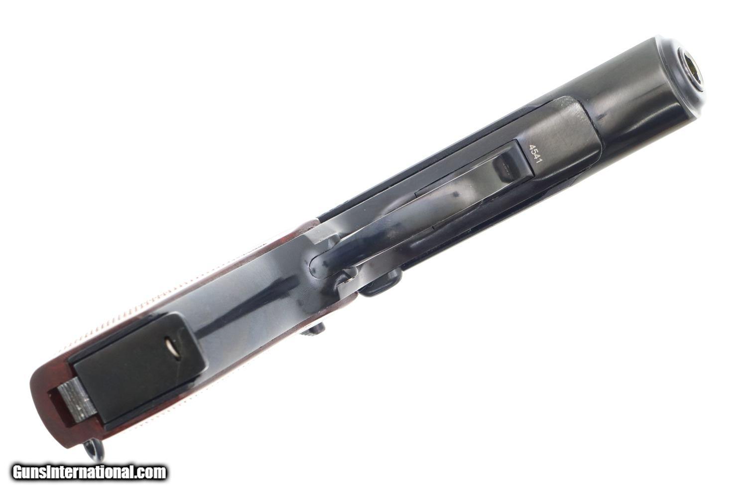 Description: Synopsis: Phenomenal Russian Izhevsk Military Makarov, Dated 1963, with two factory matching magazines and NO IMPORT MARKS. Description: Beautiful standard configuration Makarov, dated 1963, with fixed front sight and drift adjustable rear sight. Soviet Arsenal marking on left side of frame along with manufacturing date of "1963”. Standard configuration plum colored safety and two early factory matching Russian magazines. Single piece reddish maroon plastic grip with two checkered panels impressed with encircled 5 pointed star. Condition: 99% bright original salt blue with just a tiny scuff on the right side of the slide as imaged. Mirror bore with factory grease. Perfect manual mechanics with both magazines. A gorgeous and all original example with two matching magazines and NO IMPORT MARKS! ~~Insured shipping fee of $75; most packages shipped using FedEx 2nd Day.~~ SOLD Manufacturer: Izhevsk Serial Number: 4541 Caliber Info: 9mm |